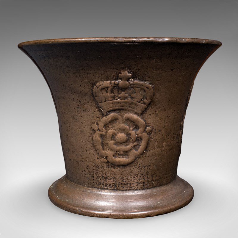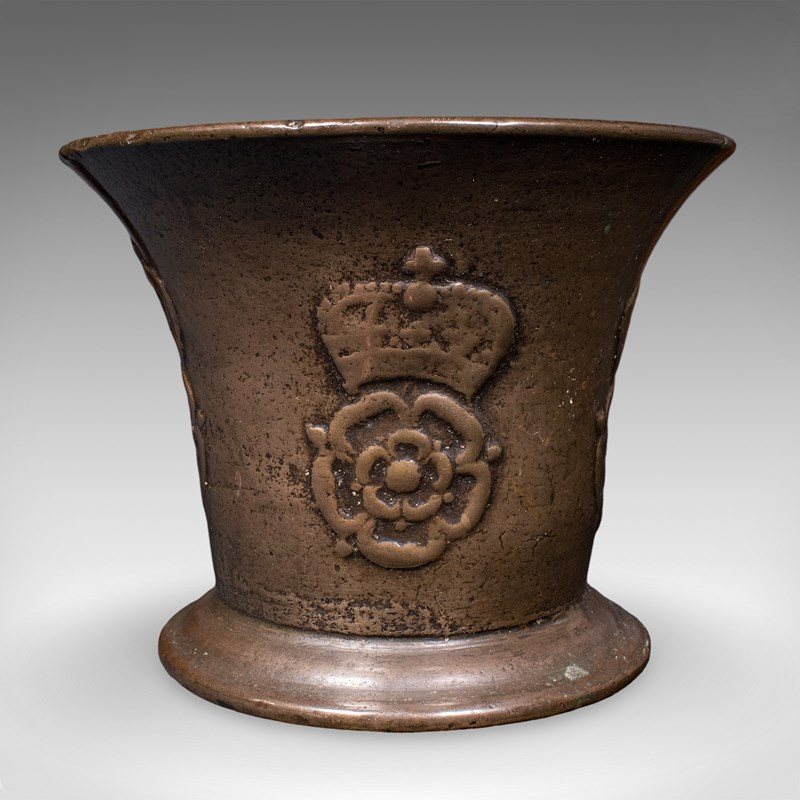 This is an antique apothecary mortar and pestle. An English, bronze kitchen or chemist's instrument with Tudor Rose motif, dating to the mid 17th century, circa 1650.