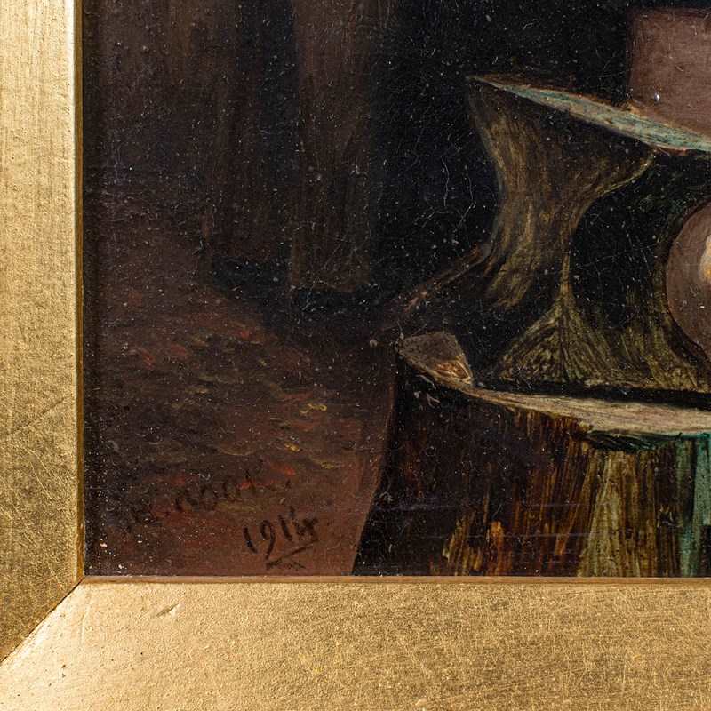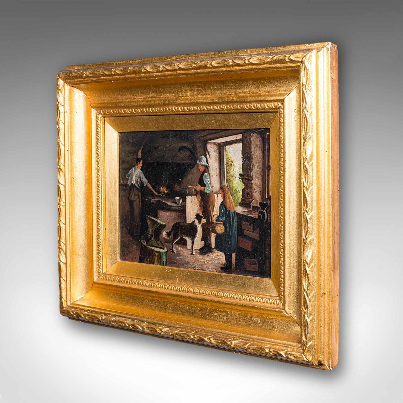 This is an antique blacksmith's cottage painting. An English, gilt framed oil on canvas picture, dating to the early 20th century, circa 1914.