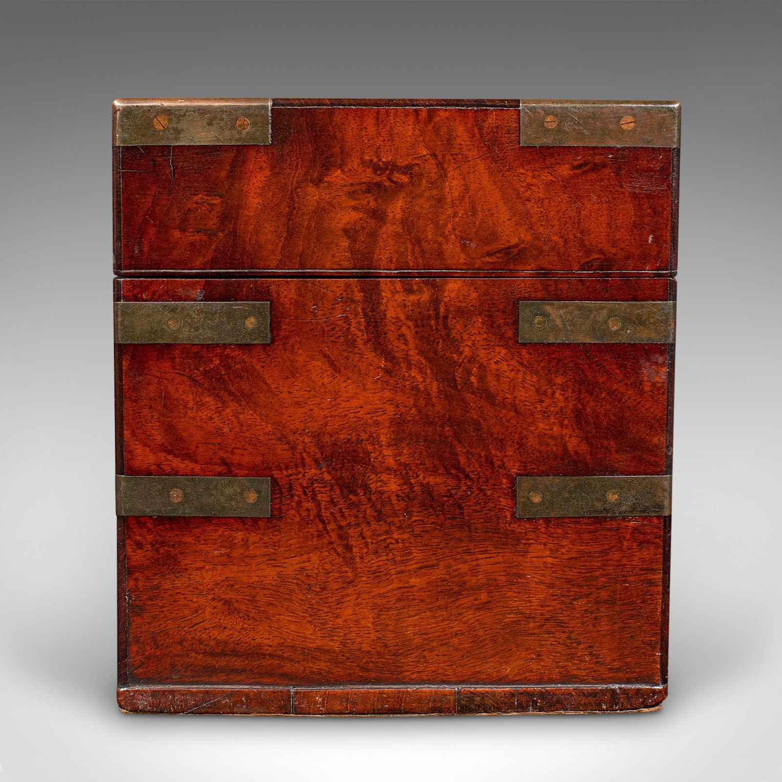 This is an antique campaign apothecary box. An English, flame mahogany chemist's case, dating to the Georgian period, circa 1780. A superb and evocative example of 18th century portable medical storage, with fine quality materials and construction throughout.