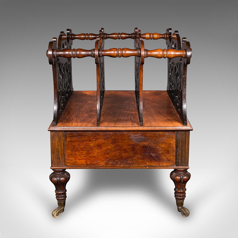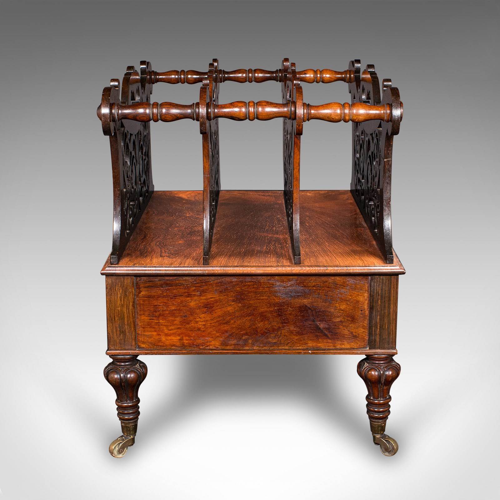 This is an antique Canterbury. An English, rosewood three division magazine rack, dating to the William IV period, circa 1835. A visually striking example of fine craftsmanship, displaying excellent proportion and decorative finesse.