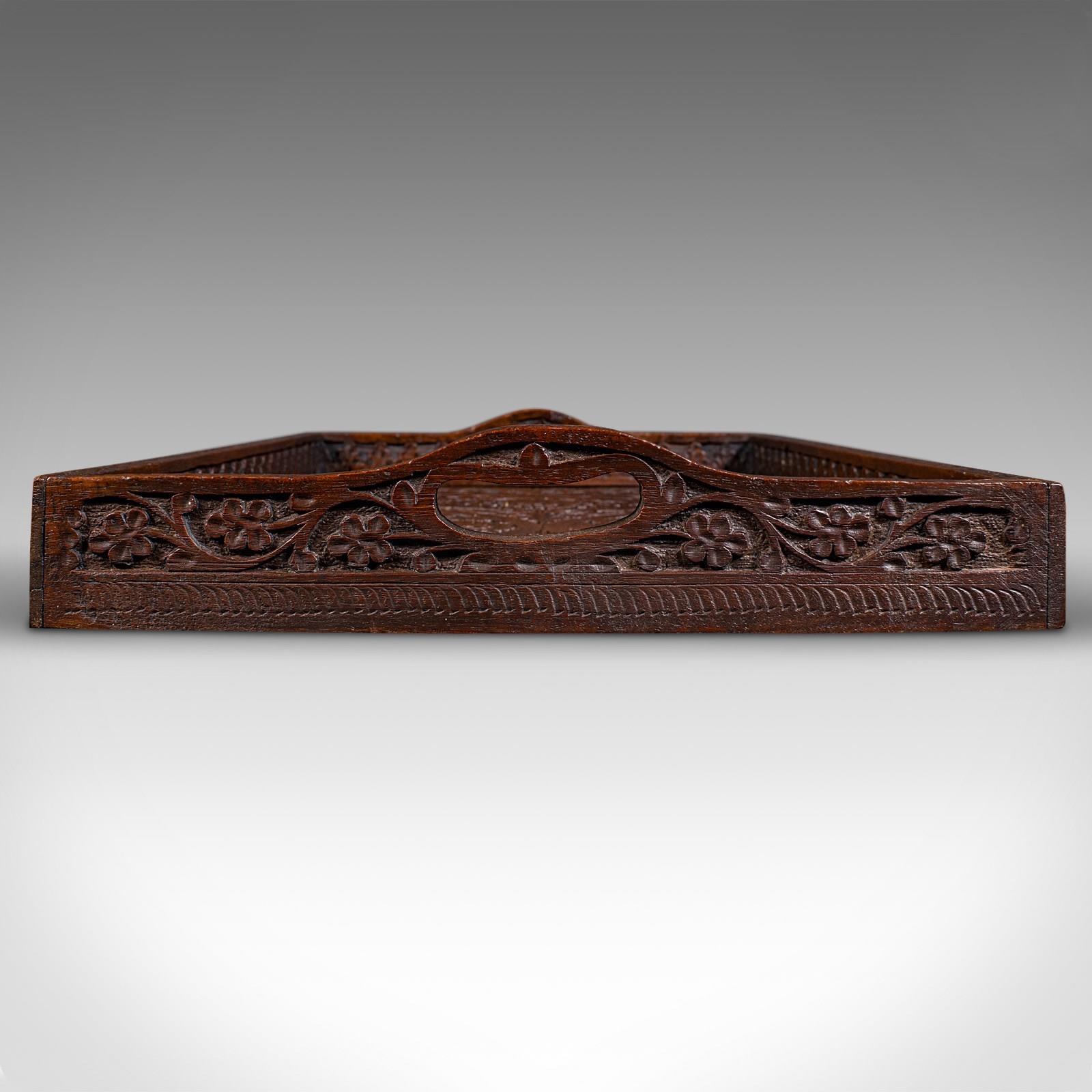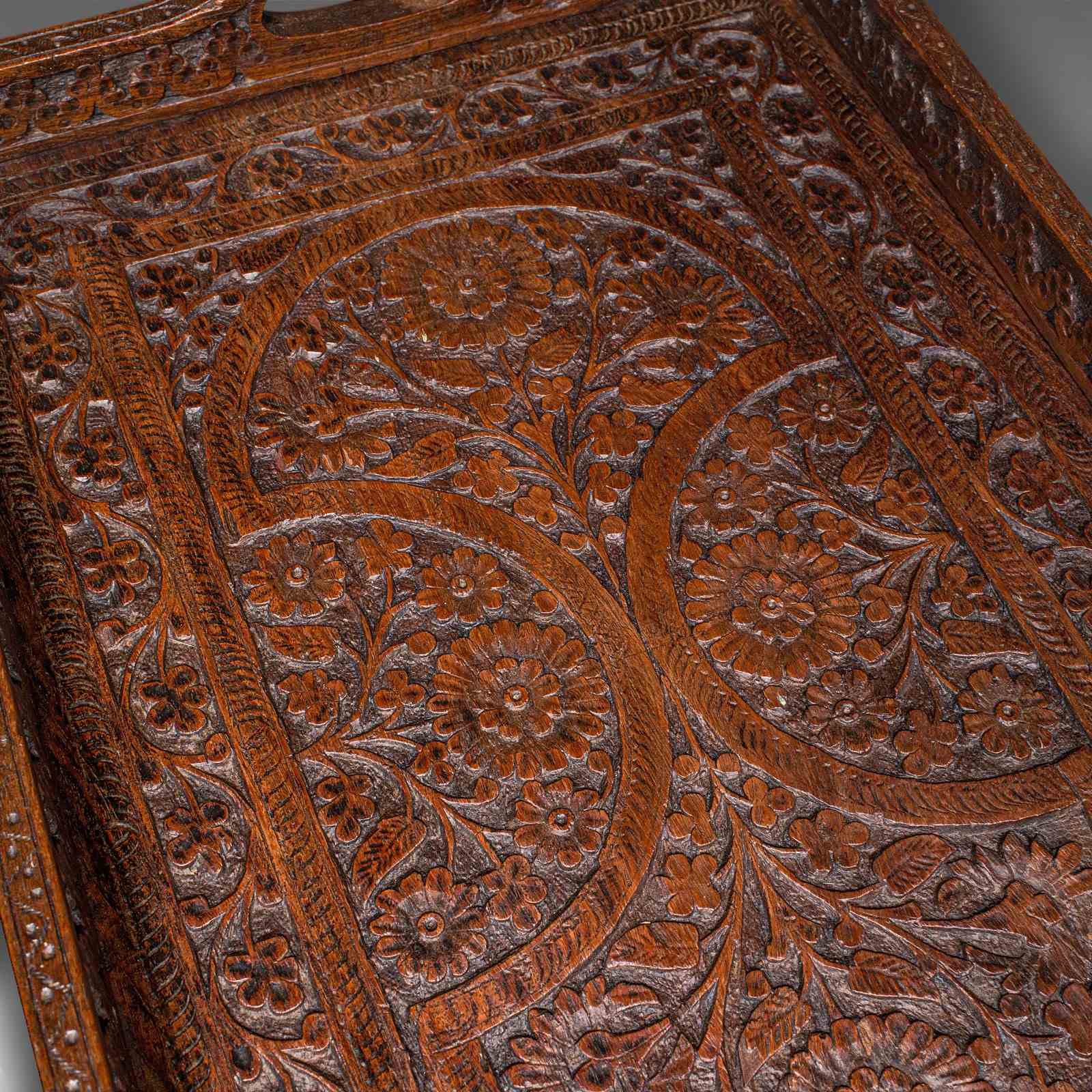 This is an antique carved serving tray. An Anglo-Indian, teak afternoon tea or cocktail platter, with delightful colonial taste, dating to the late Victorian period, circa 1900. A fine display of craftsmanship with rich colour and ornate detail.