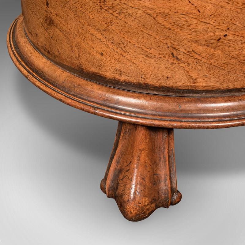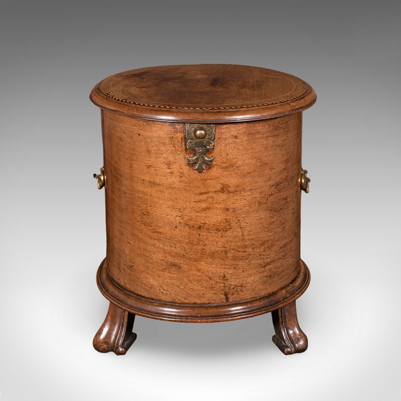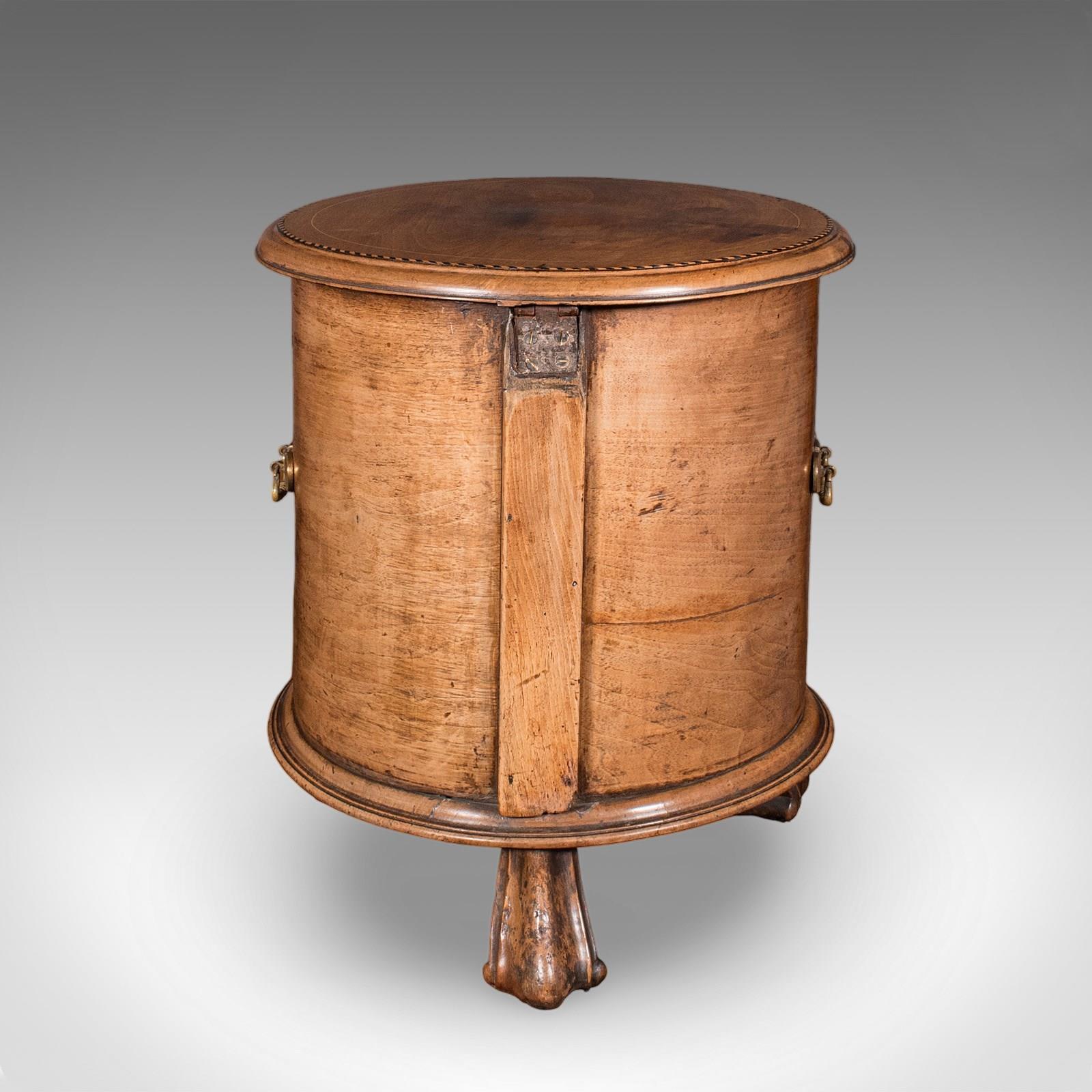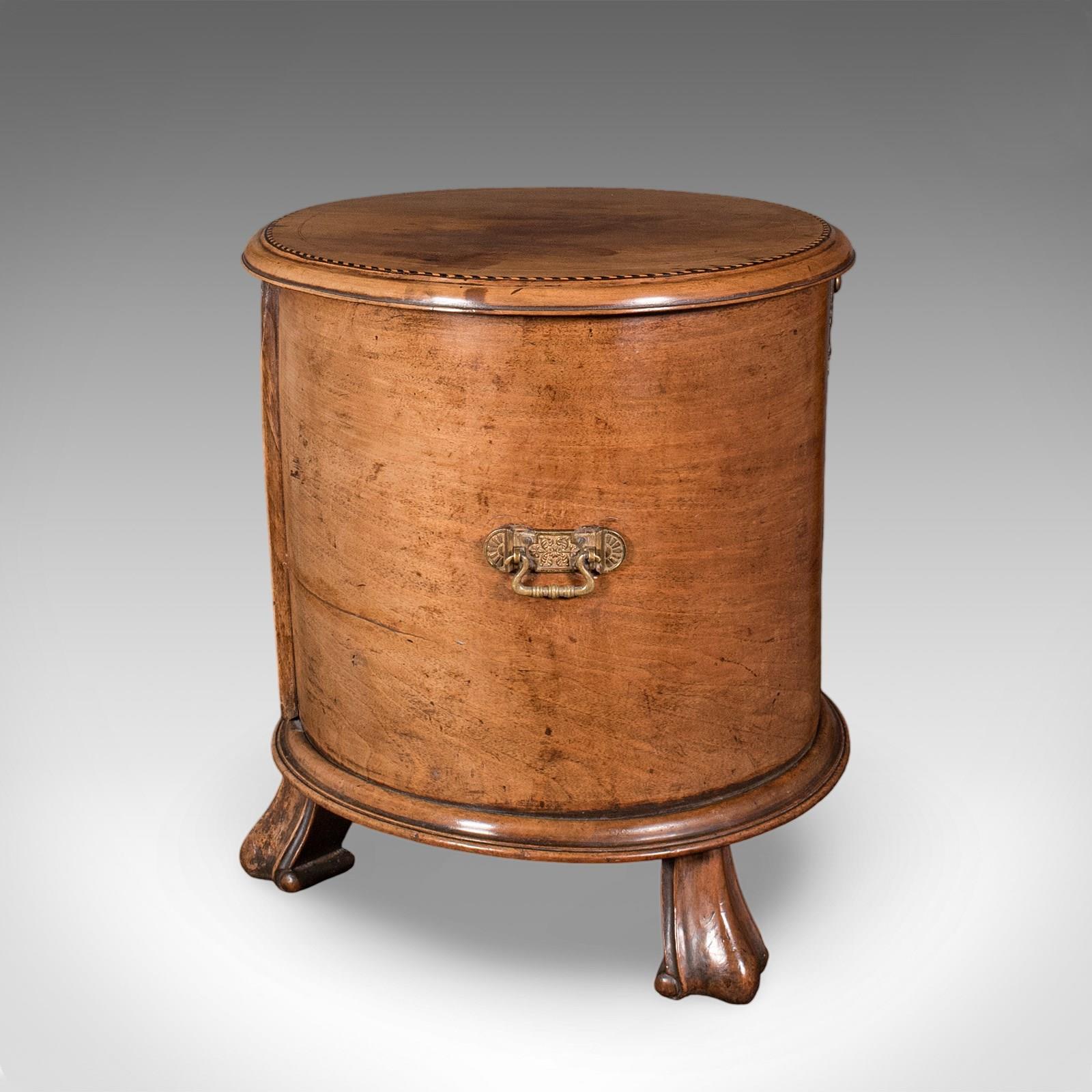 This is an antique cellarette. An English, golden walnut circular wine cooler stand or side table, dating to the Regency period, circa 1820. A beautifully presented and versatile piece, combining elegant form with practical bottle storage.