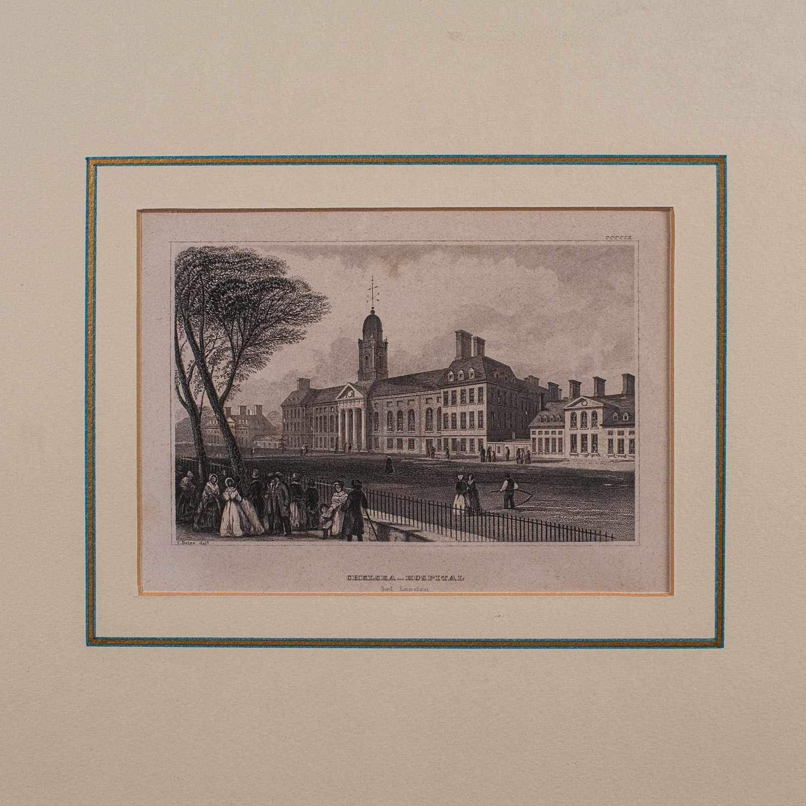 Charming period engraving depicting Chelsea Hospital, London