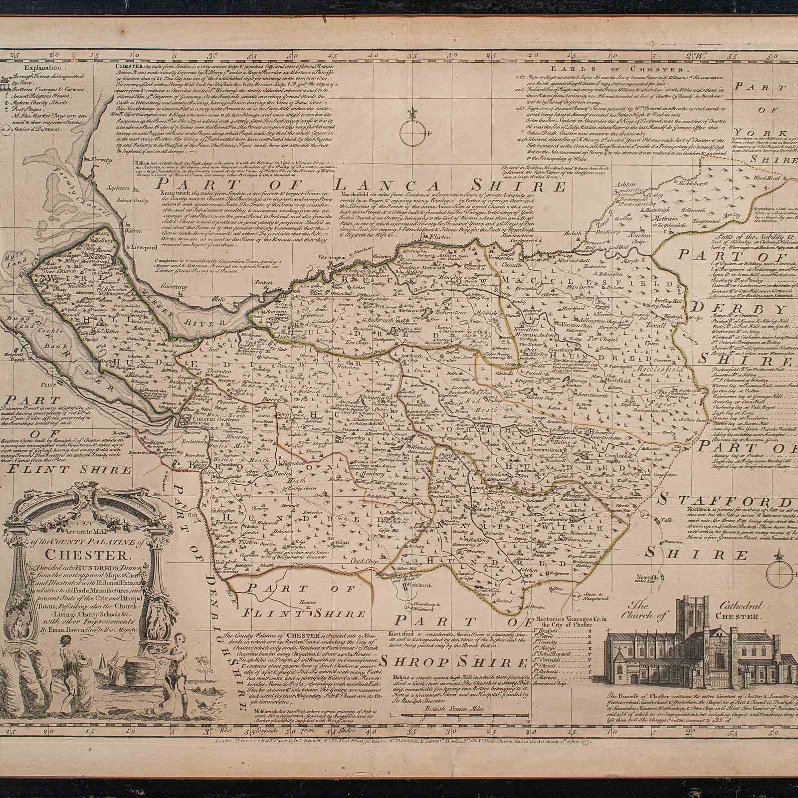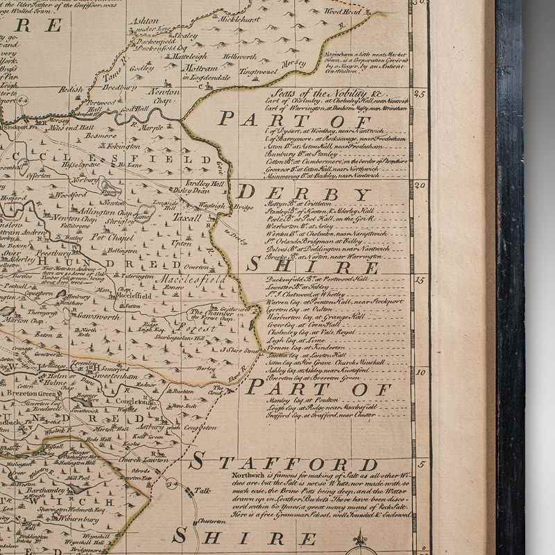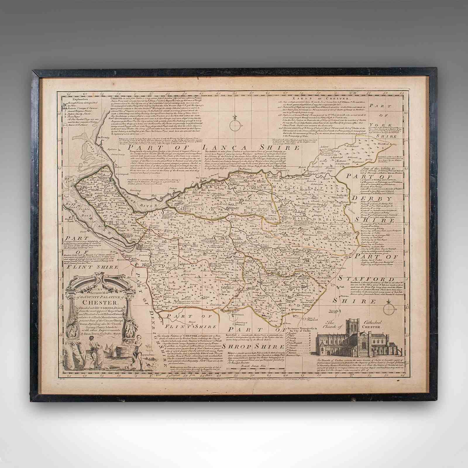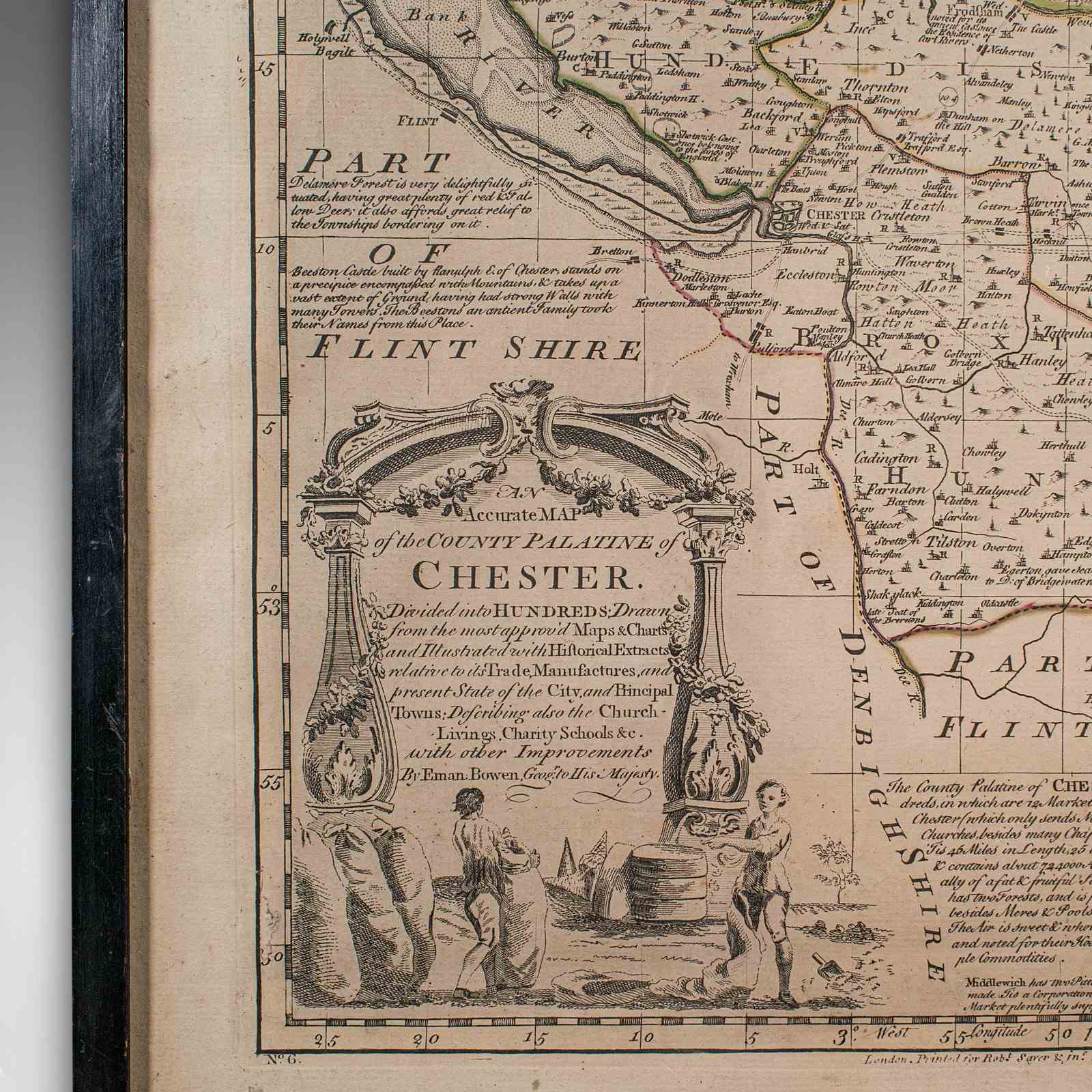 This is an antique Palantine of Chester county map. An English, framed atlas engraving of Cheshire by Emanuel Bowen, dating to the 18th century and later, circa 1770.