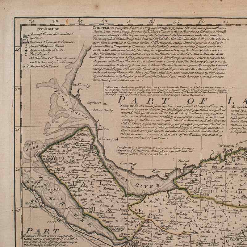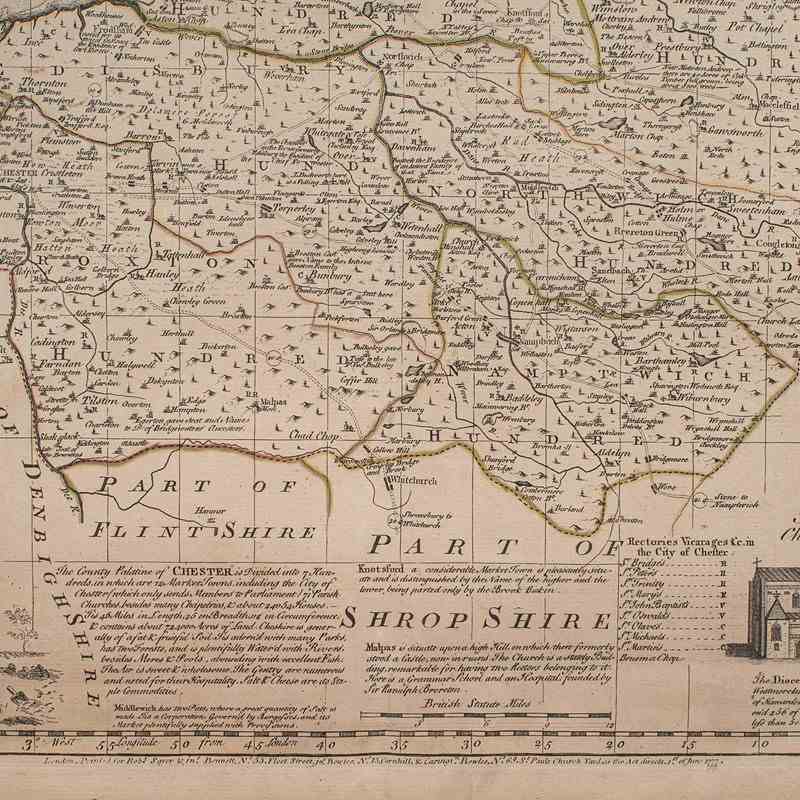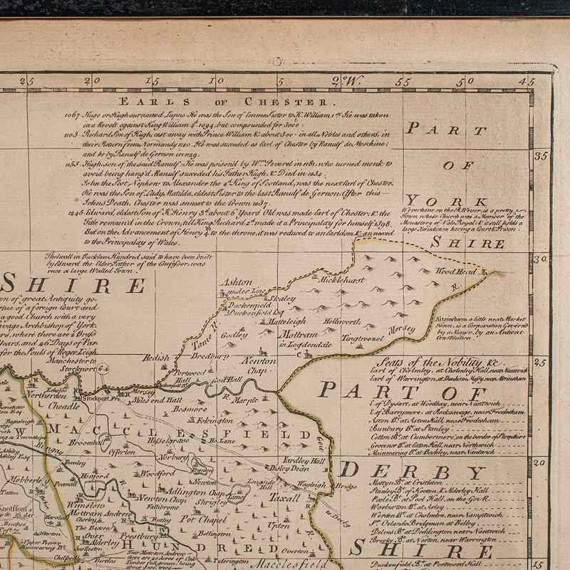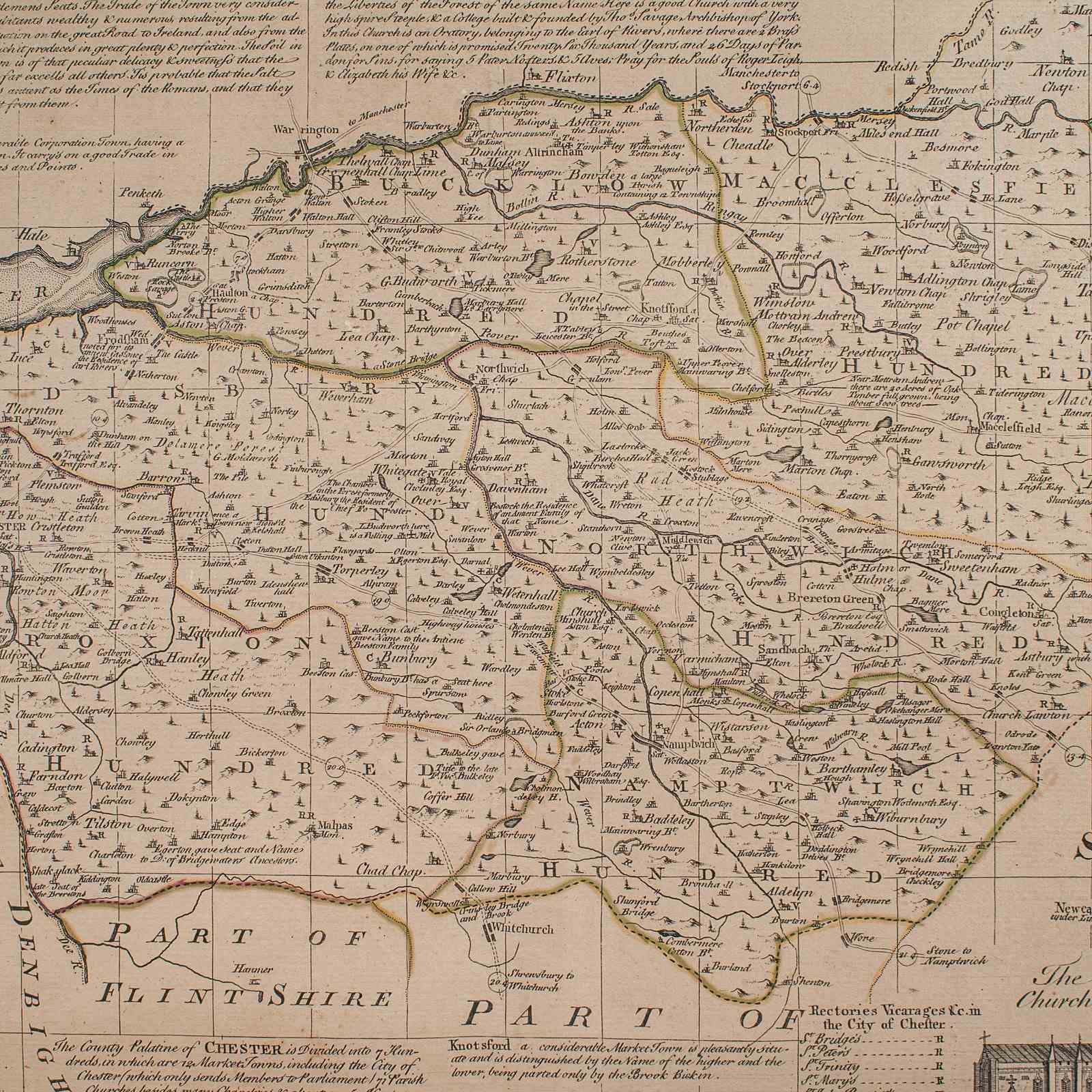 This is an antique Palantine of Chester county map. An English, framed atlas engraving of Cheshire by Emanuel Bowen, dating to the 18th century and later, circa 1770.
