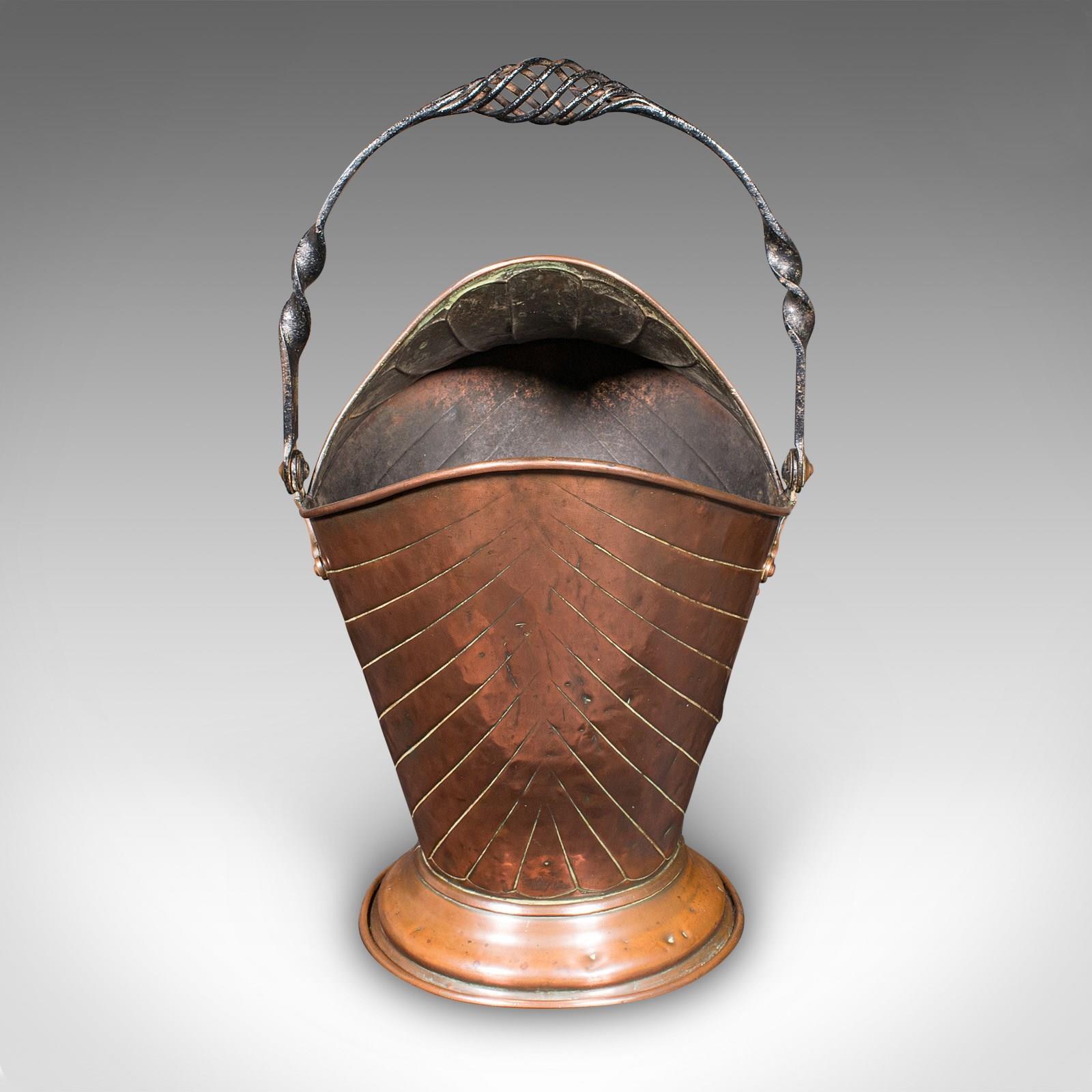 This is an antique coal scuttle. An English, copper and wrought iron fireside fuel basket in Art Nouveau taste, dating to the late Victorian period, circa 1900. A delightfully decorative example, ideal for complementing the most elegant of fireplaces.