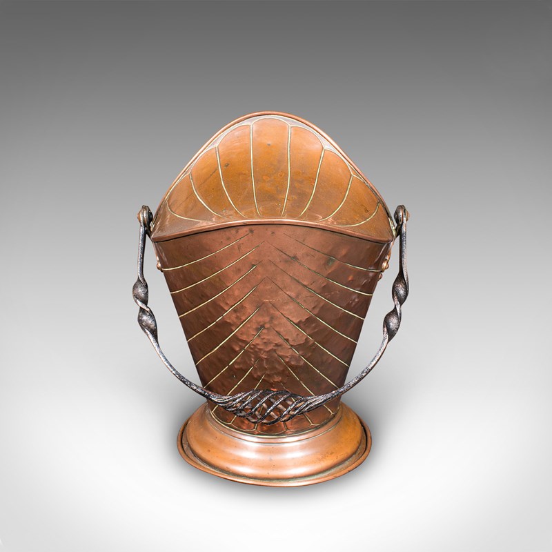 Antique Coal Scuttle, English, Copper, Fireside Basket, Art Nouveau, Victorian