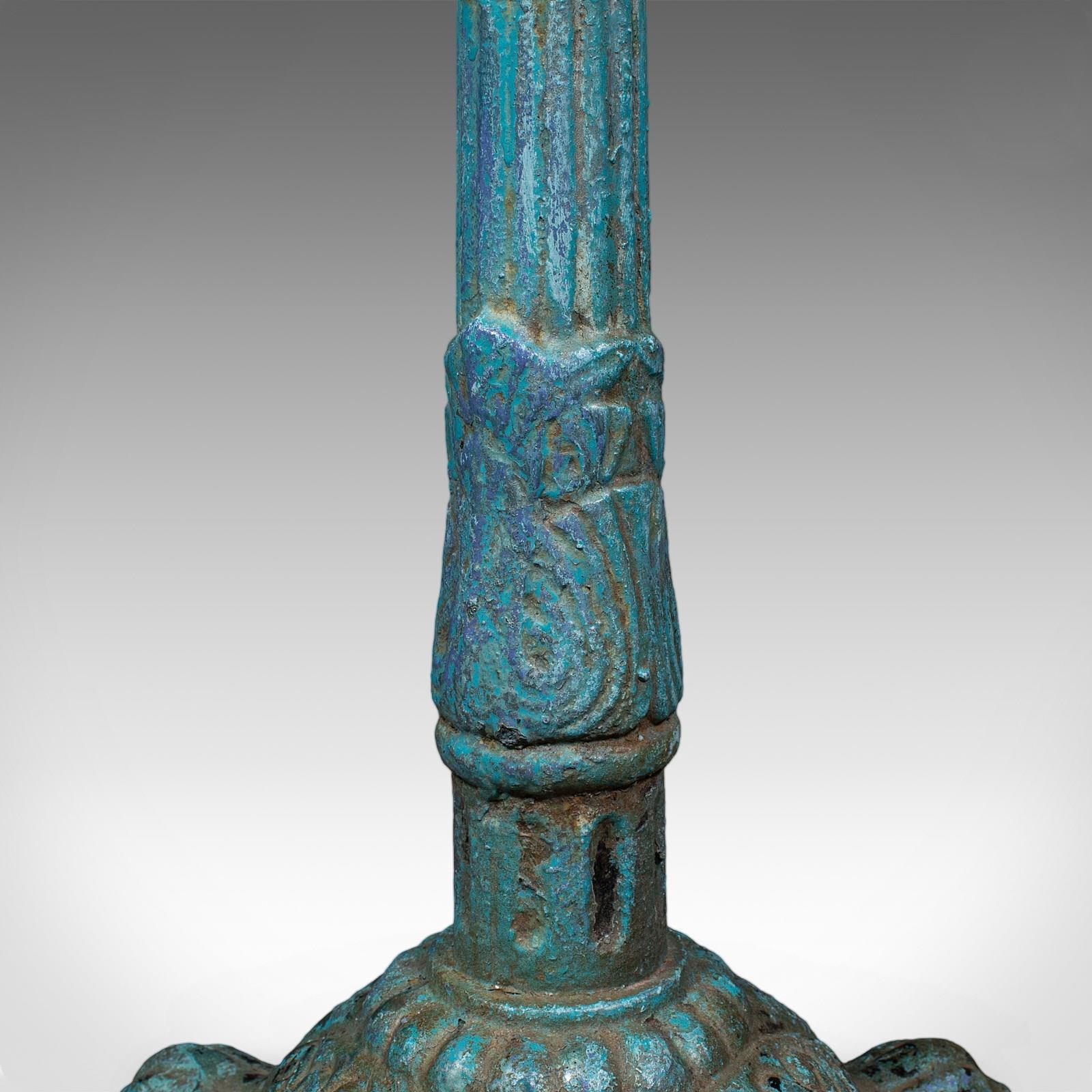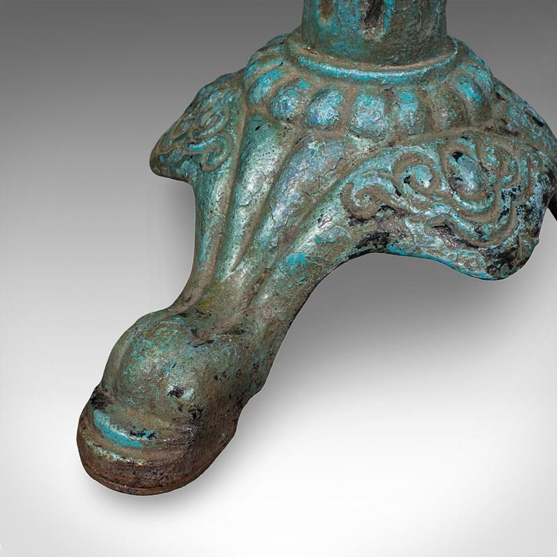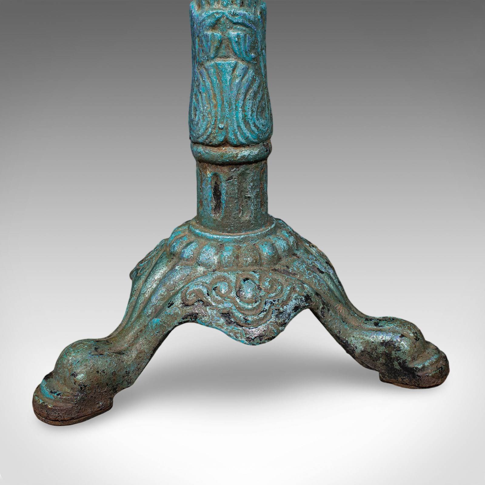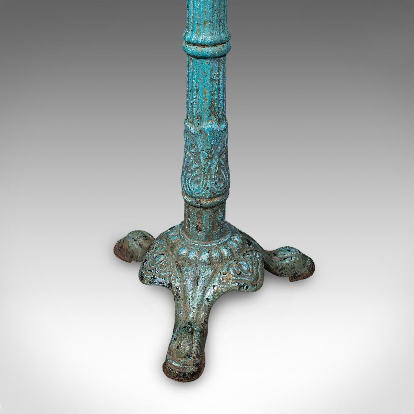 This is an antique conservatory table. An English, Alabaster marble and cast iron portico or veranda tea table, dating to the Regency period, circa 1820.
