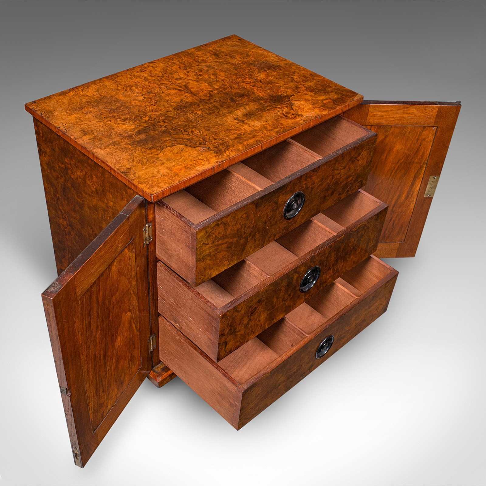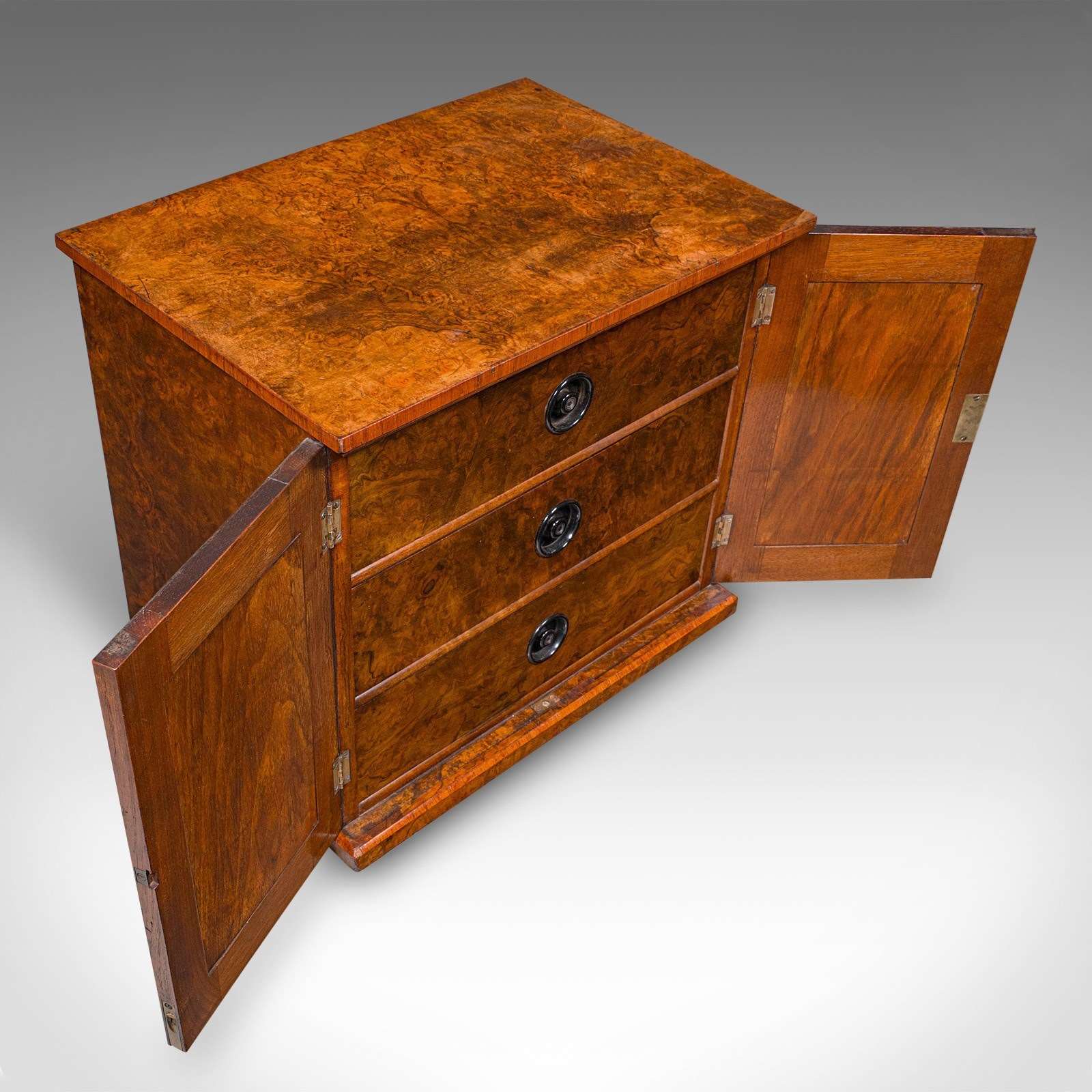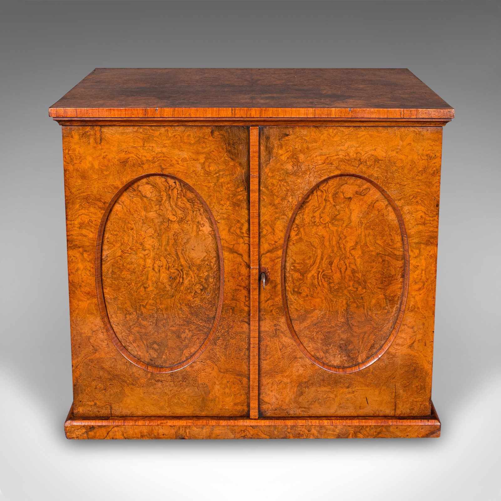 This is an antique country house napkin drawer cabinet. An English, burr walnut dining room storage chest, dating to the early Victorian period, circa 1850. A superb example of fine cabinetmaking, combining elegant form with exceptional practicality for the refined dining hall.