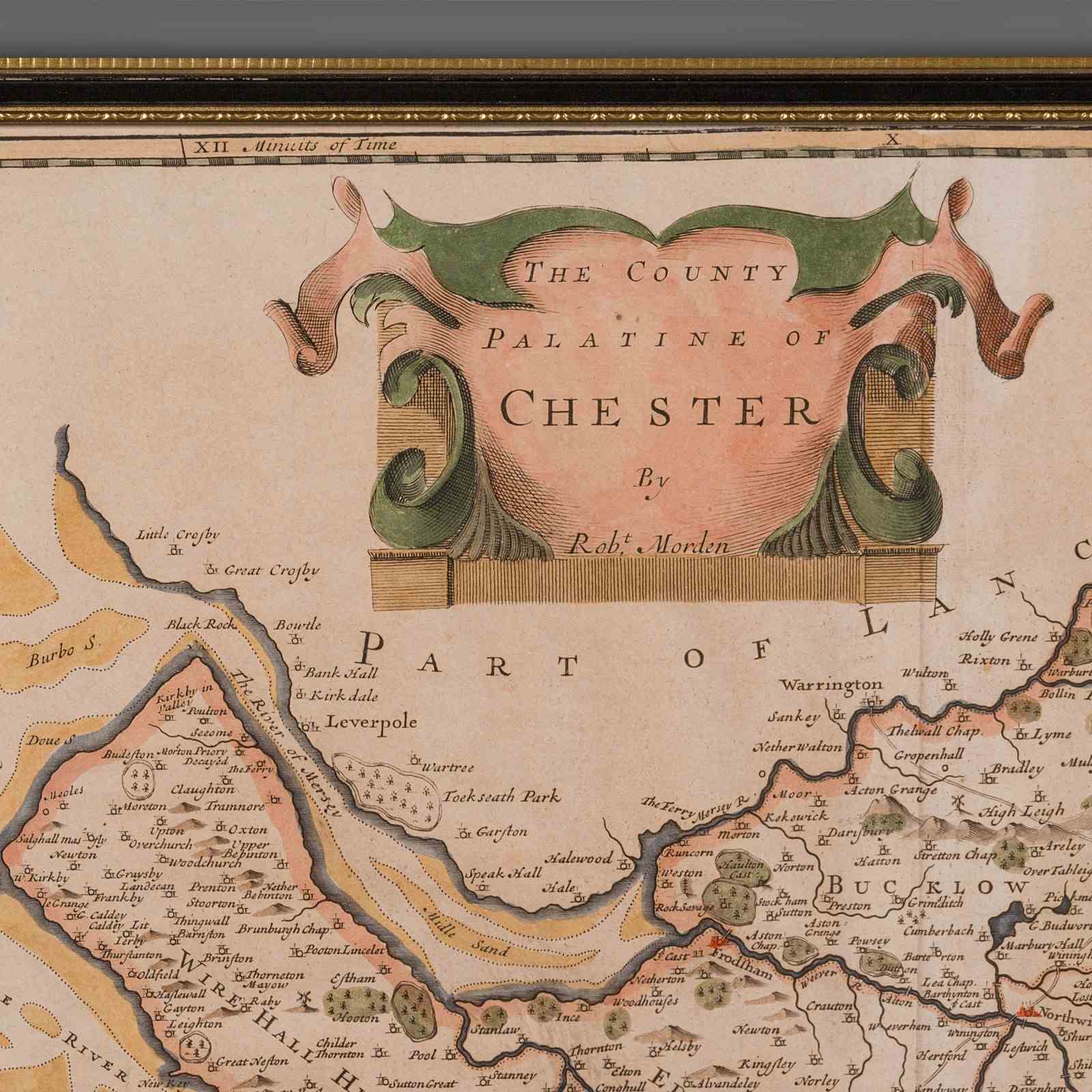 This is an antique county map of Cheshire, an English framed cartographic engraving by Robert Morden, dating to the early Georgian period, circa 1720. A charming and historically rich representation of the county, this Victorian period hand-coloured engraving captures the elegance of early 18th century mapmaking.
