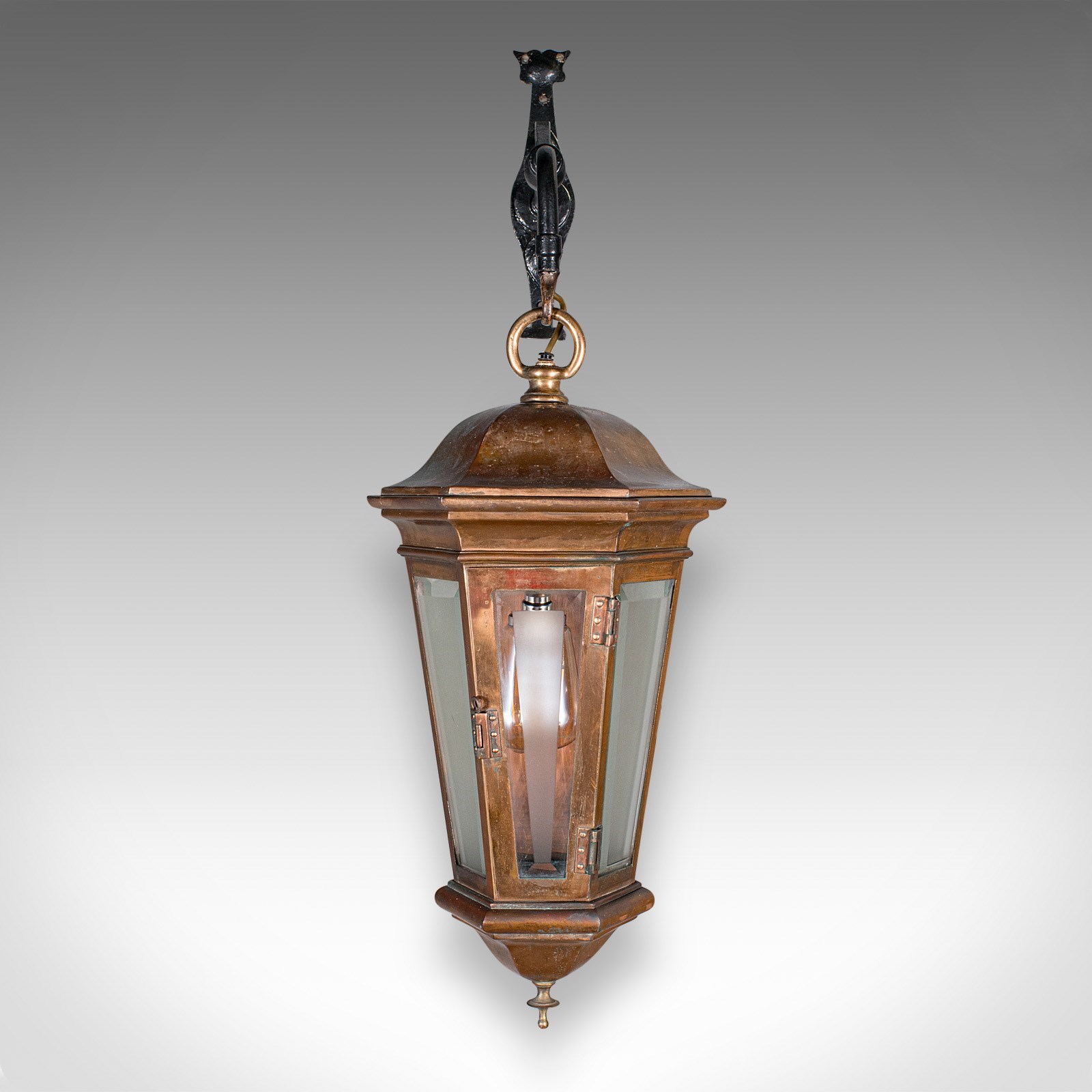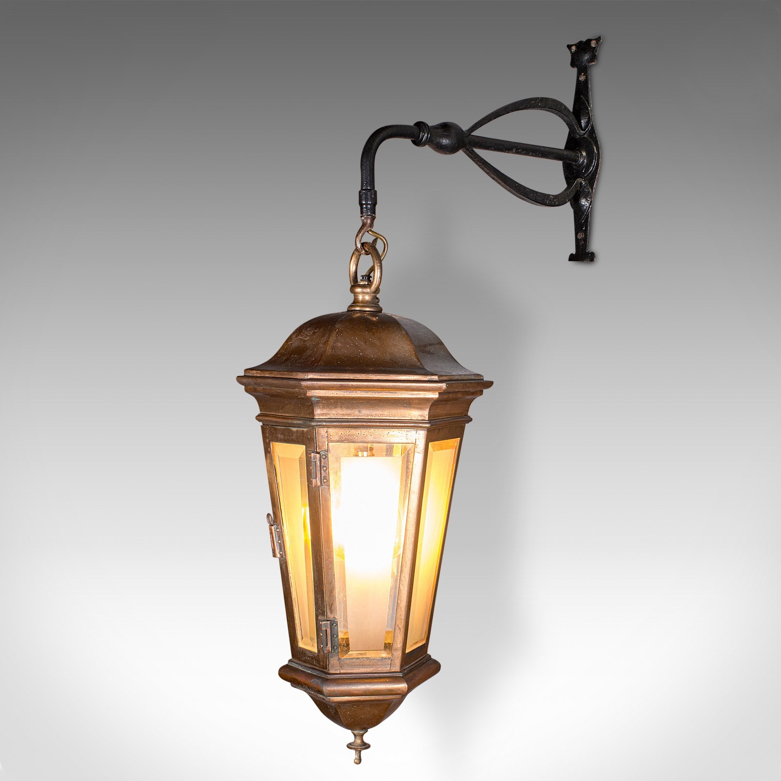 Suspended upon a quality wrought iron bracket, perfect for wall mounting in entranceways or courtyards