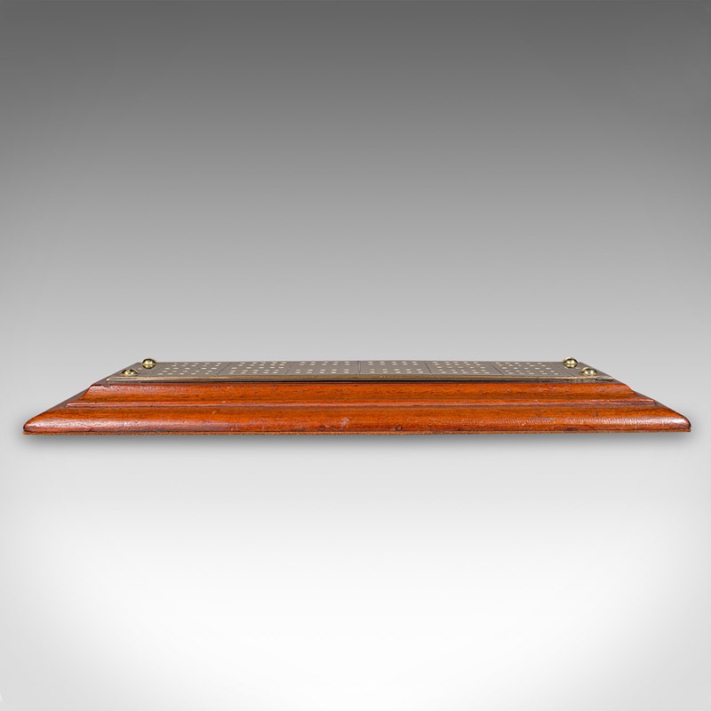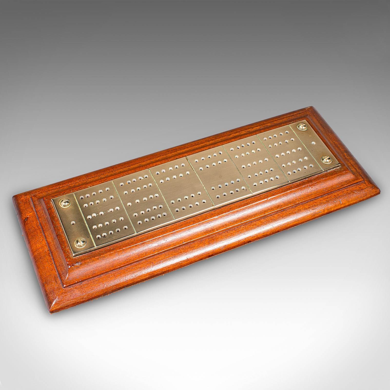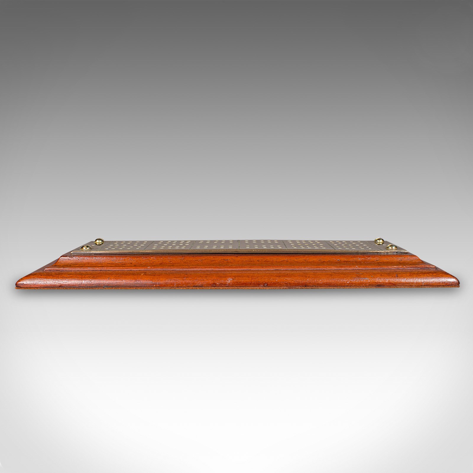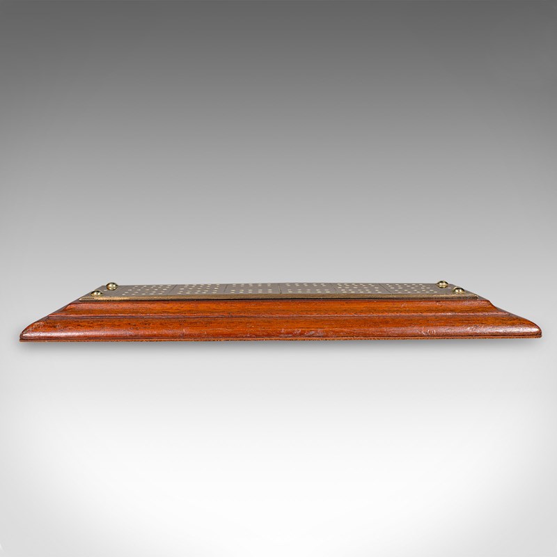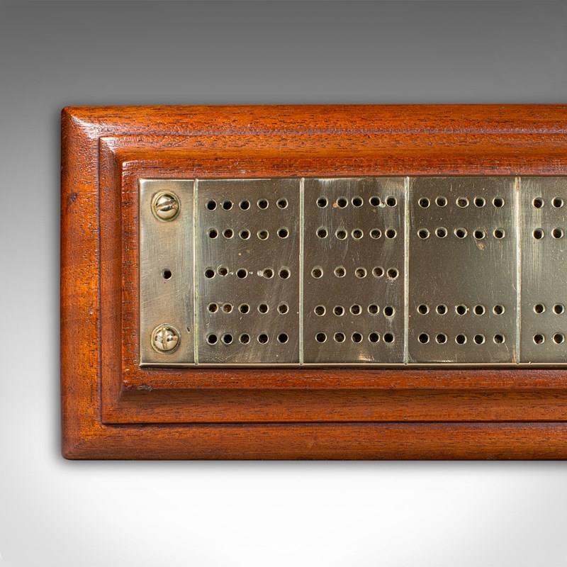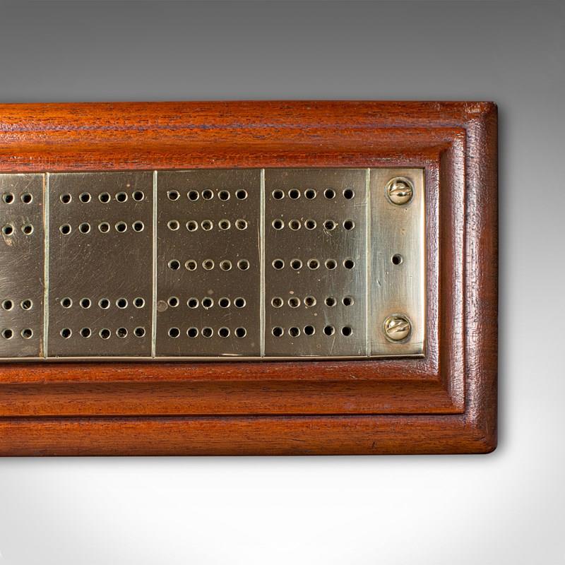 This is an antique Cribbage board. An English, mahogany and brass gaming peg base, dating to the late Victorian period, circa 1900. Wonderfully presented, it offers superb warmth of tone and enduring appeal for gaming enthusiasts and collectors alike.