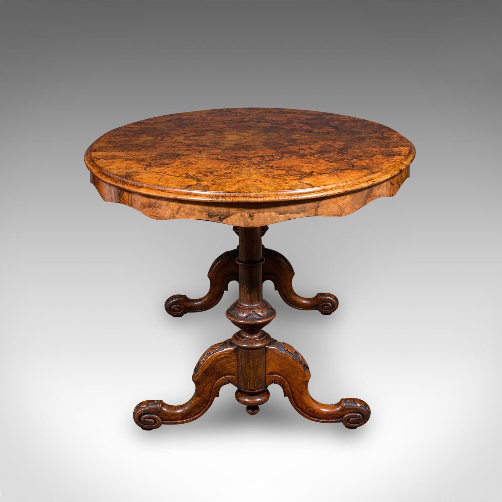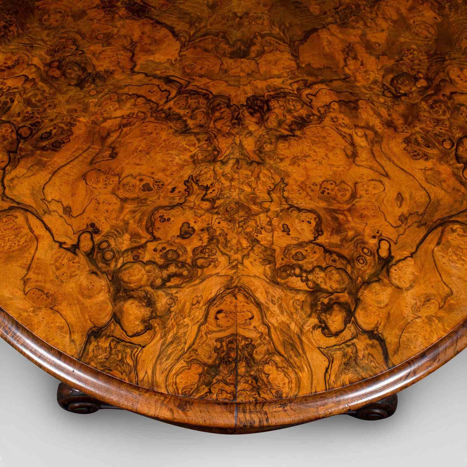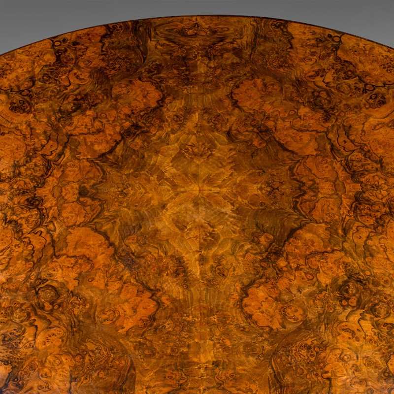 This is a superb antique display or centre table, distinguished by its beautiful burr walnut top and ornate craftsmanship. Solid joints and construction, delivered ready for the home.