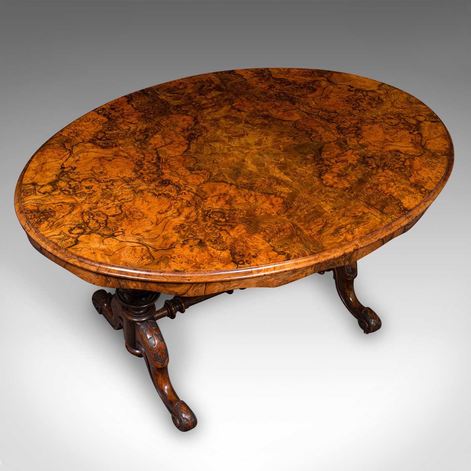 Antique Display Table, English, Burr Walnut, 4 Seat, Oval, Centre, Victorian