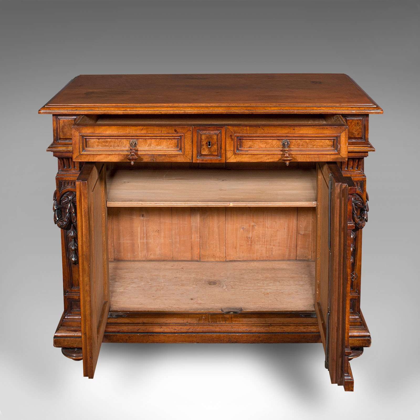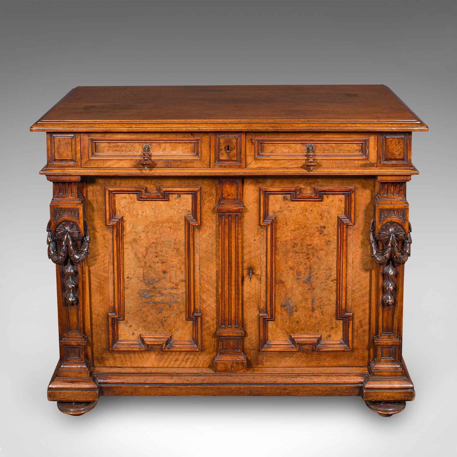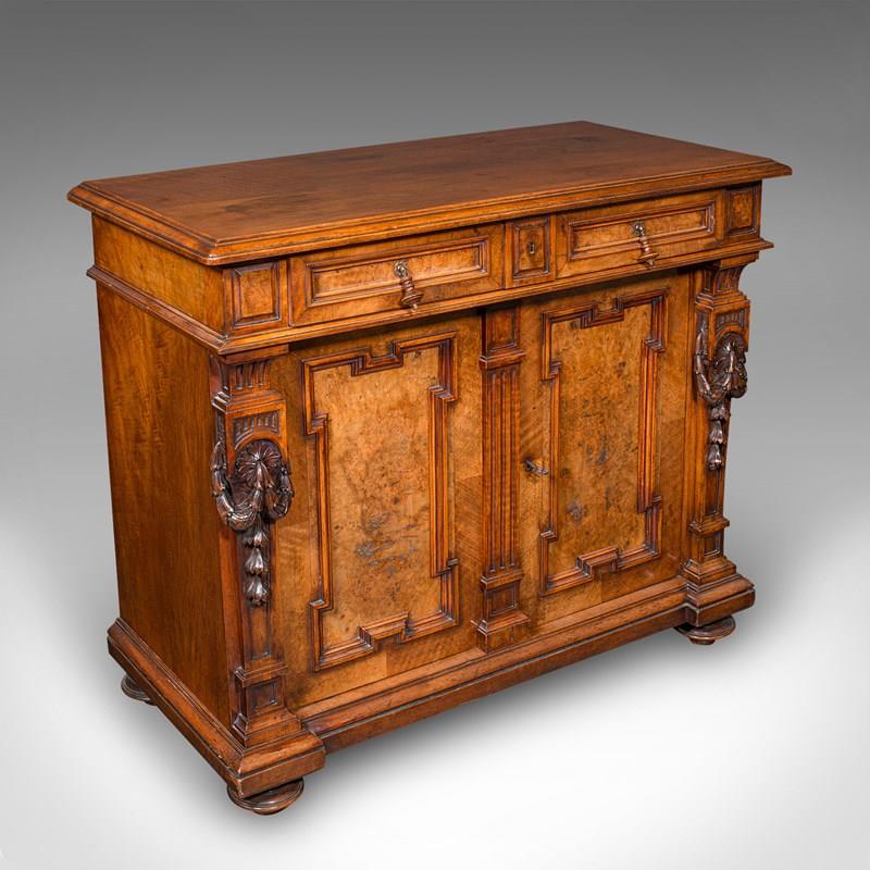 This is an antique drawing room cabinet. A French, burr walnut and chestnut buffet in Neoclassical taste, dating to the Victorian period, circa 1850.