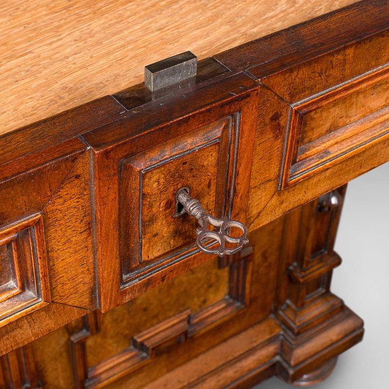 Opens with fascinating turned pendant drop handles set upon brass backplates
