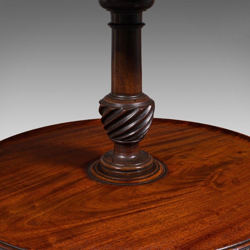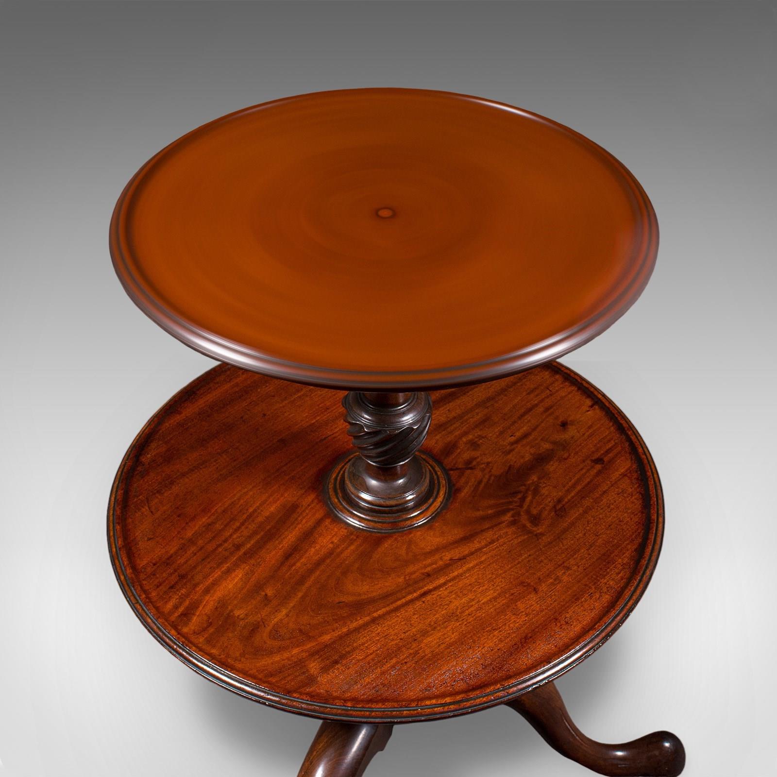 This is an antique dumb waiter. An English, mahogany two tier afternoon tea serving or jardiniere stand, dating to the Regency period, circa 1820.