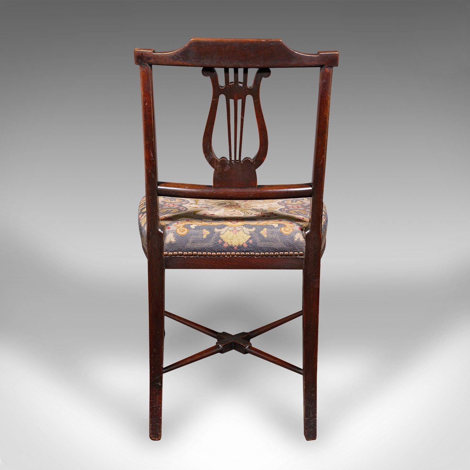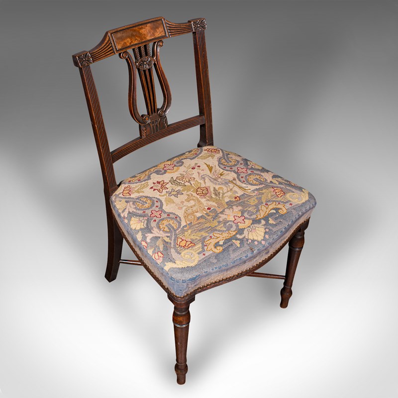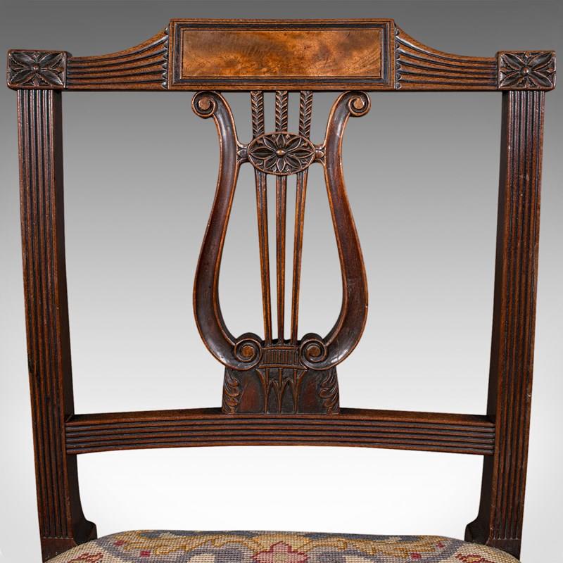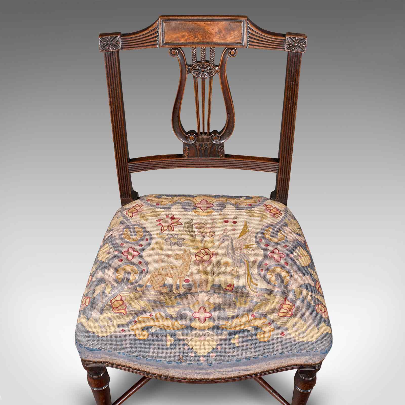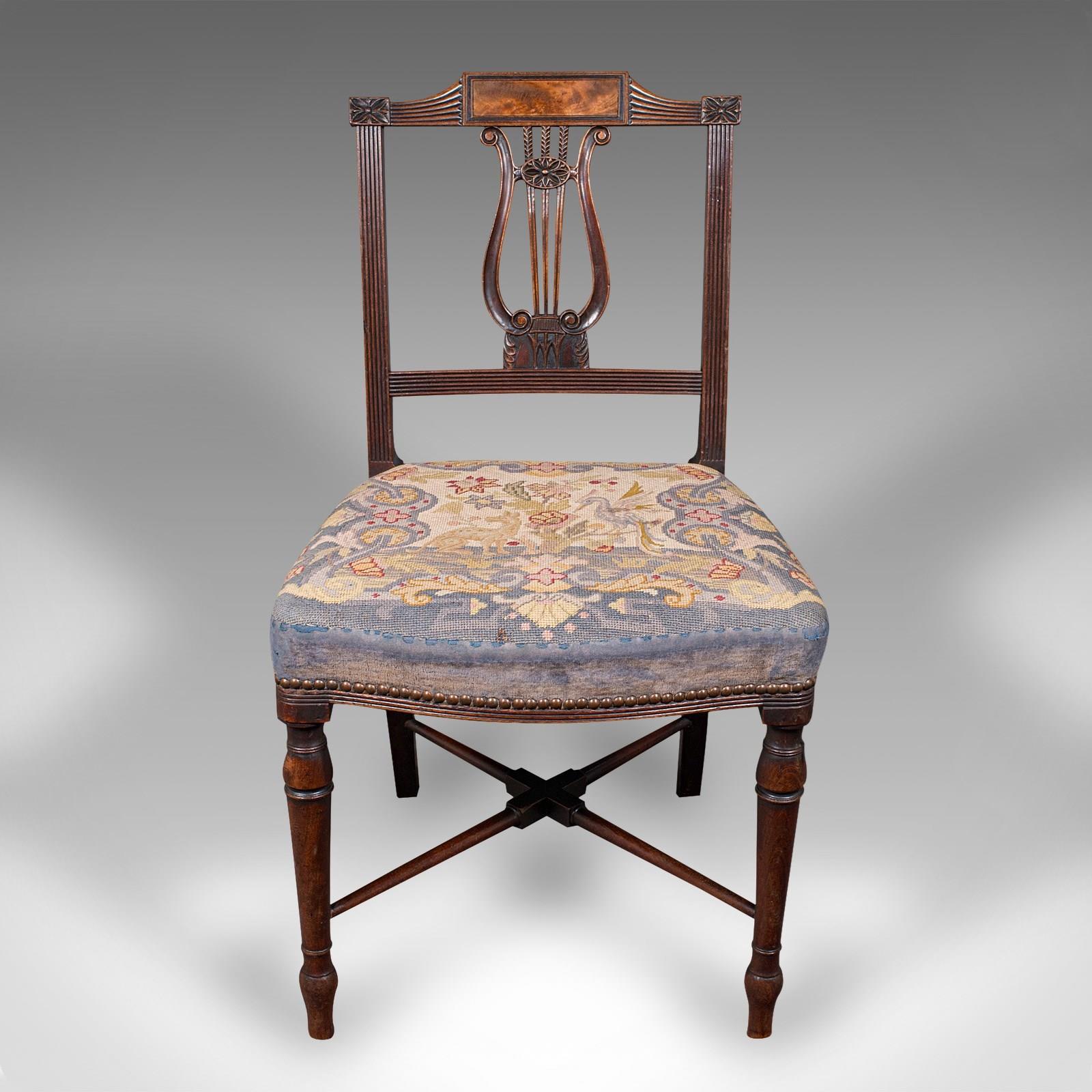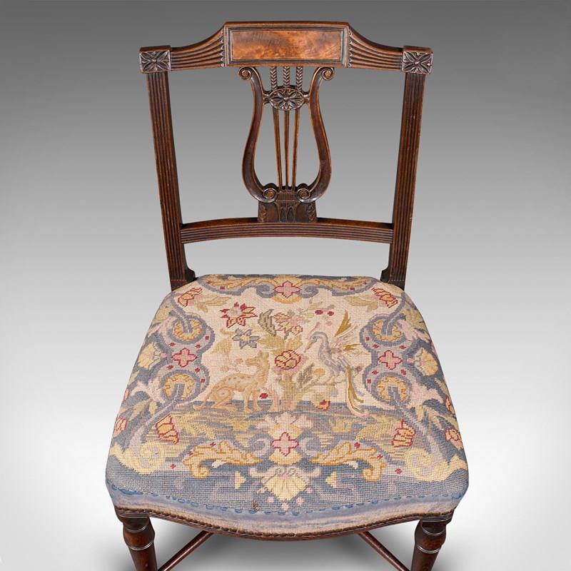 This is an antique embroidered lyre back chair. An English, walnut and needlepoint bedroom or hall seat, dating to the Regency period, circa 1820.