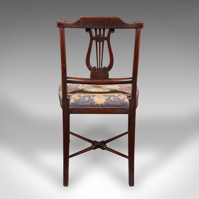 This is an appealing antique embroidered lyre back chair, with a superb needlepoint cushion and wonderful Regency craftsmanship to the back rest. Solid joints and construction, delivered ready for the home.