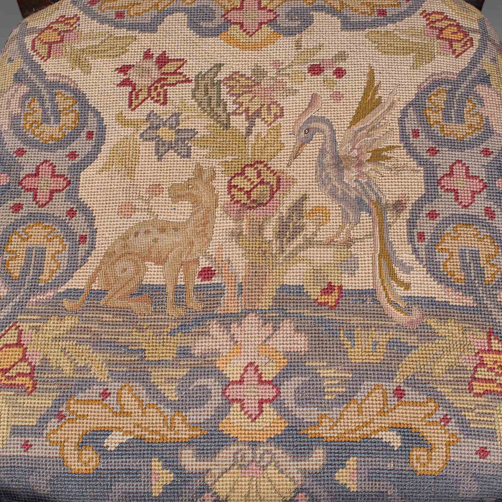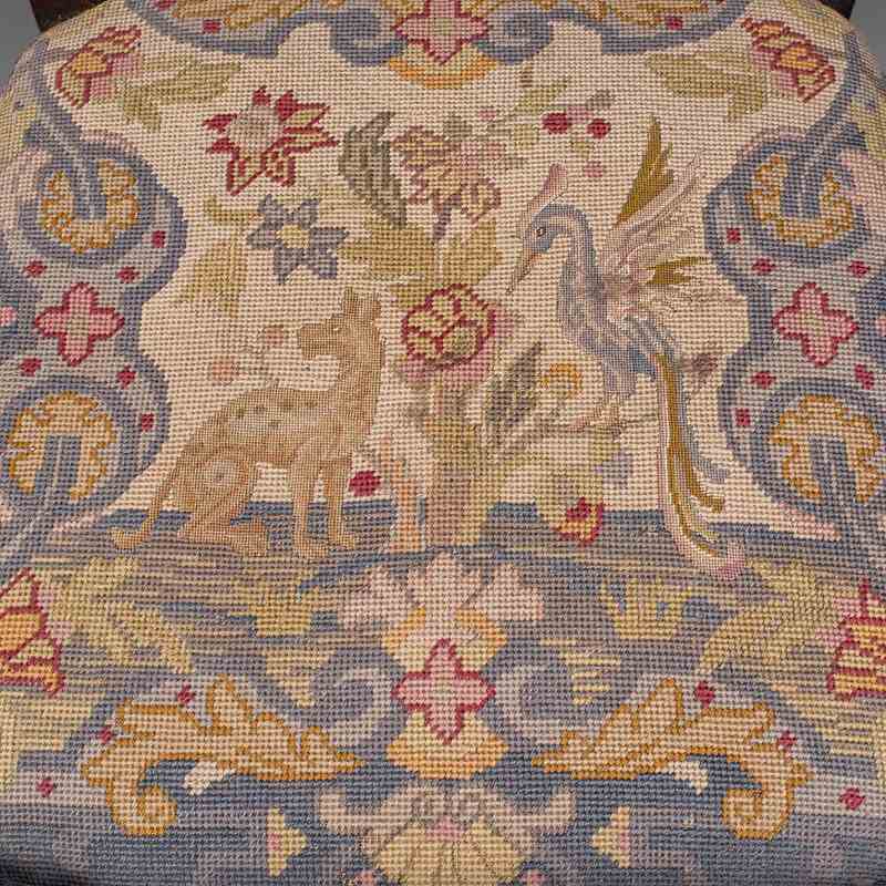 Endearing needlepoint covering and a fascinating frame accentuate this fine seat