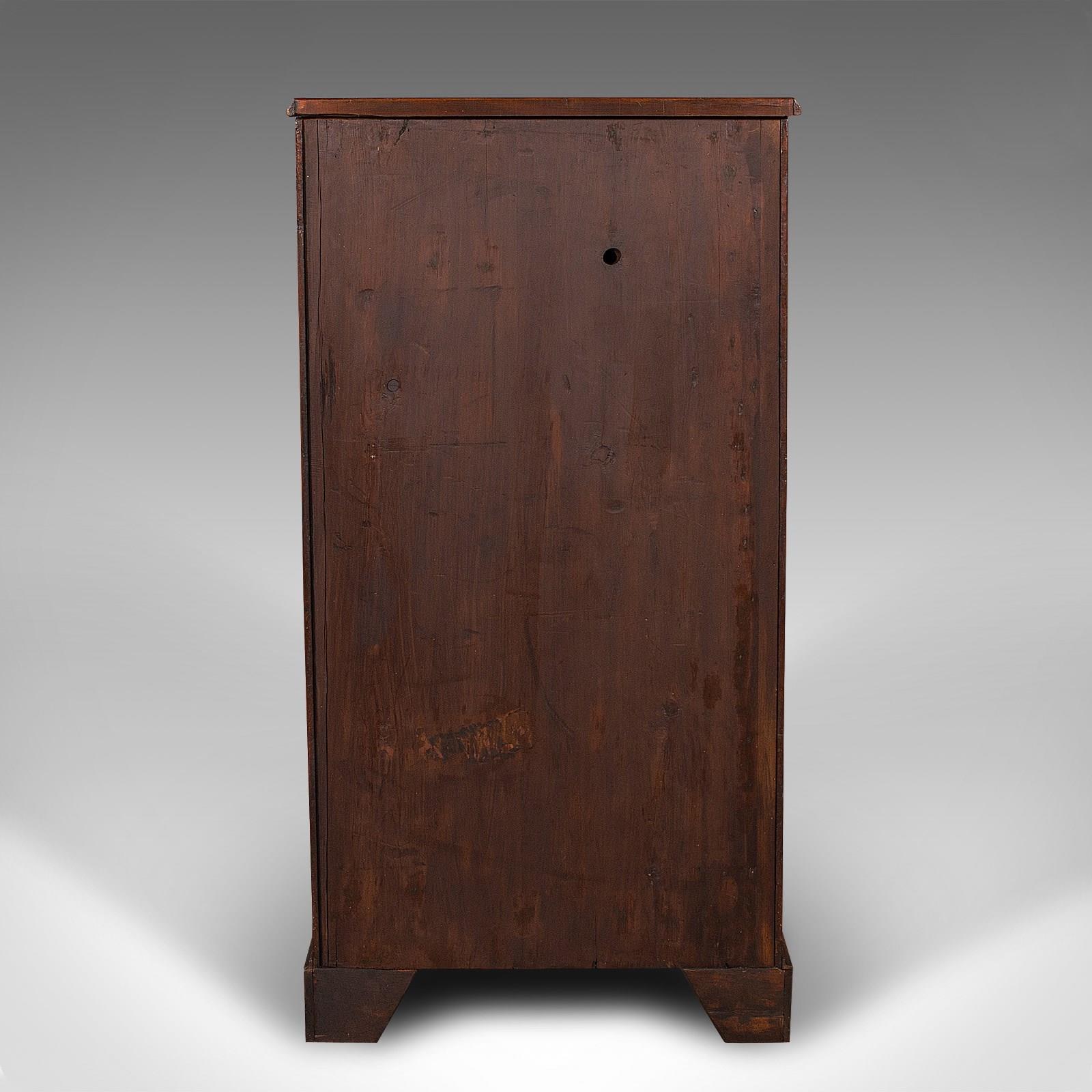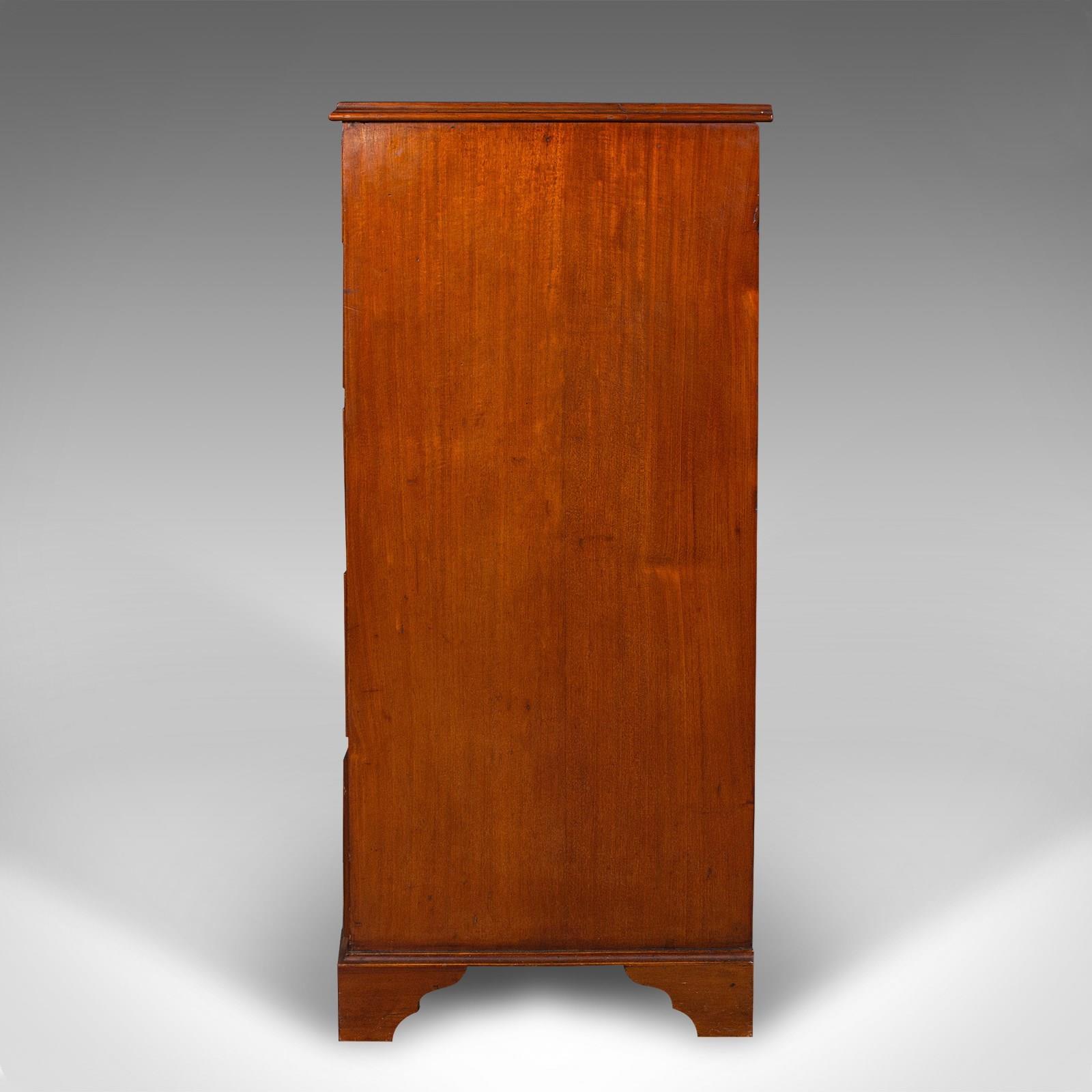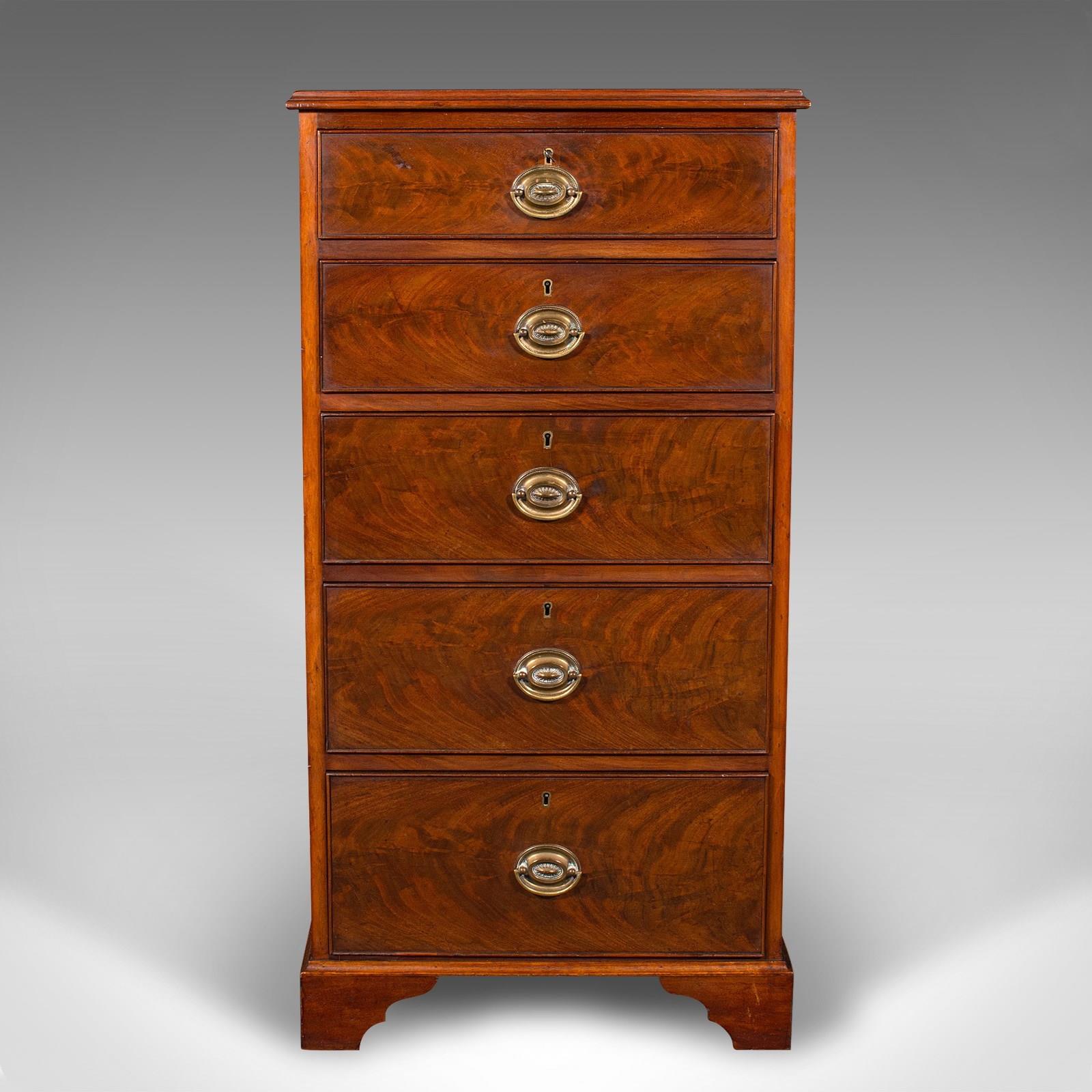This is an antique 5 drawer tallboy. An English, walnut and flame mahogany chest of drawers, dating to the Victorian period, circa 1850.