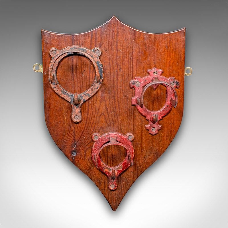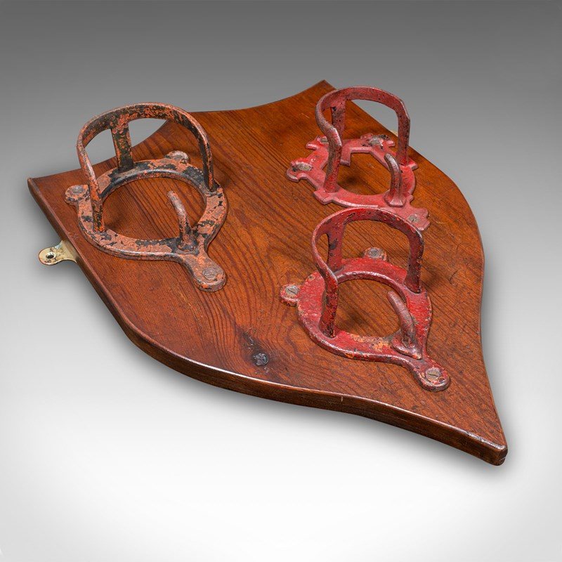 This is an antique equestrian yard master’s hanging shield. A Scottish, pitch pine and cast iron tack mounting plaque, dating to the late Victorian period, circa 1900. A charmingly practical piece, perfectly suited to a stable block, tack room or country-house equestrian setting.