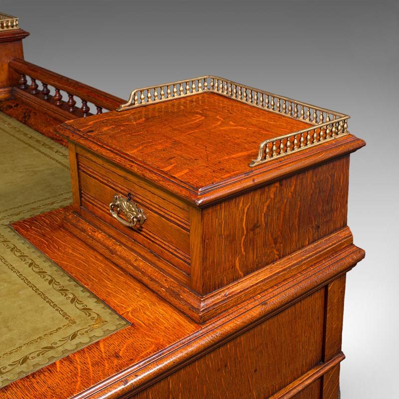Upper drawers set at the back of the desk adorned with brass gallery rails