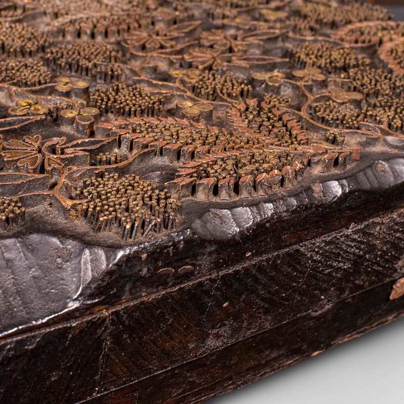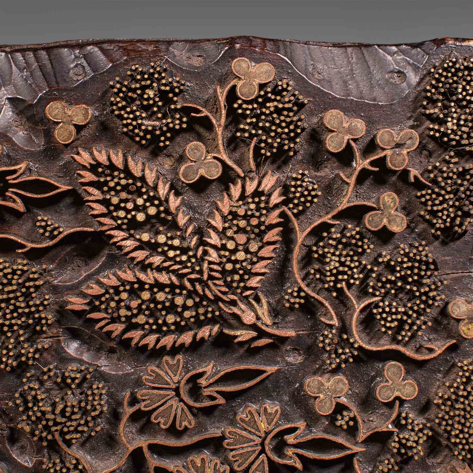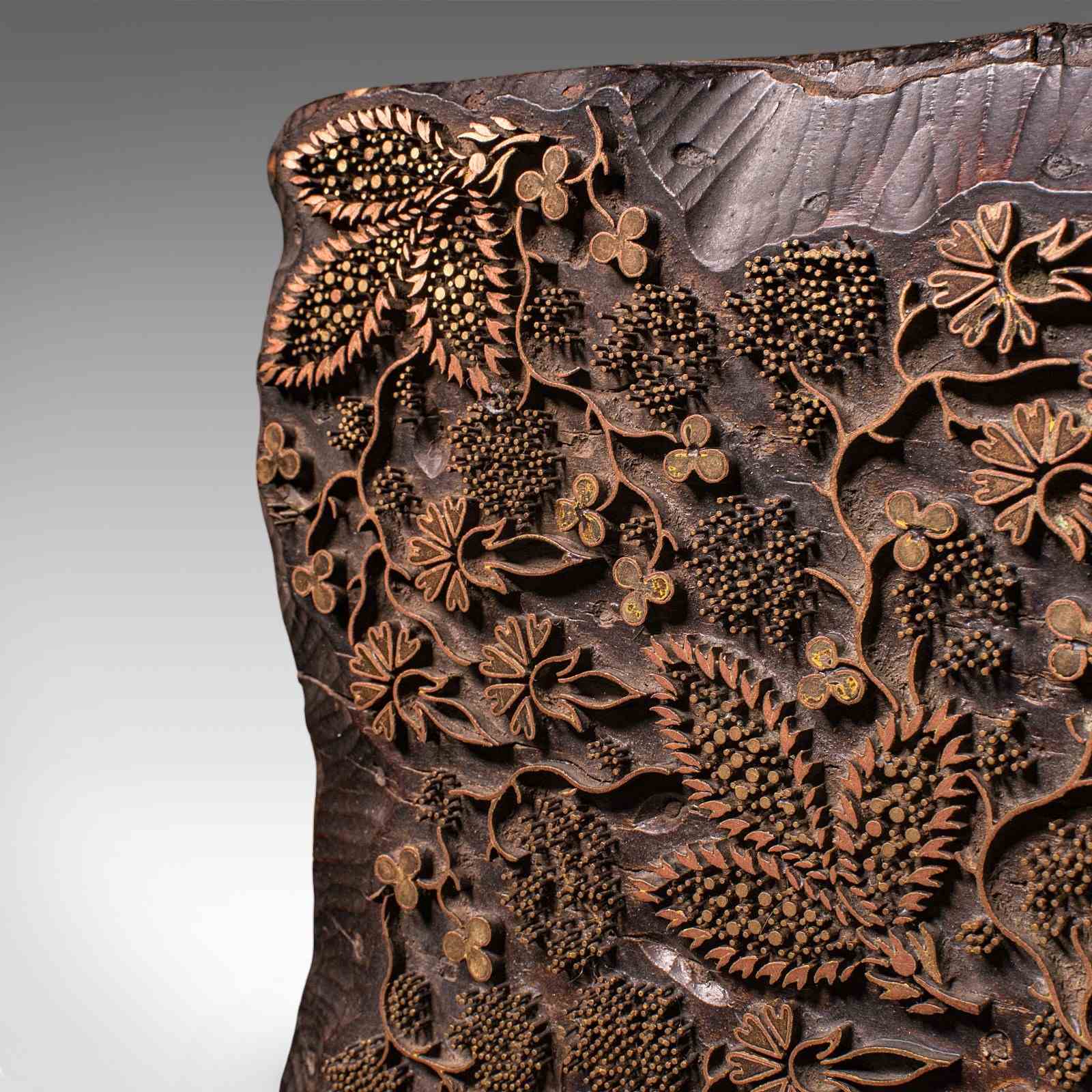 This is an antique fabric printing block. An English, carved brass on hardwood wallpaper printer's stamp, dating to the late Victorian period, circa 1900.