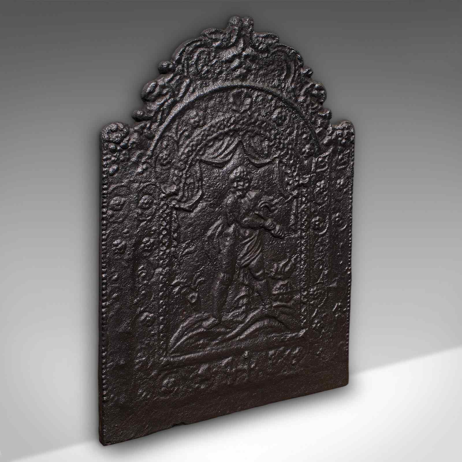 This is an antique decorative fire back. An English, cast iron fireplace backrest in Neoclassical taste, dating to the late Victorian period, circa 1900.