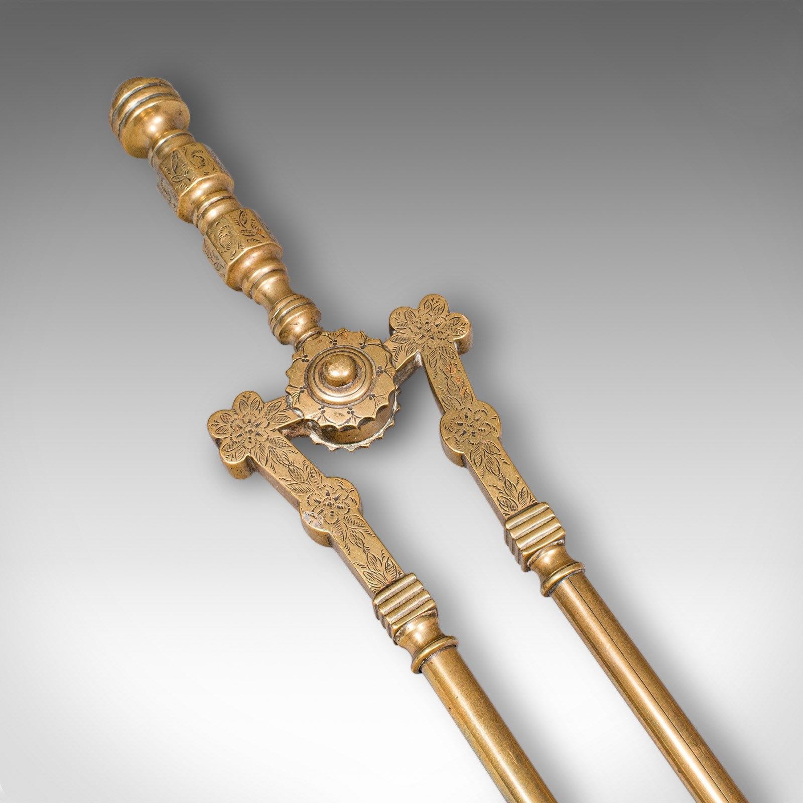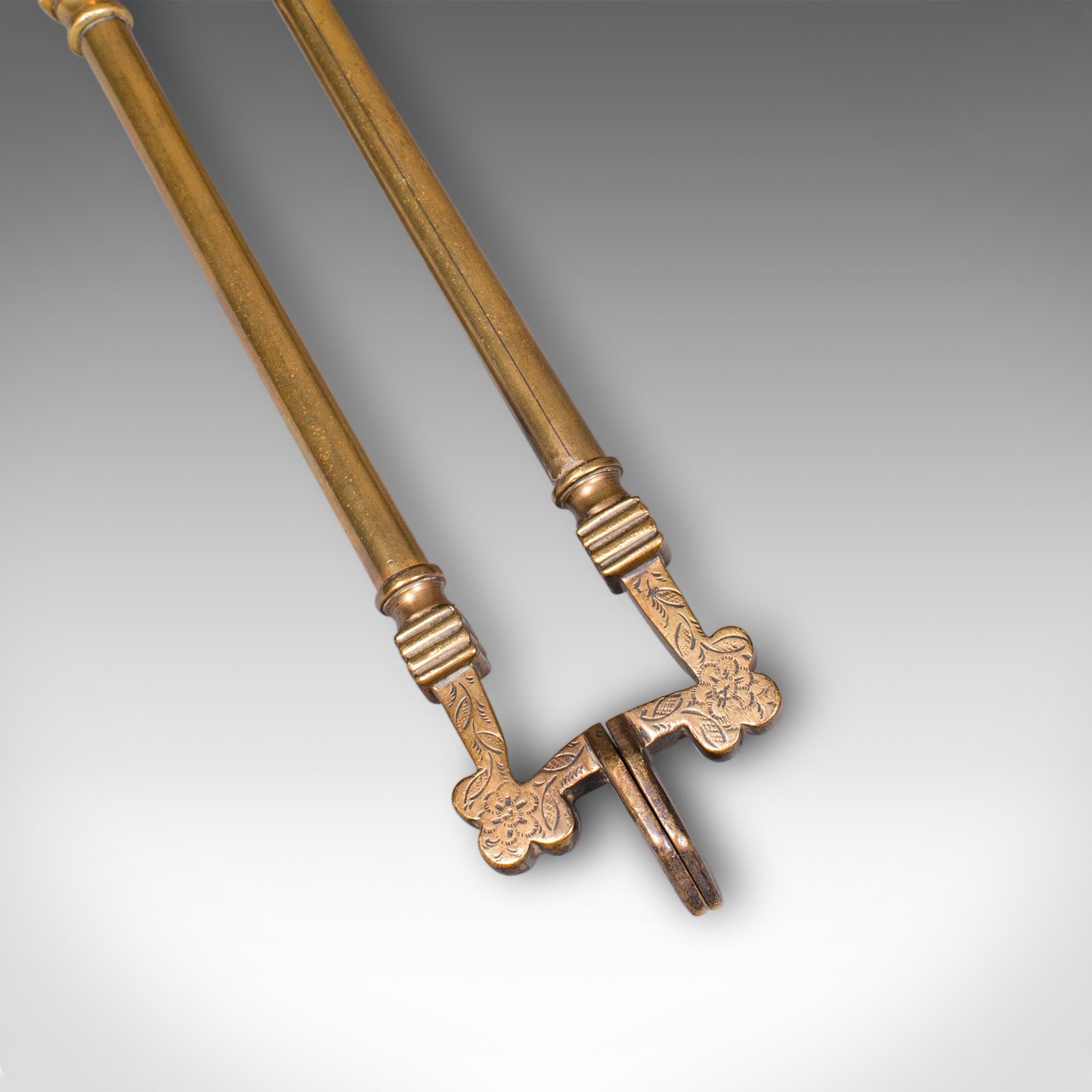 Engraved foliate detail embellishes the tong’s hinge for a decorative flourish