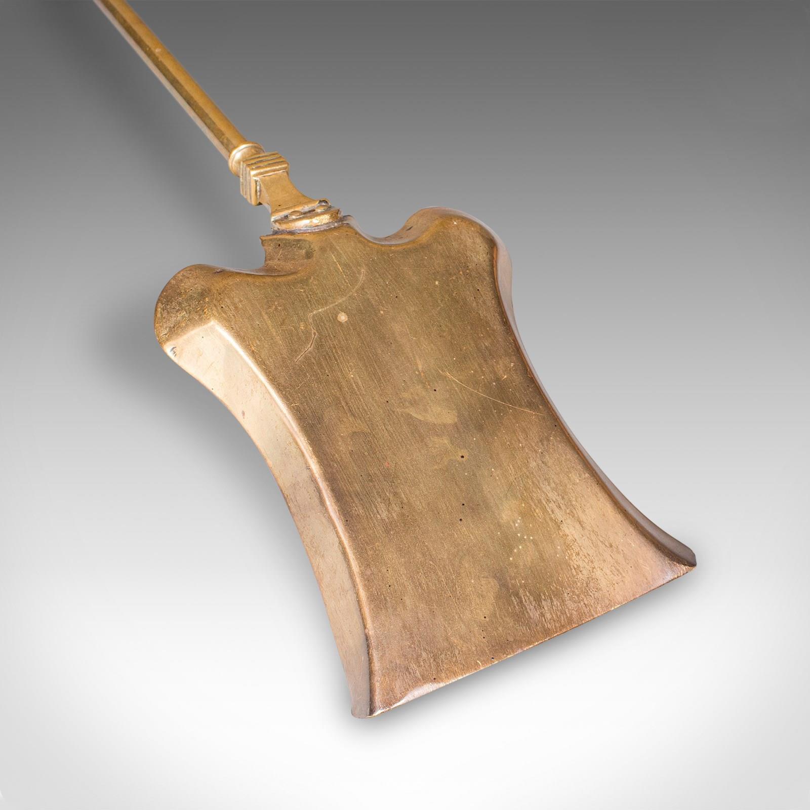This is an antique fire tool set. An English, brass shovel, tongs and poker suite for the hearth, dating to the mid Victorian period, circa 1870. Presenting refined Victorian craftsmanship and decorative appeal, this elegant trio offers both function and form for the traditional fireplace.