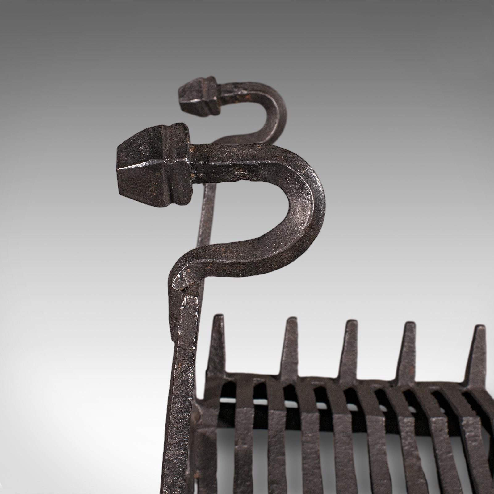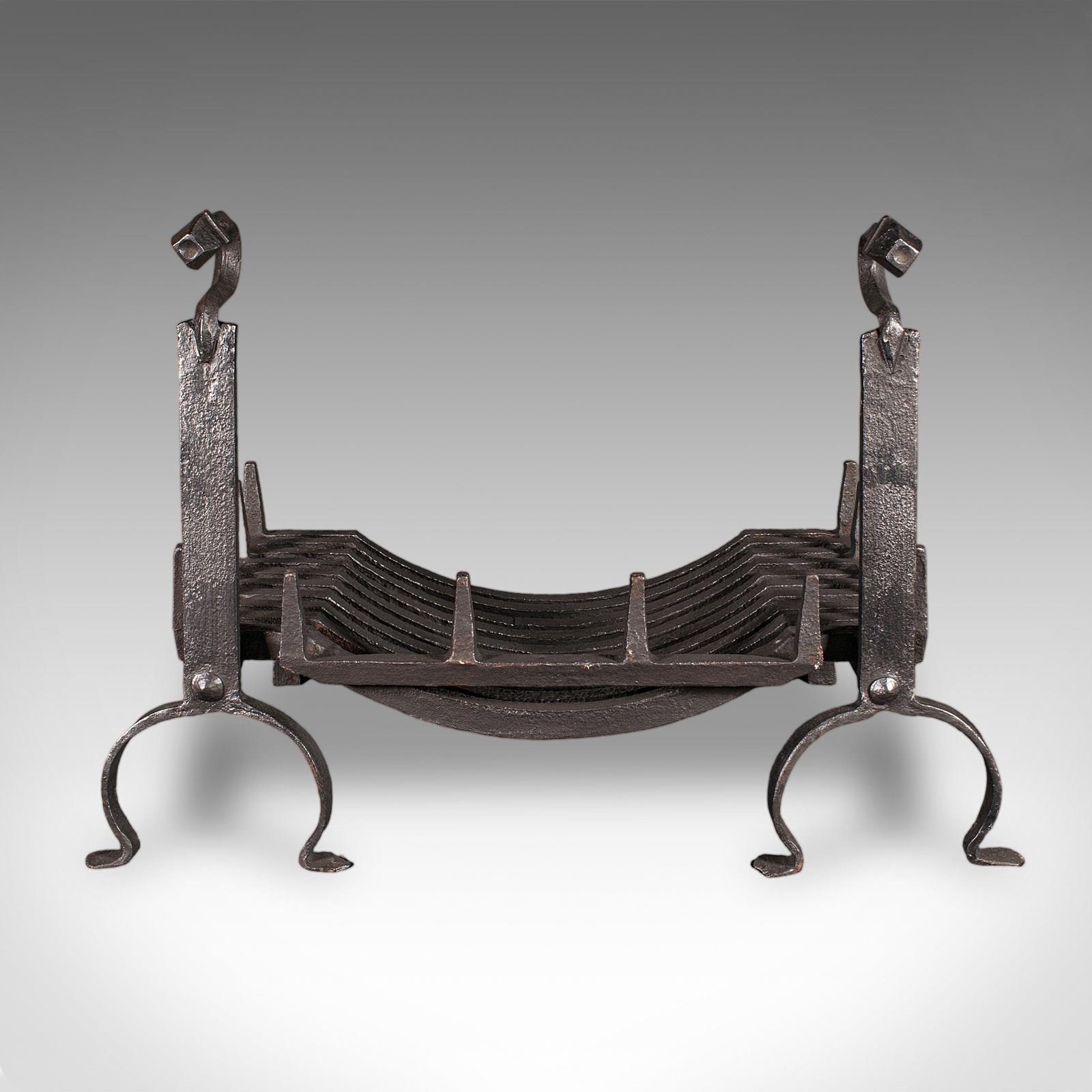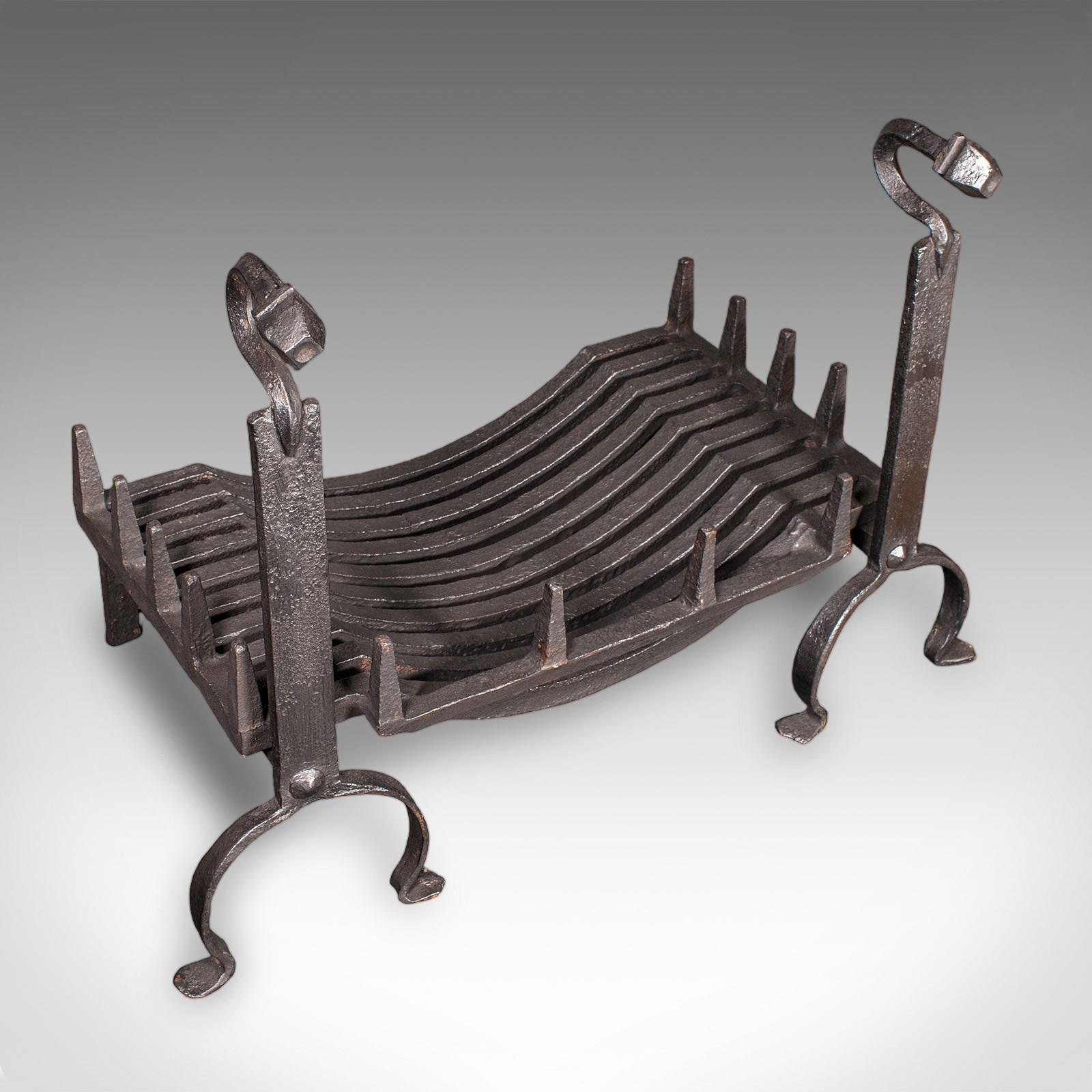 This is an antique fireplace set. An English, wrought iron fire basket and andirons ensemble, dating to the late Victorian period, circa 1900. An attractive and substantial fireside arrangement with appealing tonality and traditional craftsmanship.