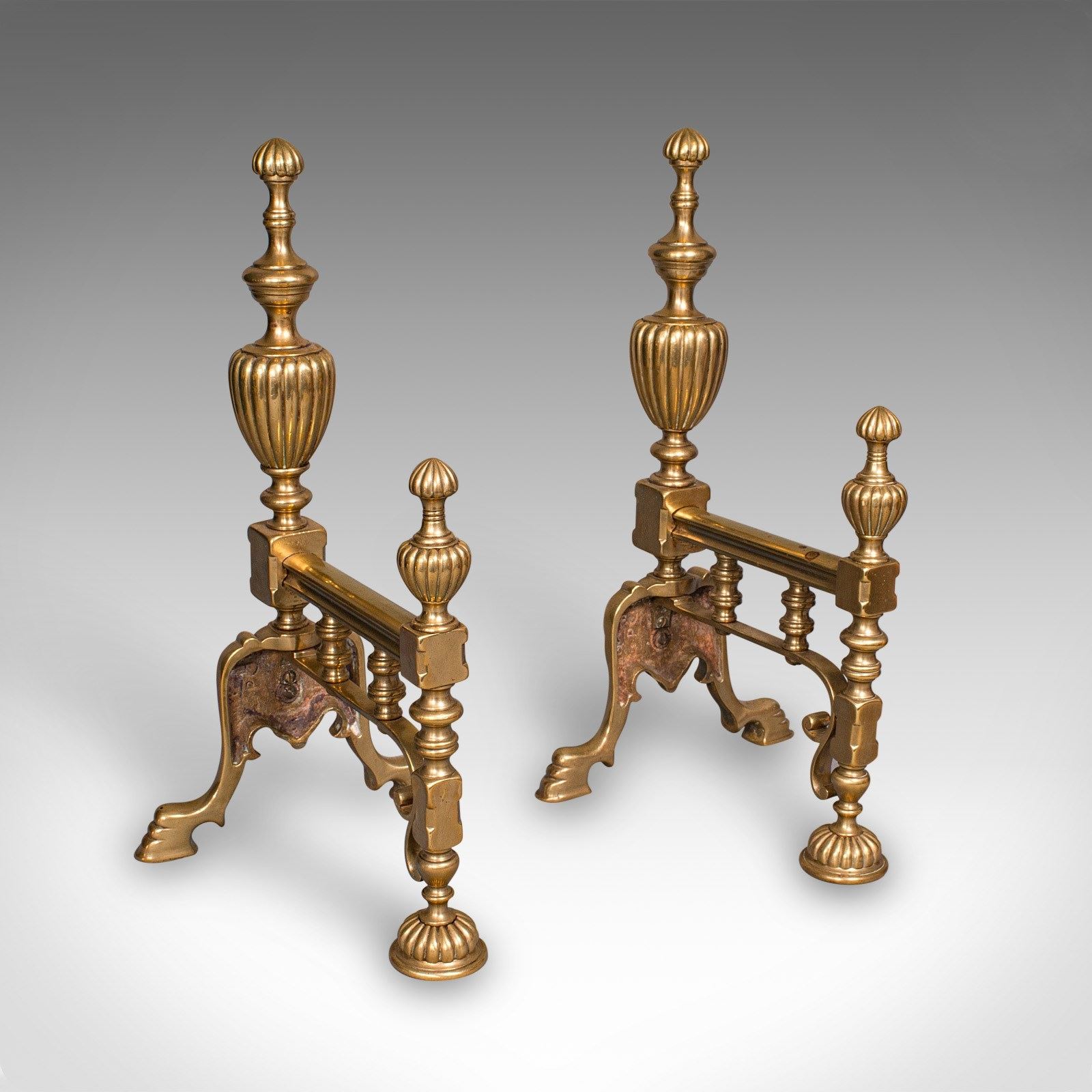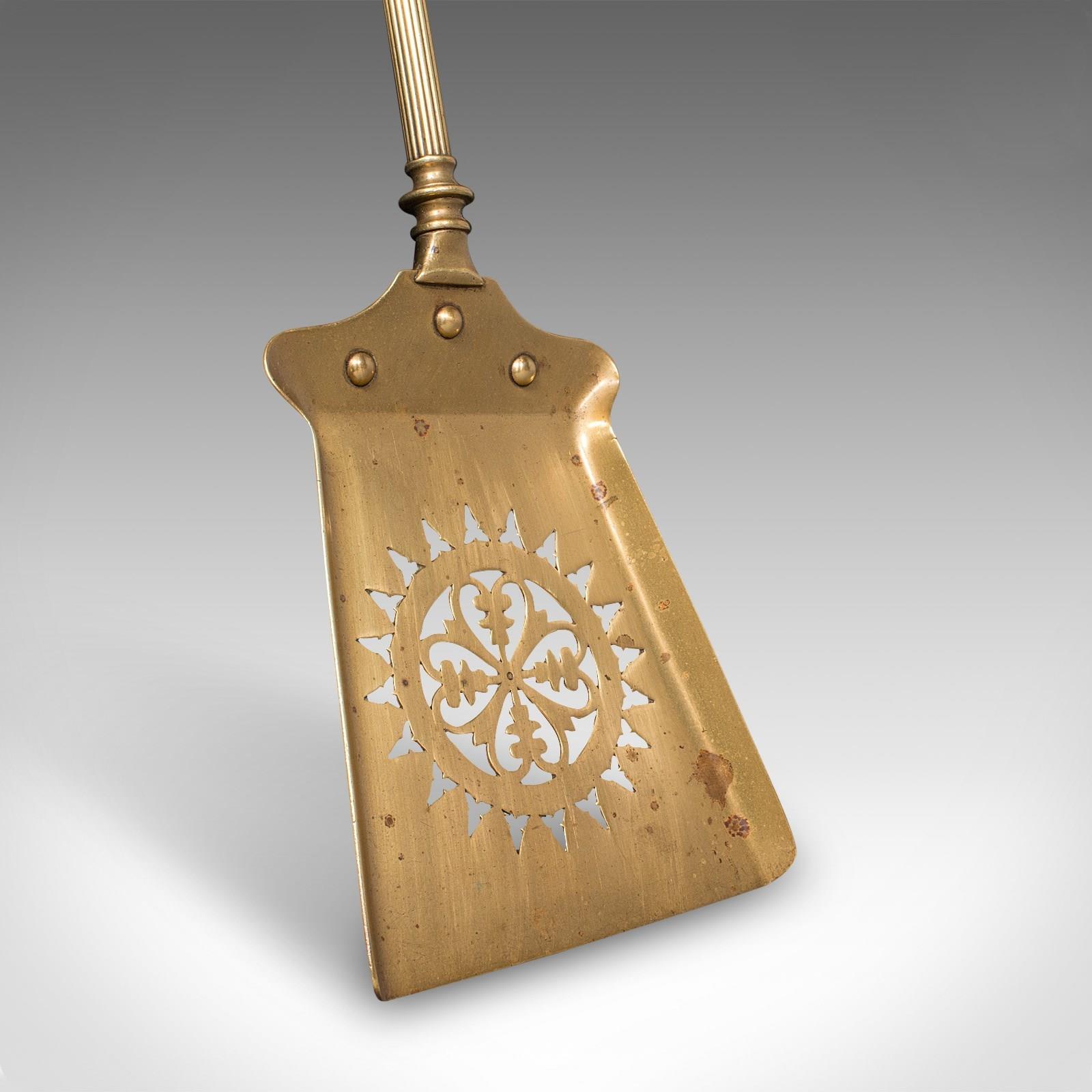 This is an antique fireplace tool suite. An English, brass shovel, poker and tong set with accompanying tool rests, dating to the mid Victorian period, circa 1870. An exceptional example of Victorian fireplace furnishing, offering refined craftsmanship and elegant presentation.