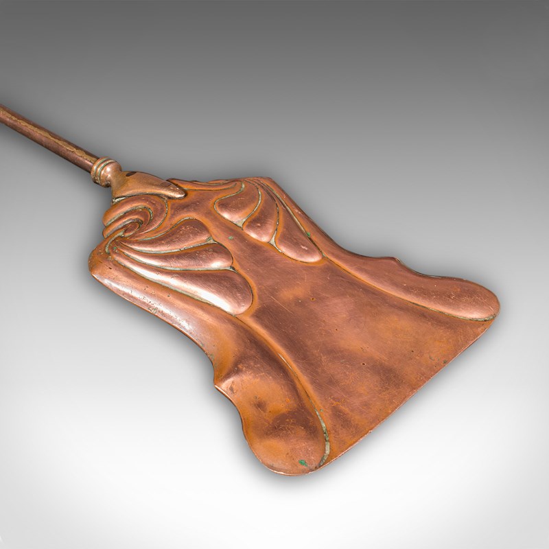 This is a superb antique fireside companion set, comprising a pair of French bronze andirons and a trio of fire tools in Art Nouveau taste, dating to the late Victorian period, circa 1890. Rich in decorative allure and functionality, this exceptionally rare bronze set epitomises the flowing elegance of the era.