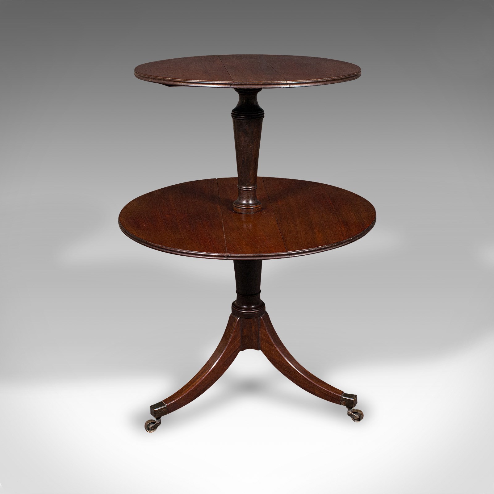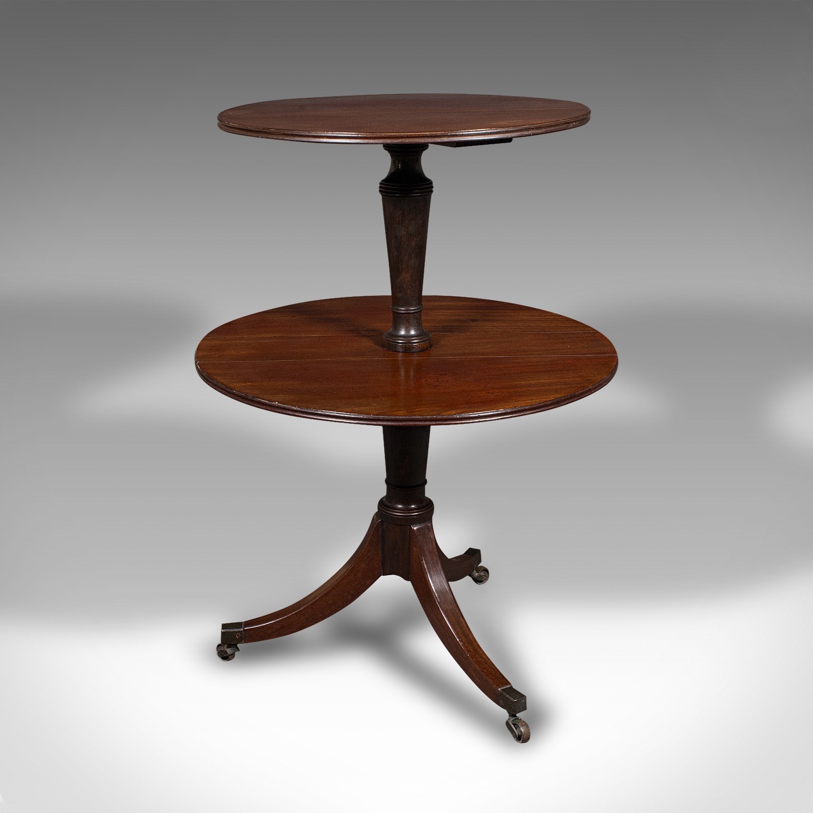 This is an antique folding dumb waiter. An English, mahogany two tier serving stand, dating to the Georgian period, circa 1800.