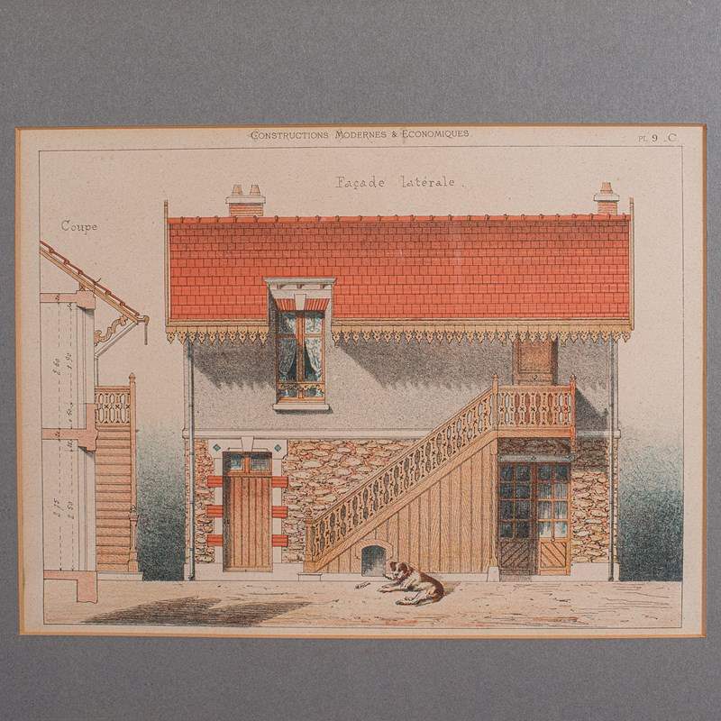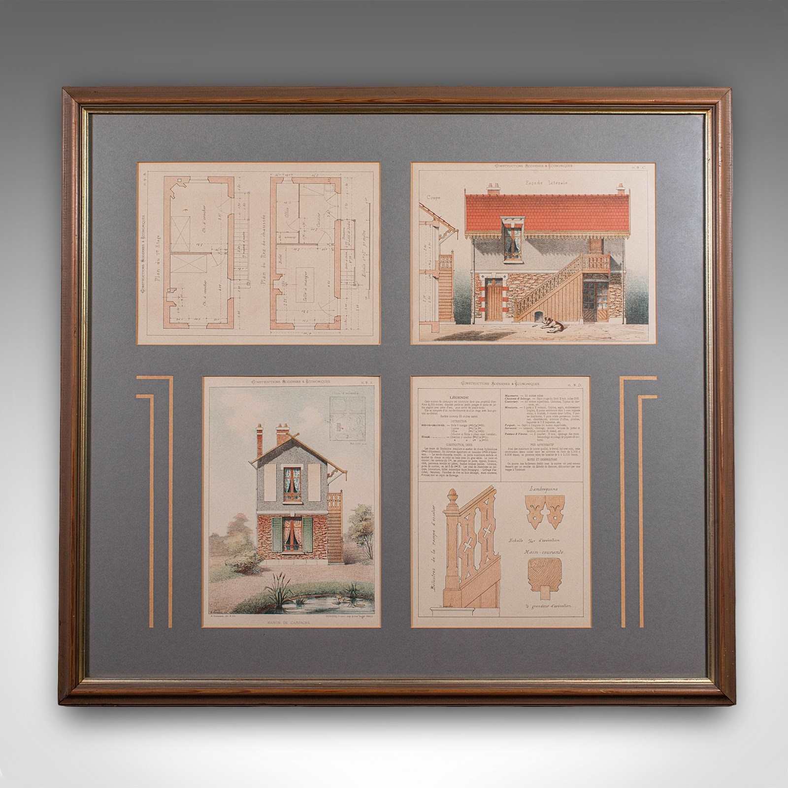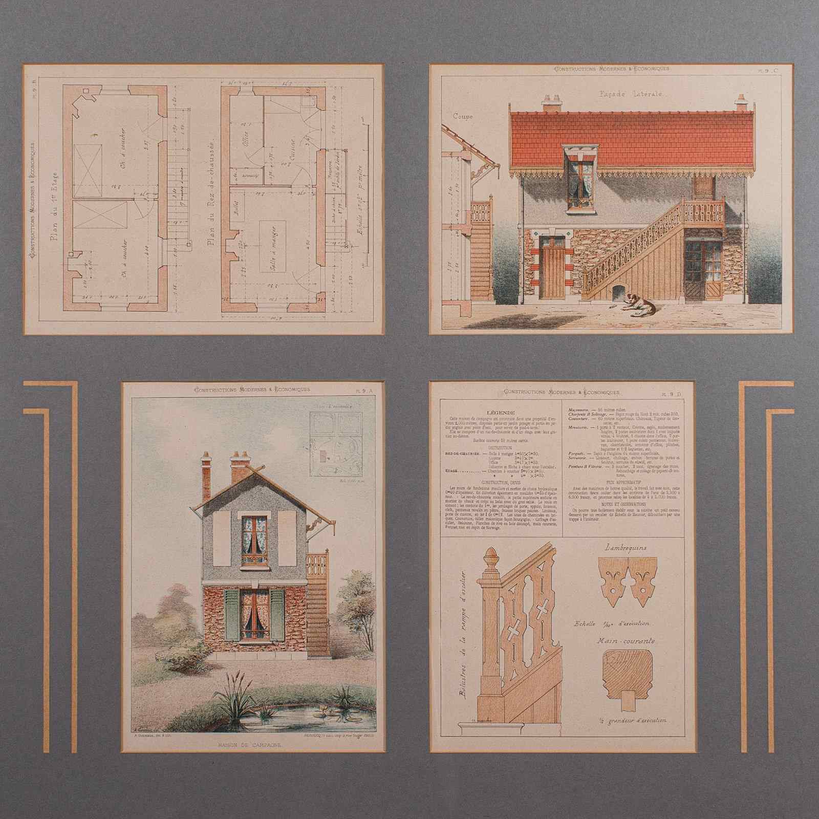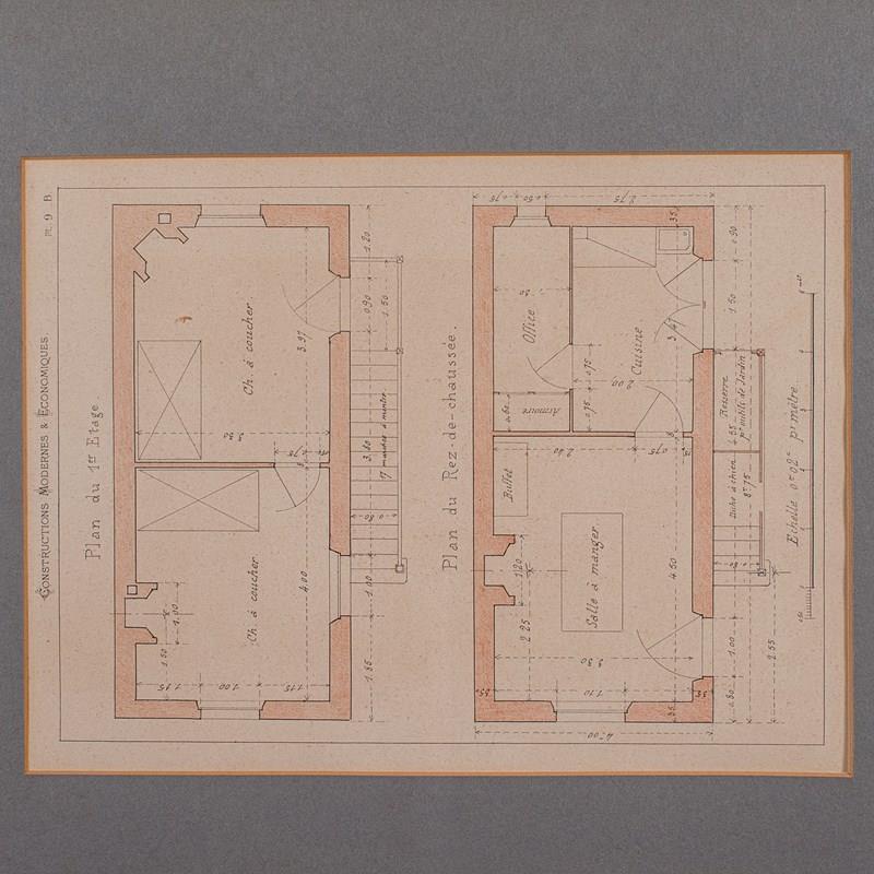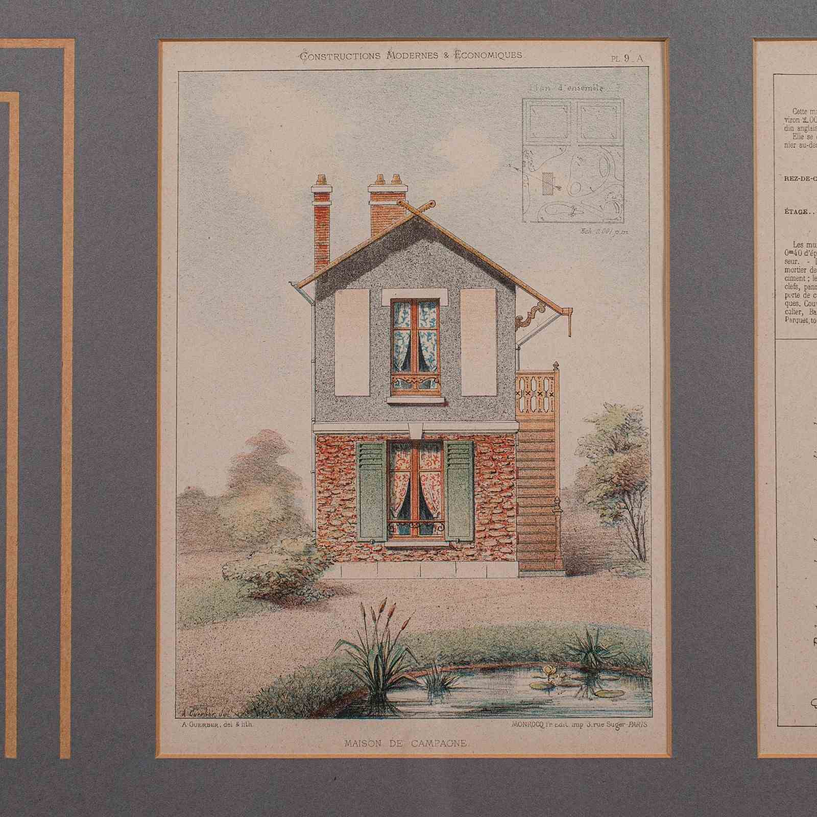 This is an antique framed architectural plan. A French, lithograph set of drawings from Constructions Modernes et Economiques, dating to the late Victorian period, circa 1900.