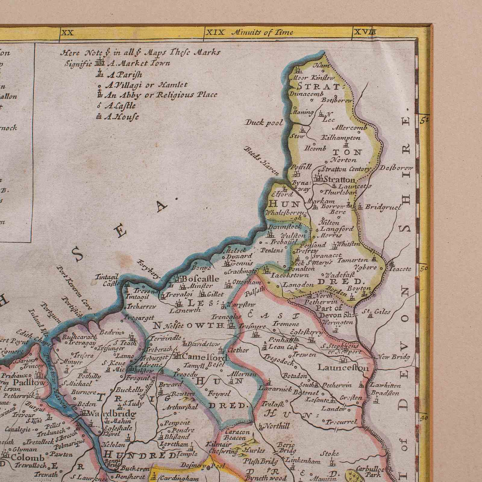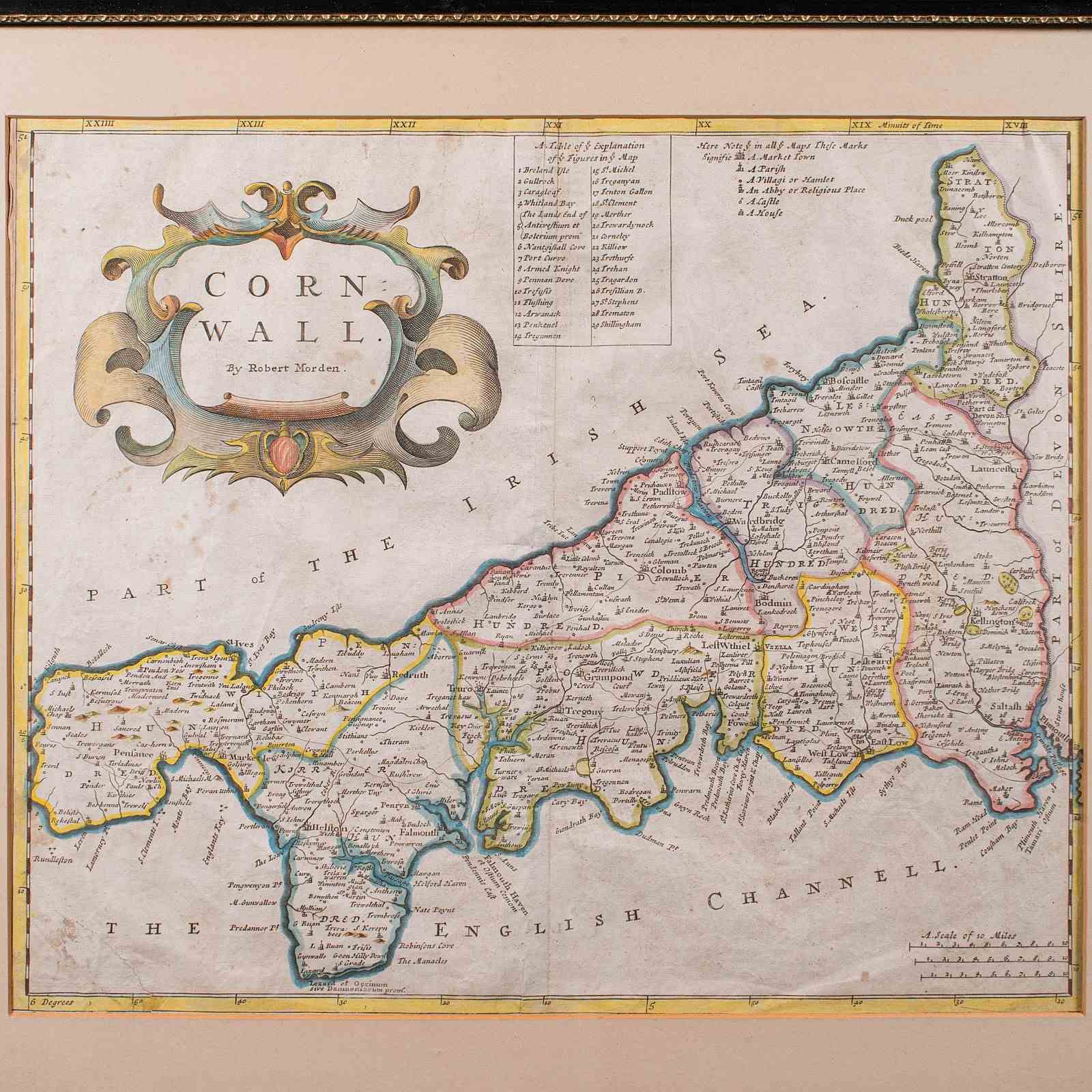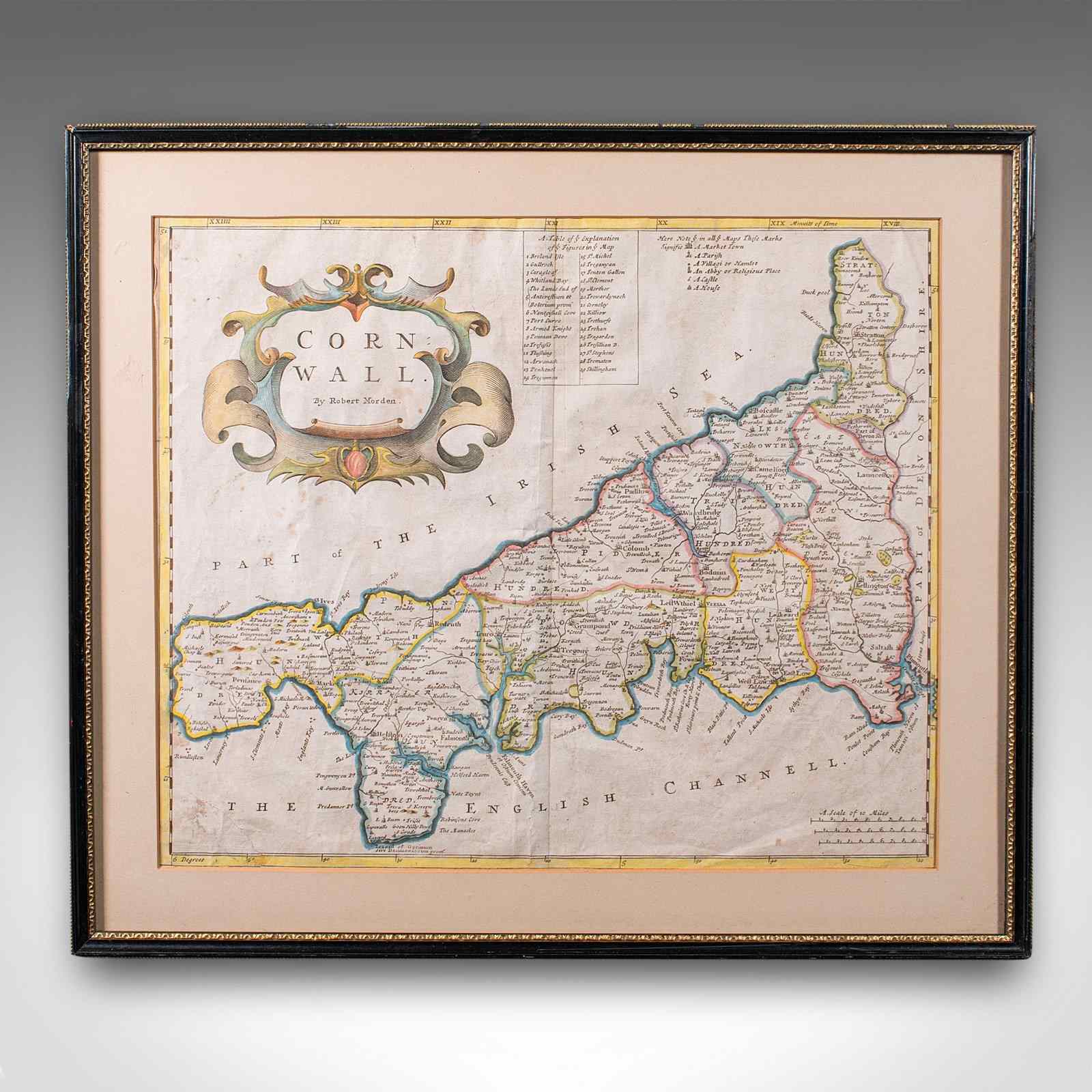 This is an antique framed map of Cornwall. An English, atlas engraving of cartographic interest By Robert Morden, dating to the late 17th century and later.
