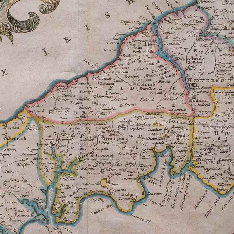 Delightful lithography of Cornwall and its county detail, perfect for display