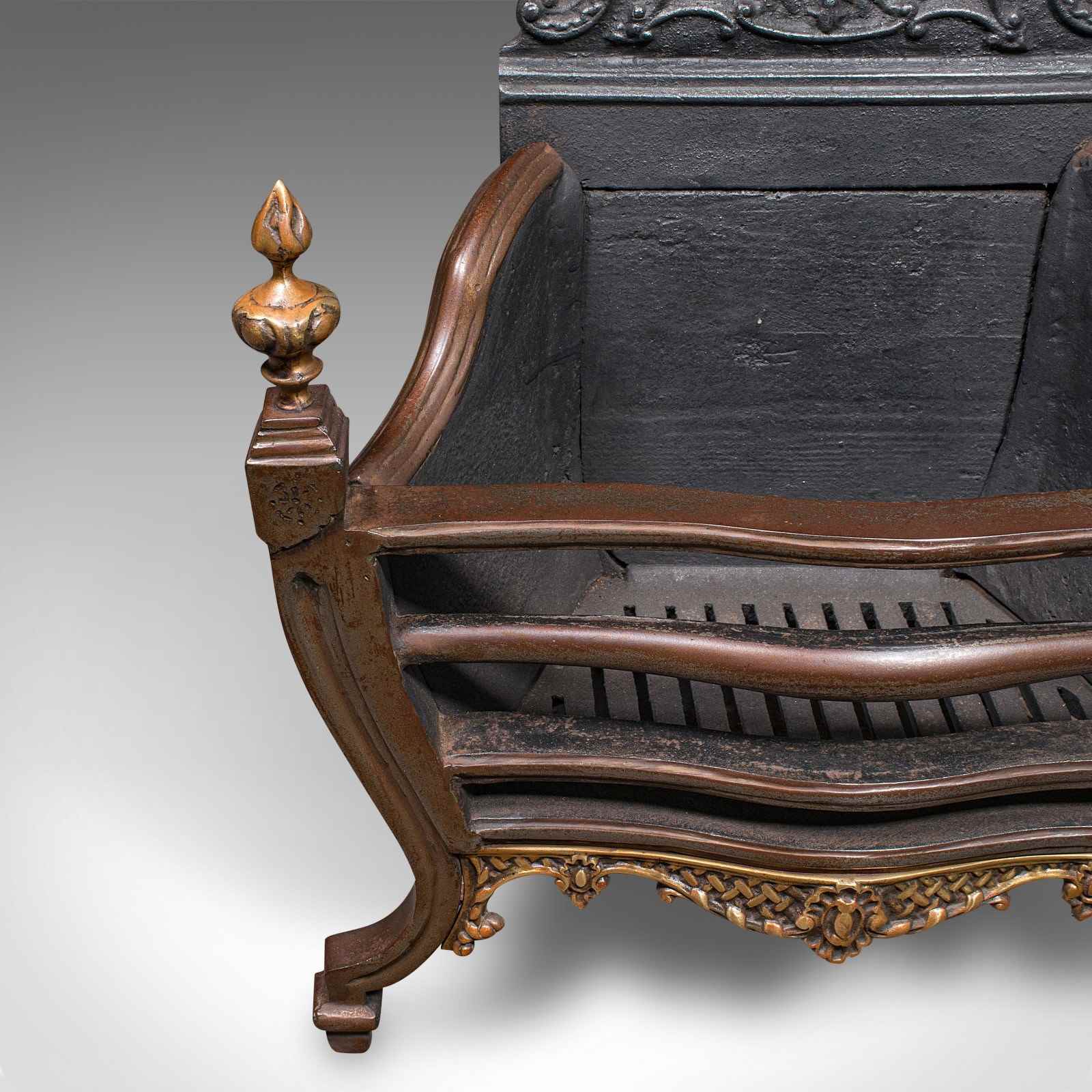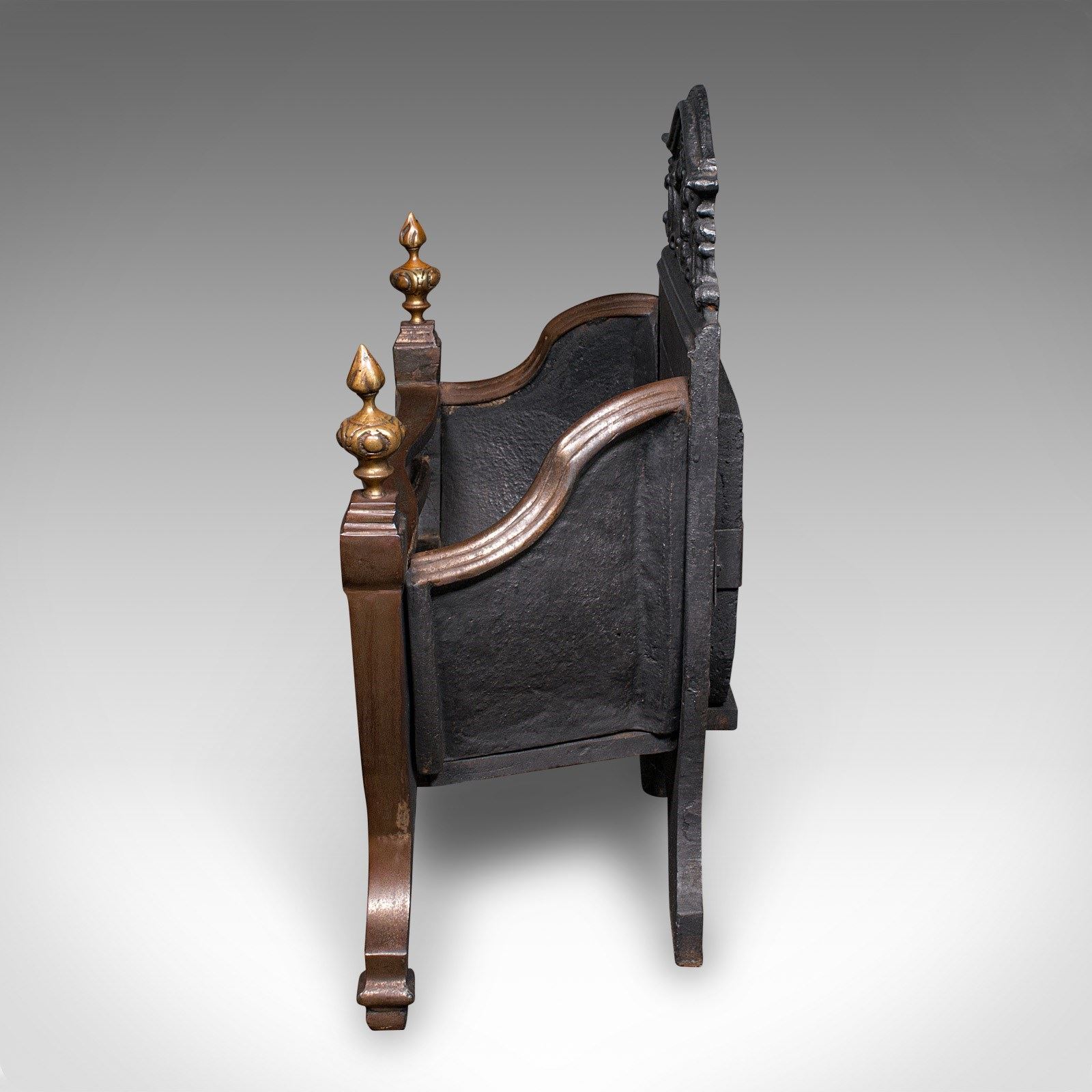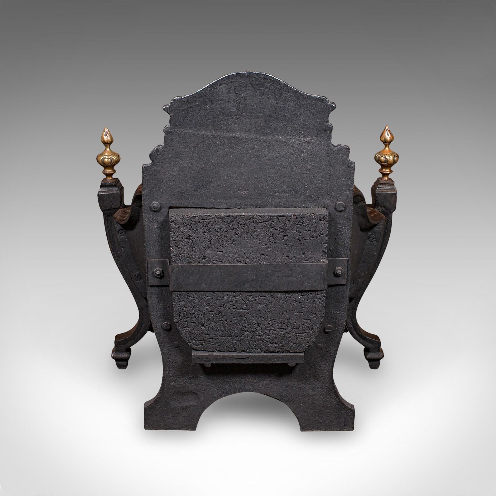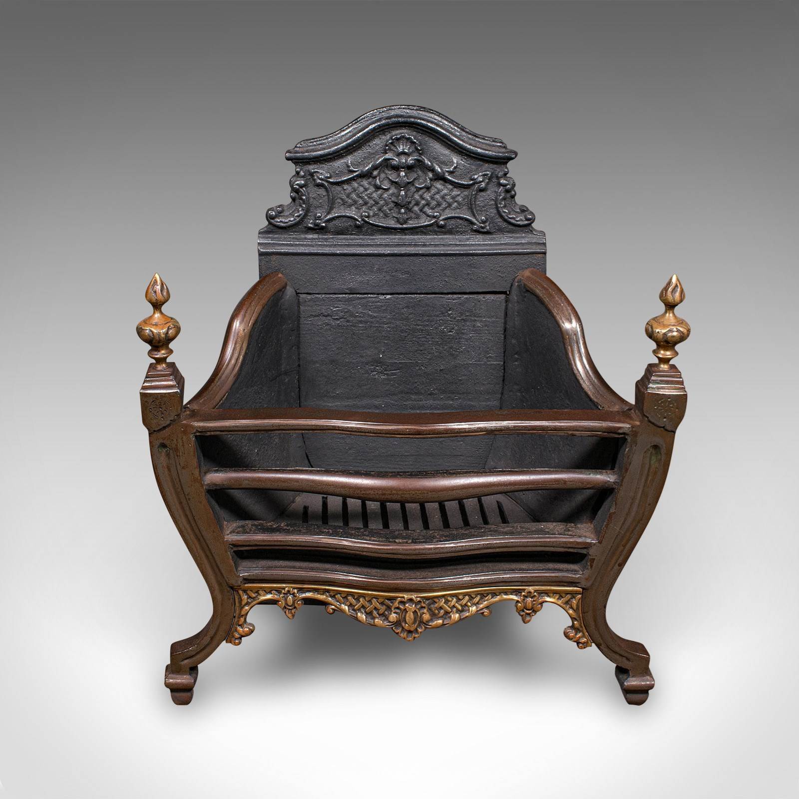 This is an antique free-standing fire basket. An English, cast iron, brass and steel decorative hearth in Georgian revival taste, dating to the late Victorian period, circa 1900. A wonderful example of period craftsmanship, presenting a balanced form, attractive detailing, and appealing material contrast. The proportion and form is ideal for the traditional fireside.
