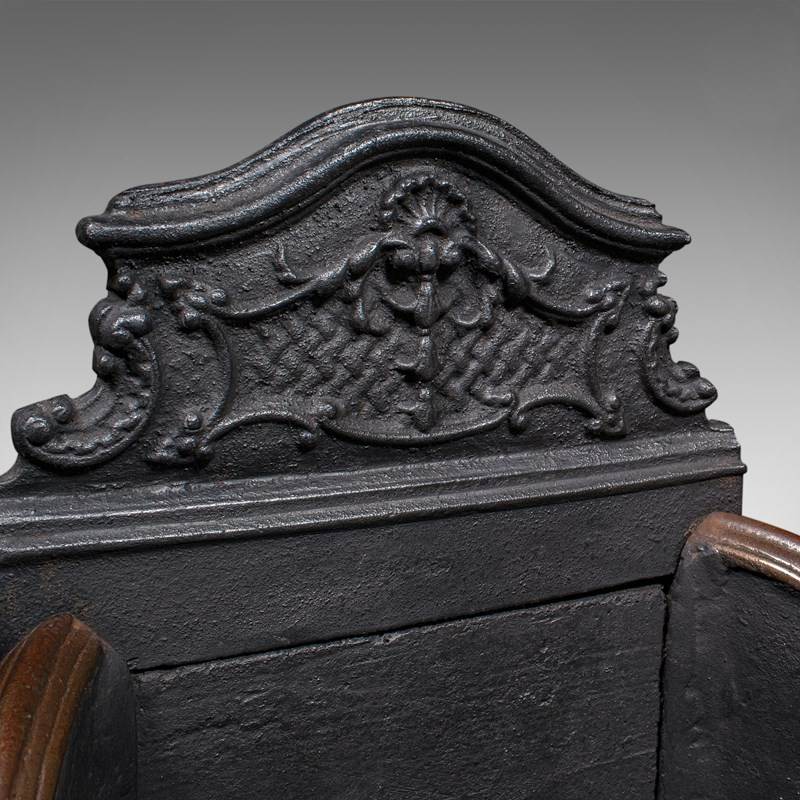 The decorative back rest is adorned with a relief cast frieze, featuring foliate and scroll motif