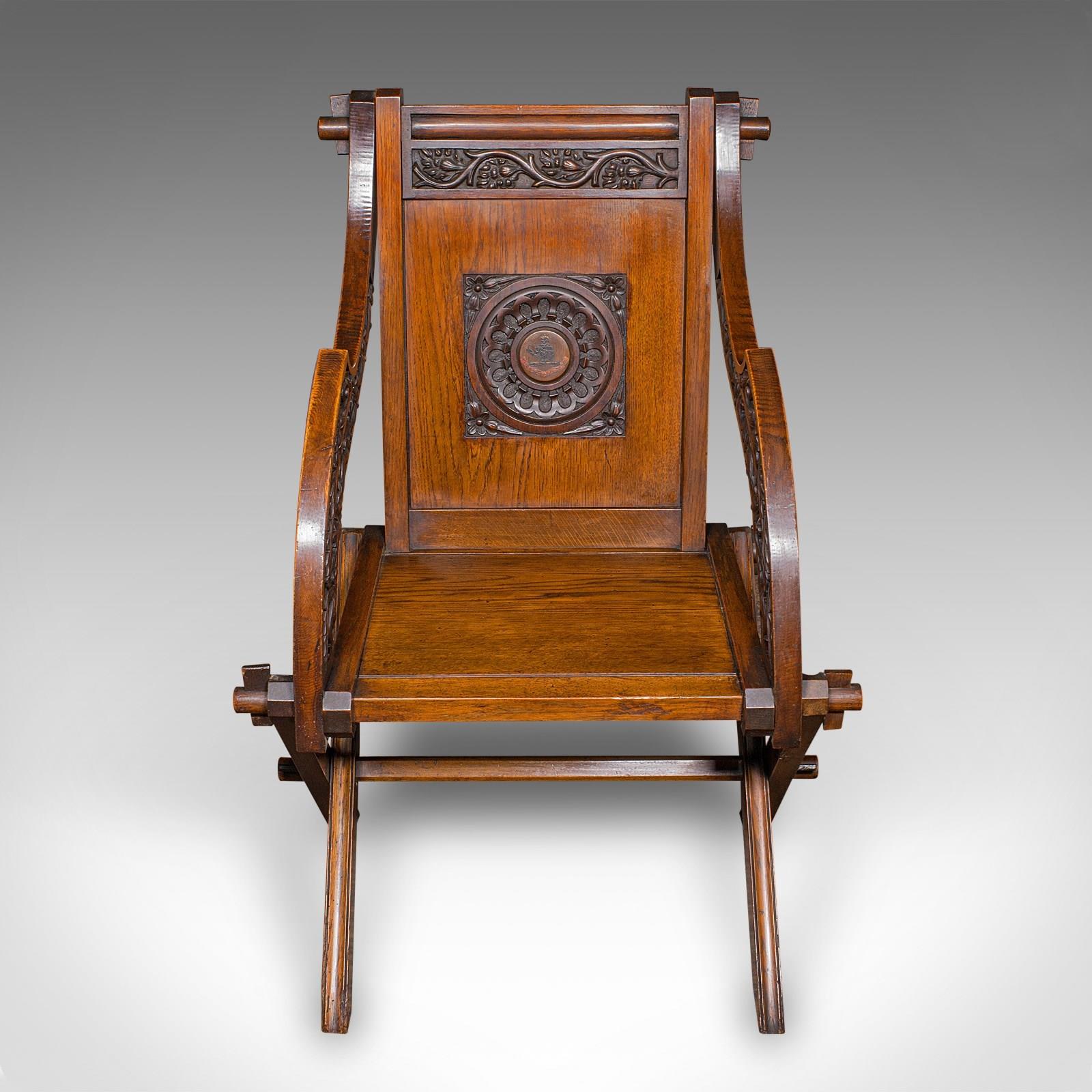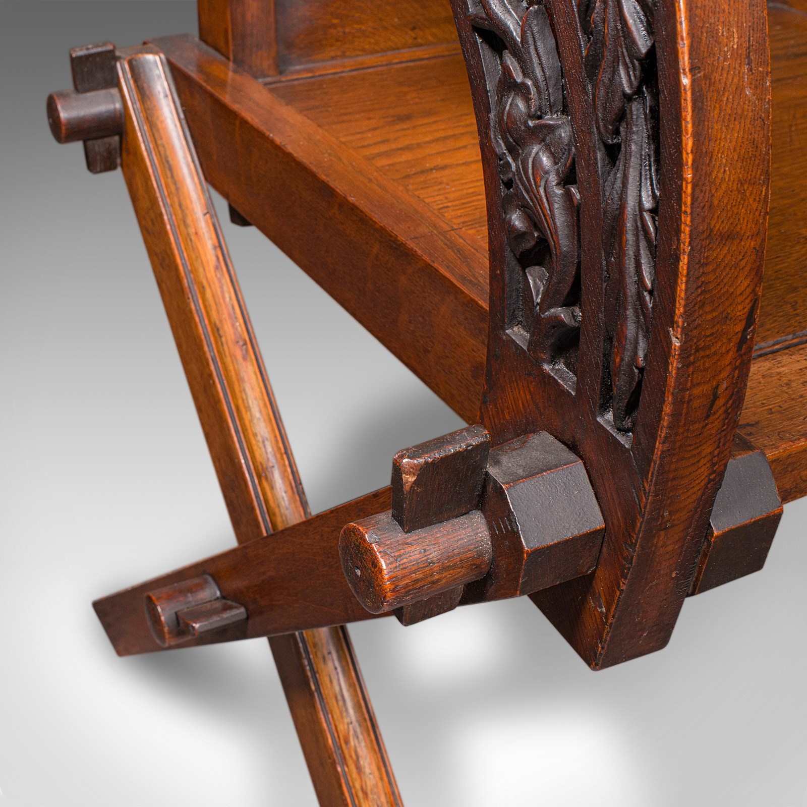 This is an antique Glastonbury chair. An English, oak armchair in Gothic Revival taste, dating to the Victorian period, circa 1880. A superb example of the traditional Glastonbury form, this distinguished chair exhibits the bold lines, medieval inspiration, and craftsmanship typical of the late 19th century Gothic Revival movement. Wonderfully constructed and full of character, it makes a commanding statement piece for a study, library, or hall.