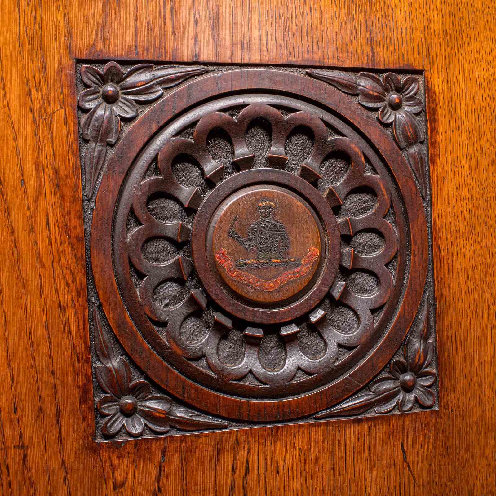 Square frieze to the back rest hosts a flowerhead carved medallion with heraldic portrait to the centre