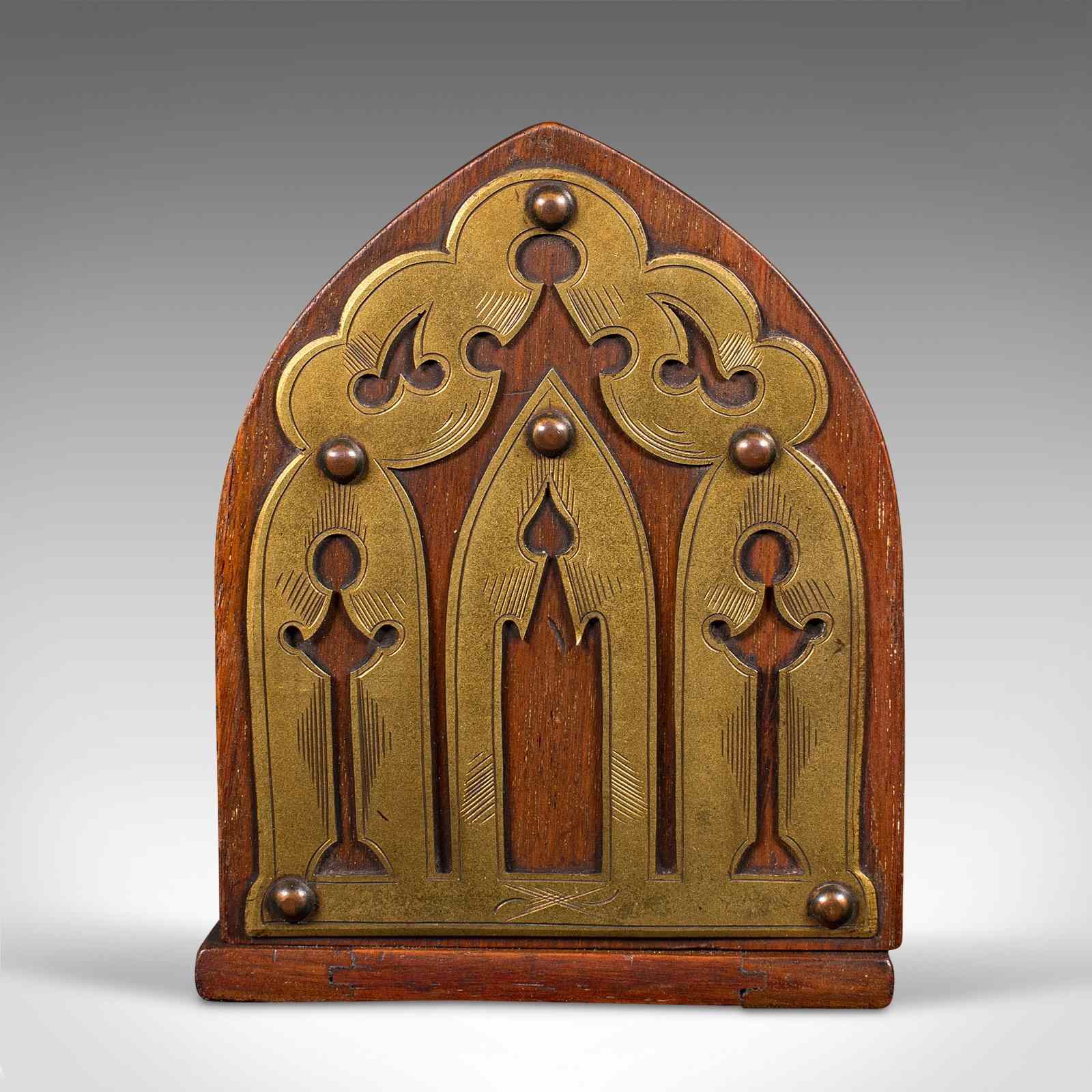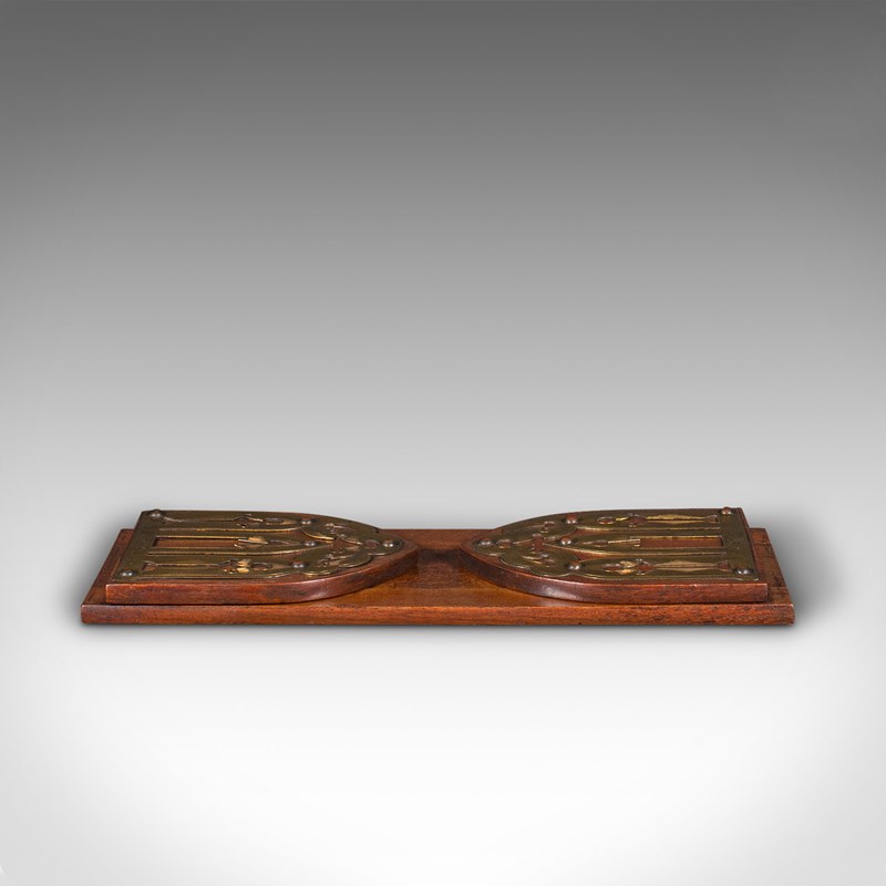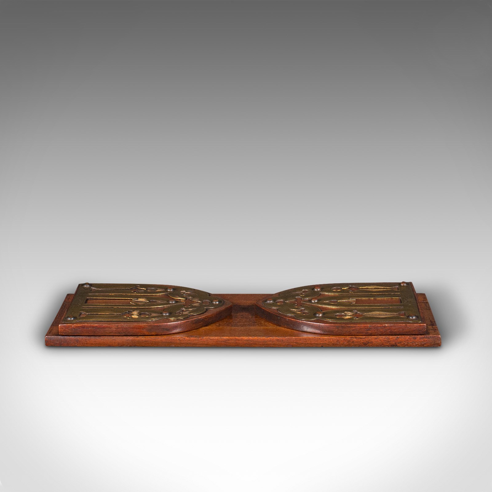 This is an antique Gothic revival book slide. An English, walnut and brass extending bookrest, dating to the late Victorian period, circa 1880.