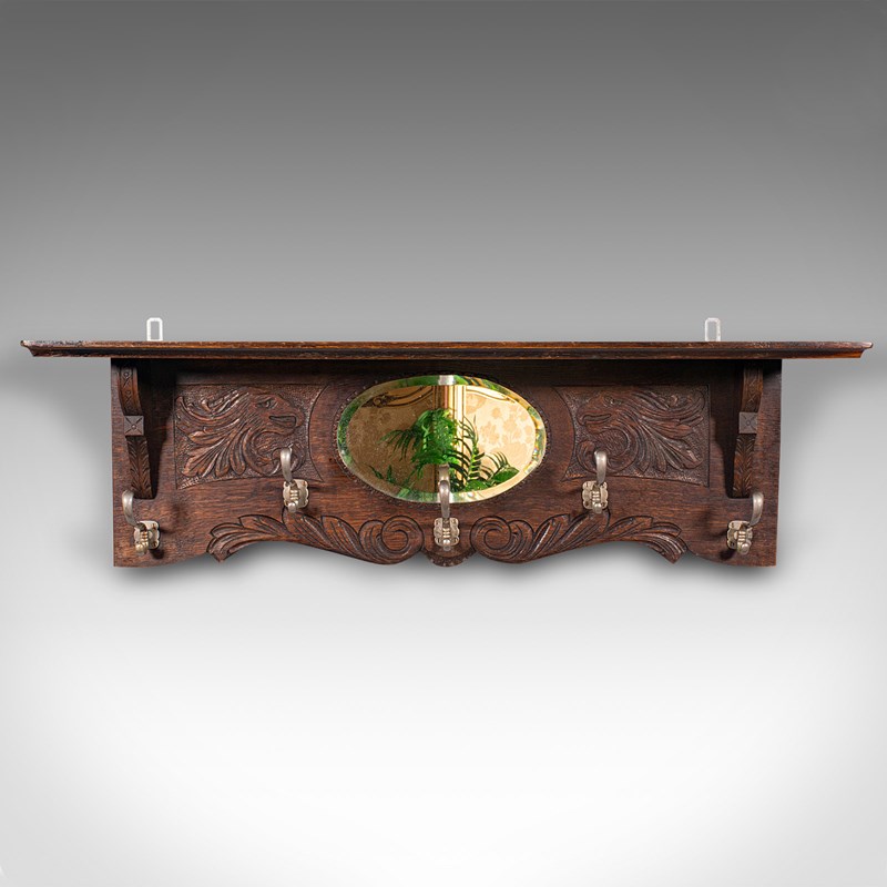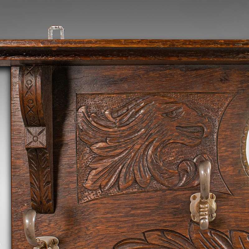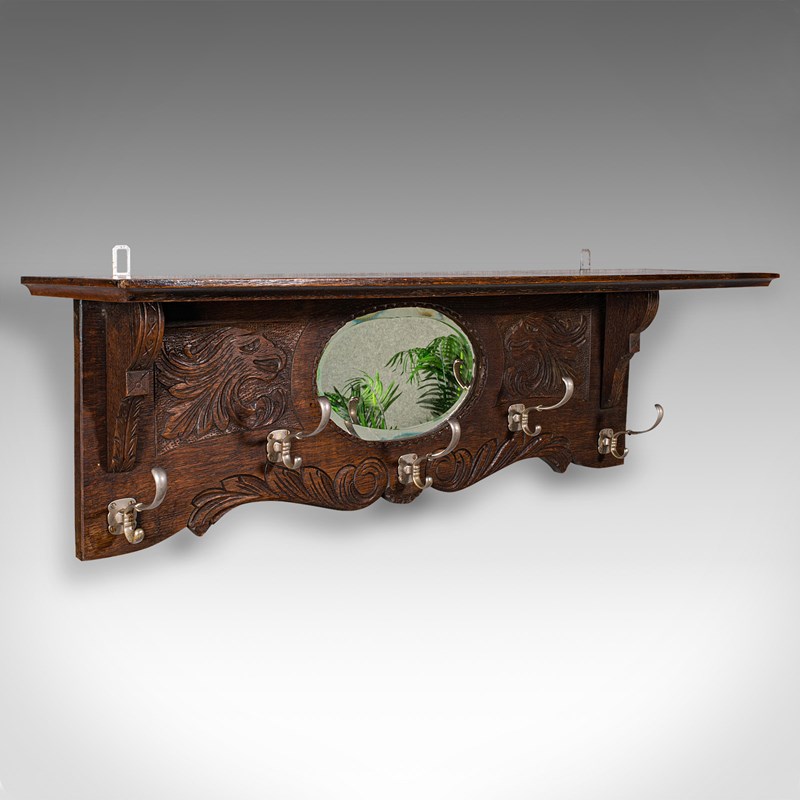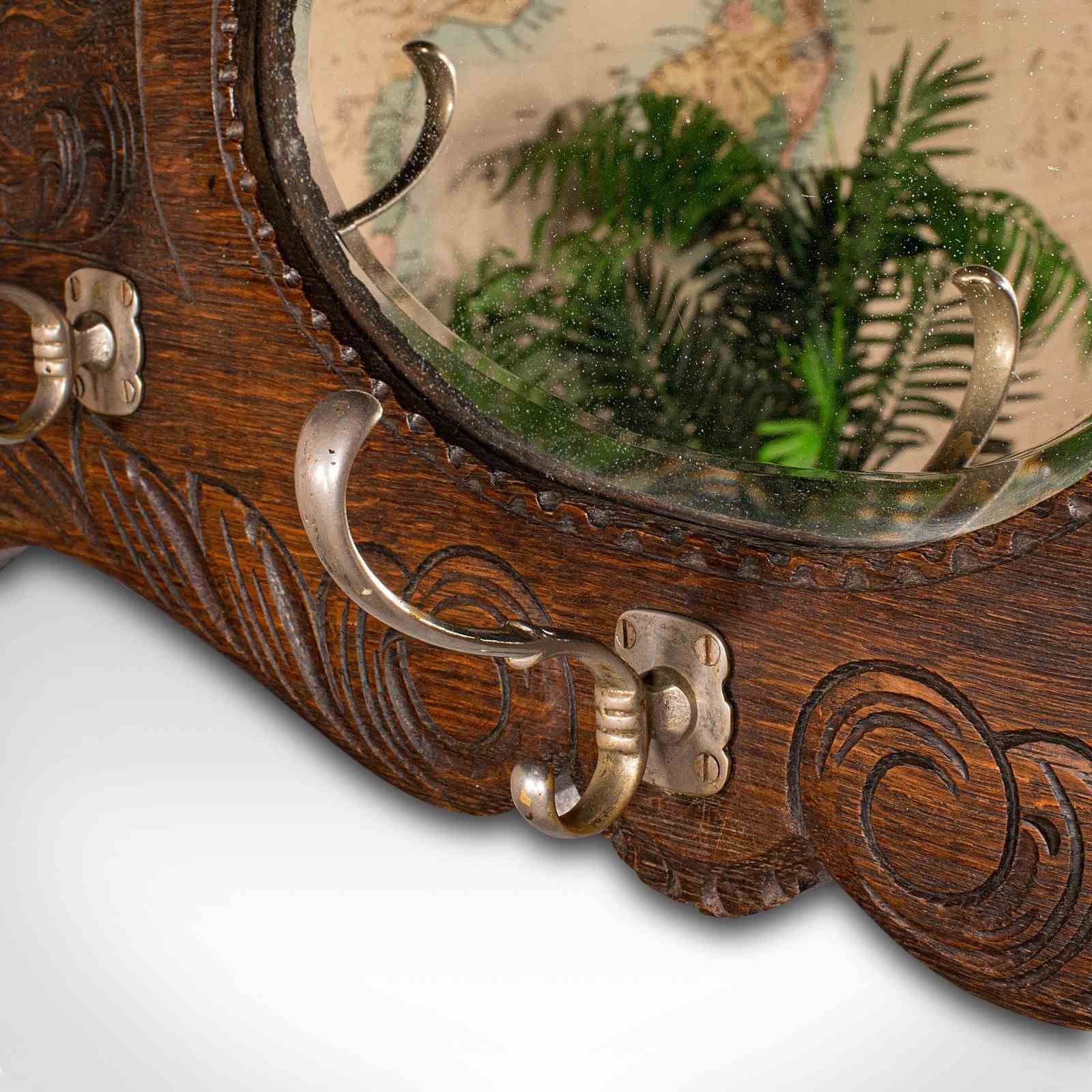 Antique Hall Rack With Valet Mirror, English, Oak, Mounted Coat Hooks, Victorian