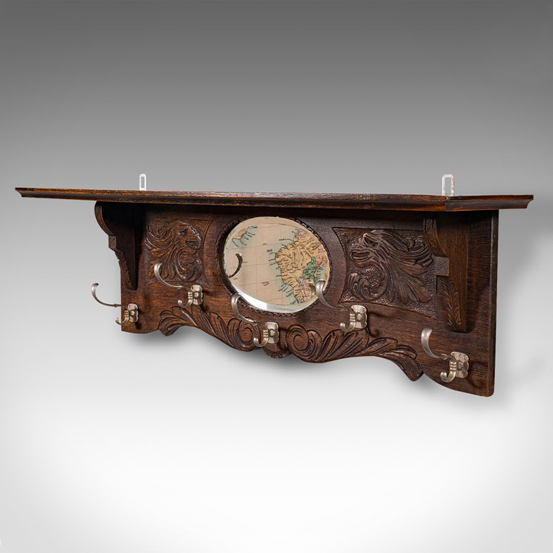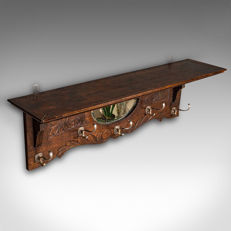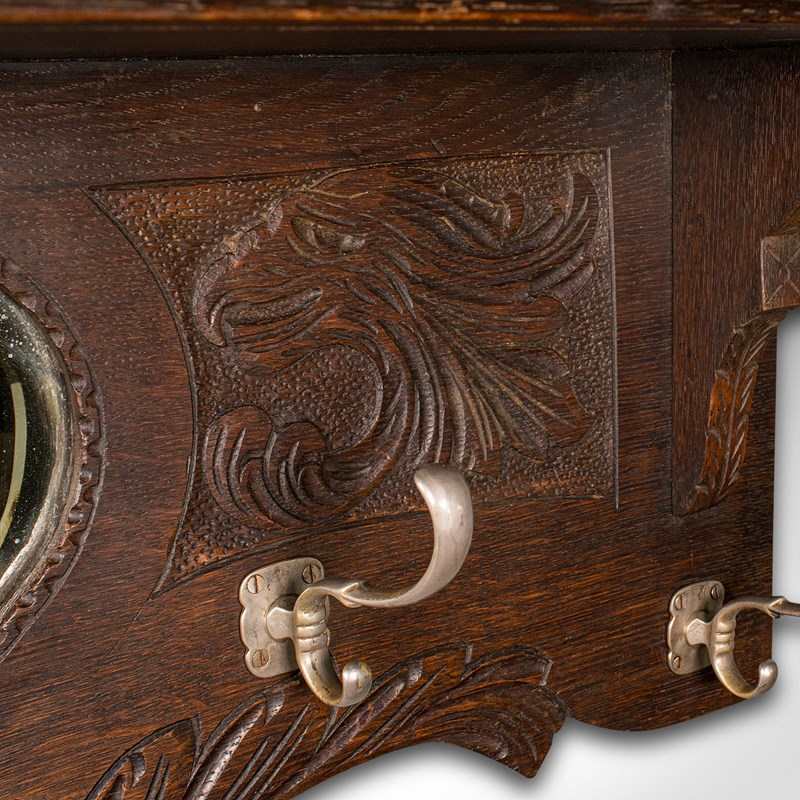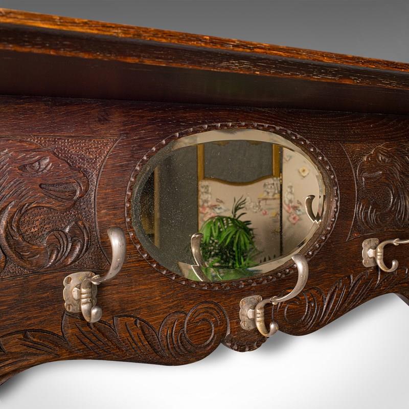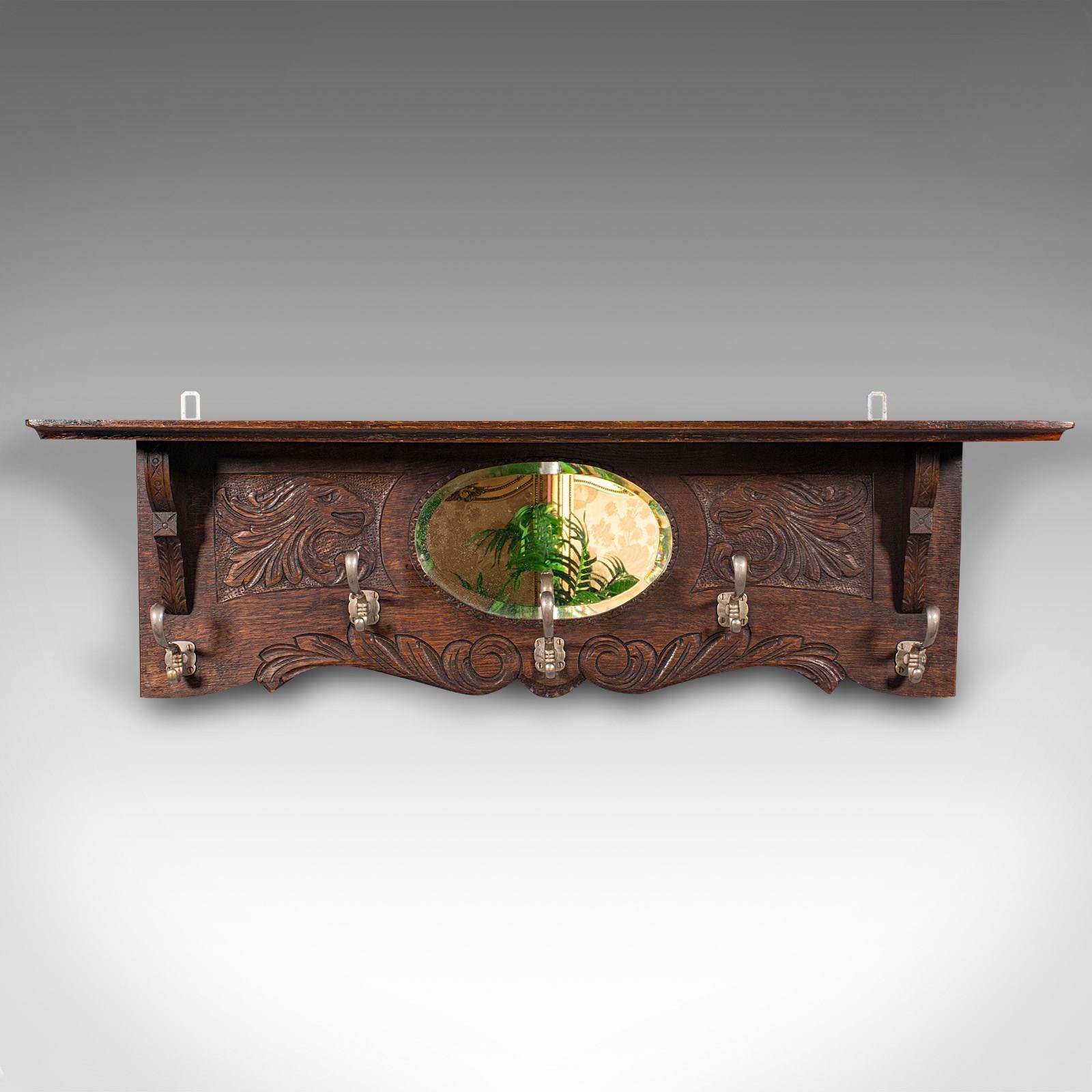 Antique Hall Rack With Valet Mirror, English, Oak, Mounted Coat Hooks, Victorian