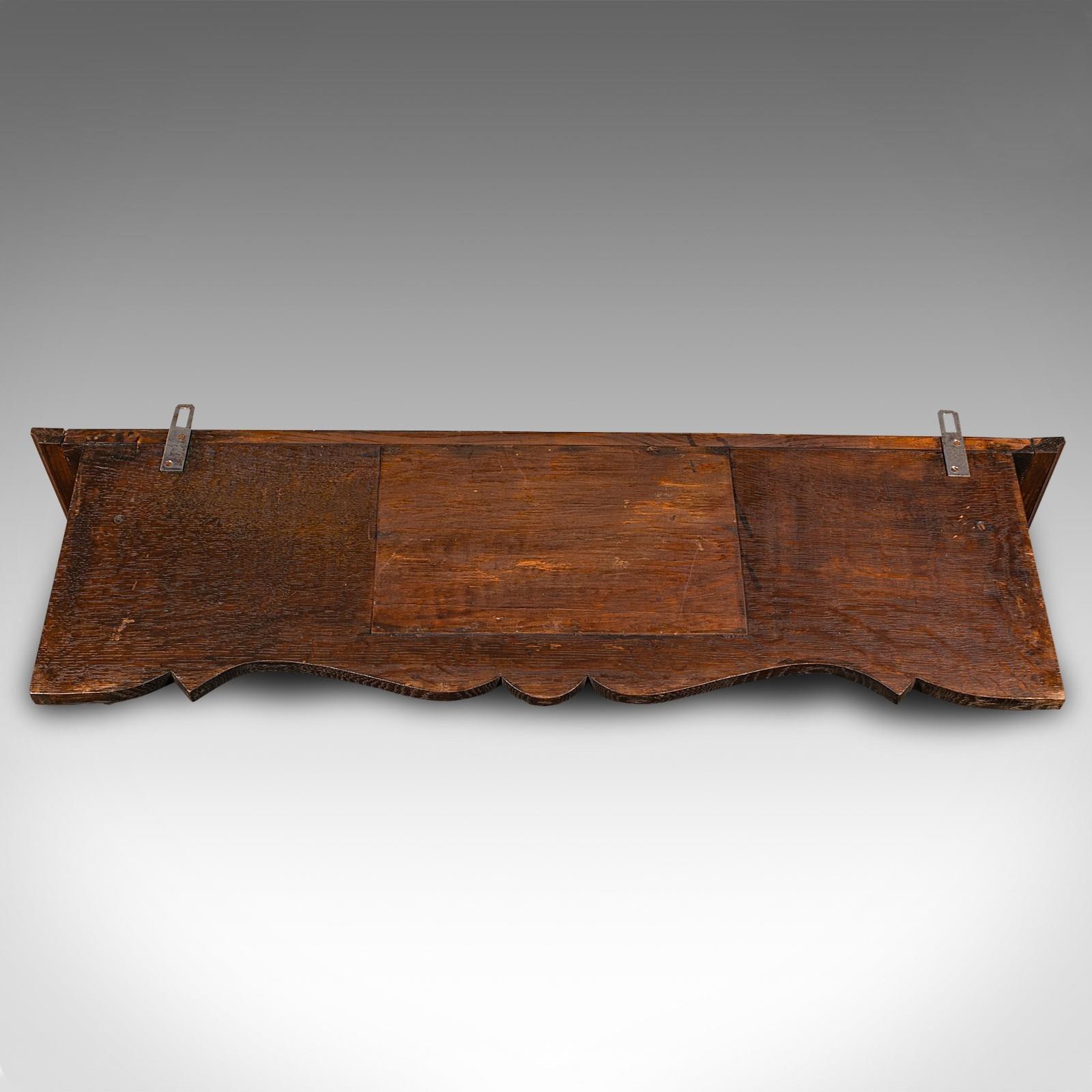 This is an antique hall rack with valet mirror. An English, carved oak mounted coat hooks, dating to the late Victorian period, circa 1890.