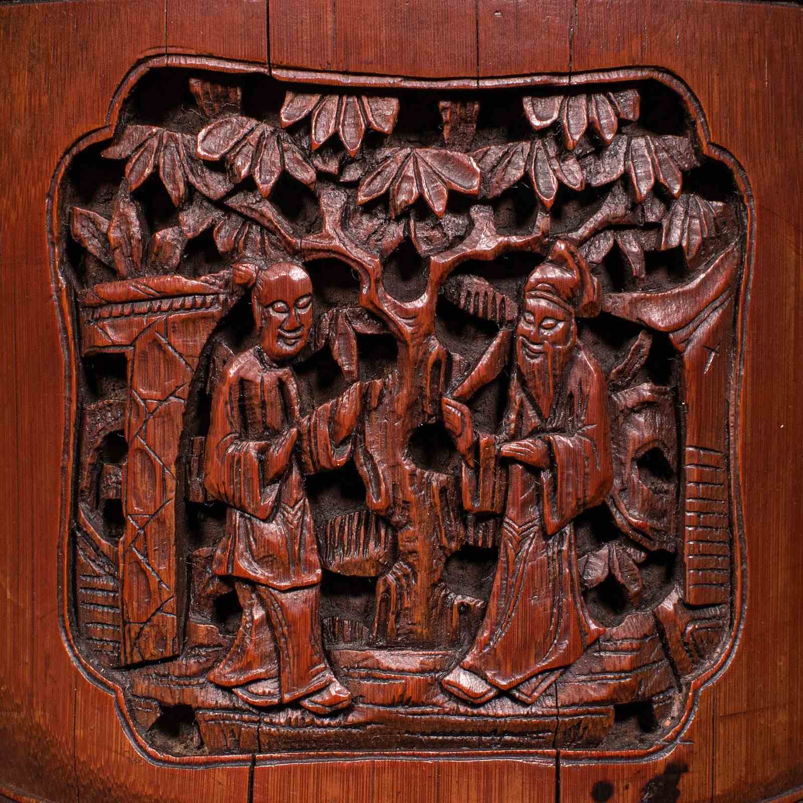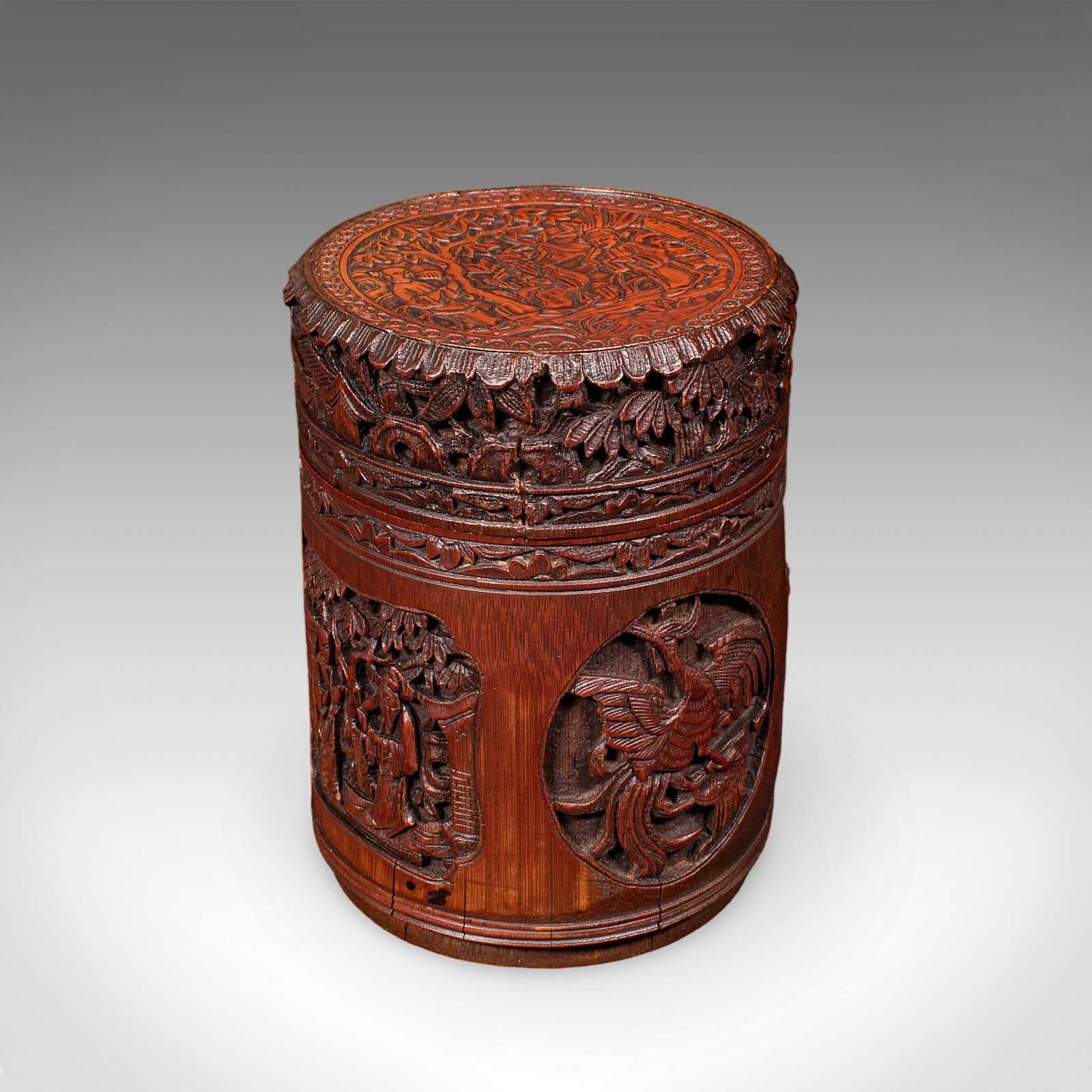 This is an antique handmade spice pot. An Oriental, carved bamboo treen, dating to the early Art Deco, circa 1925.