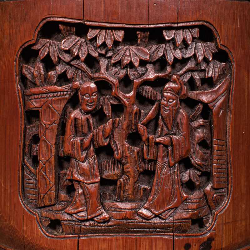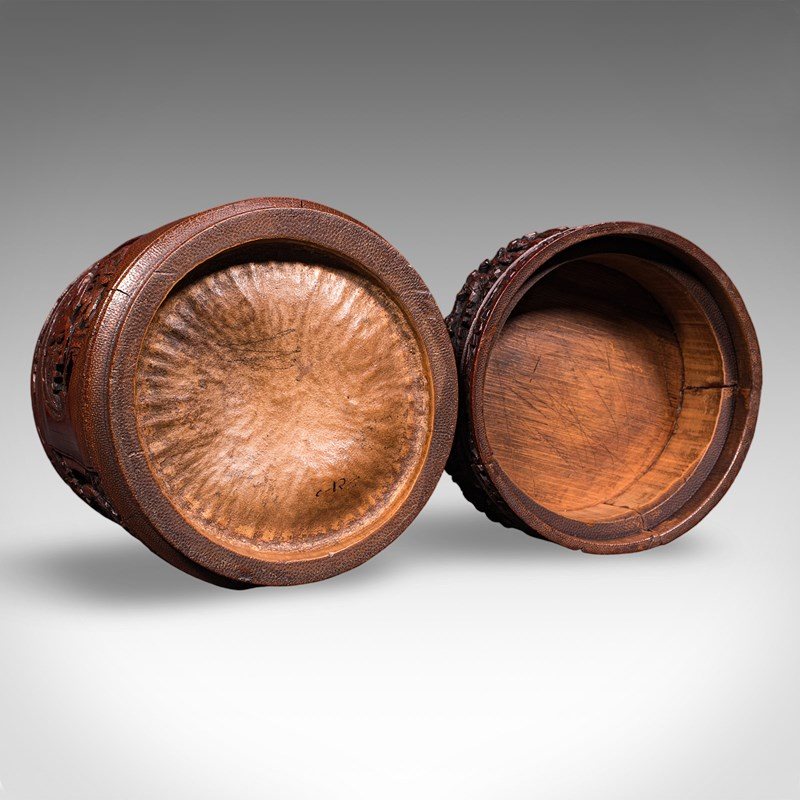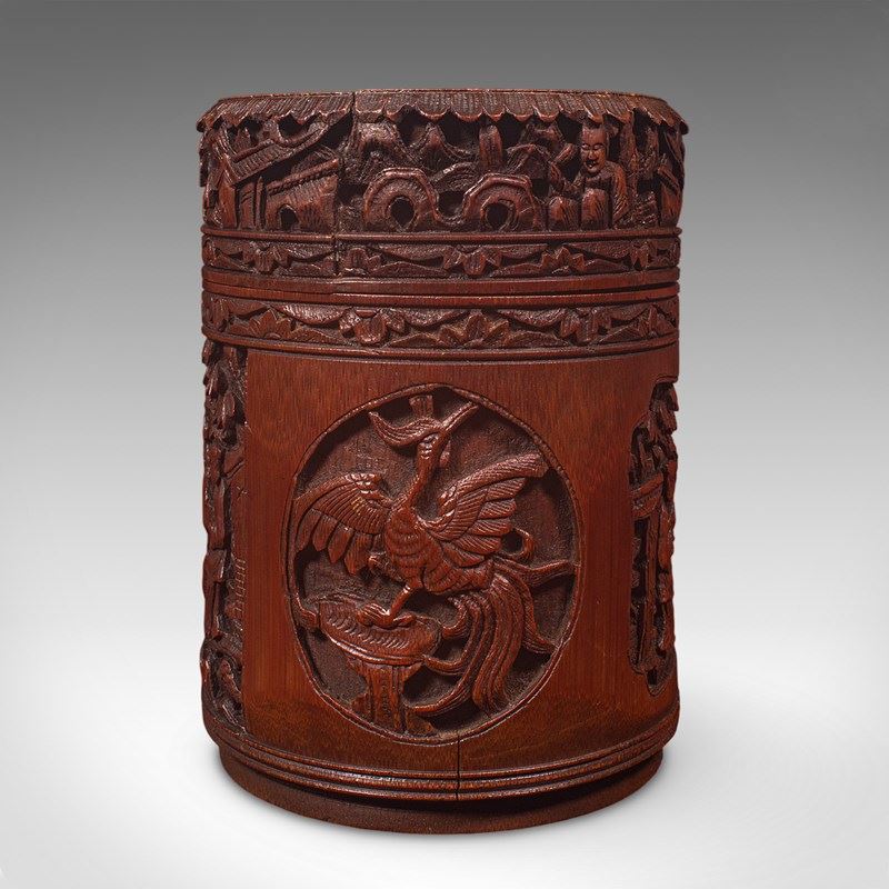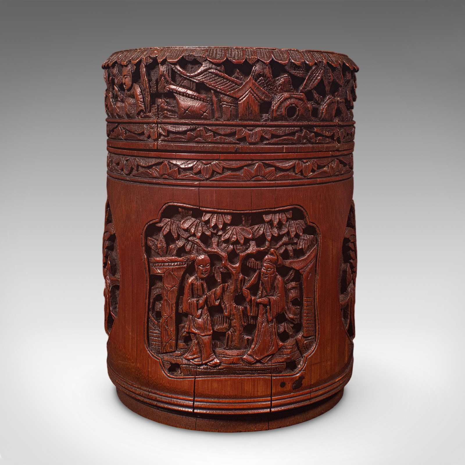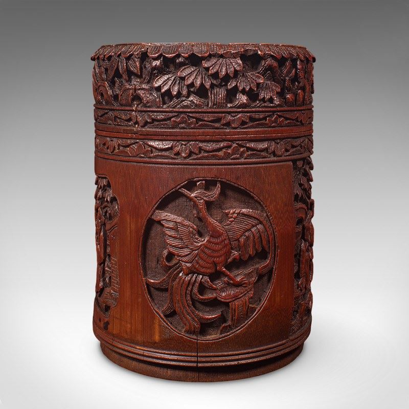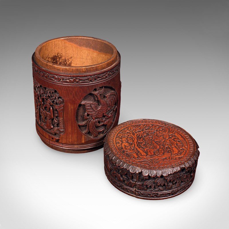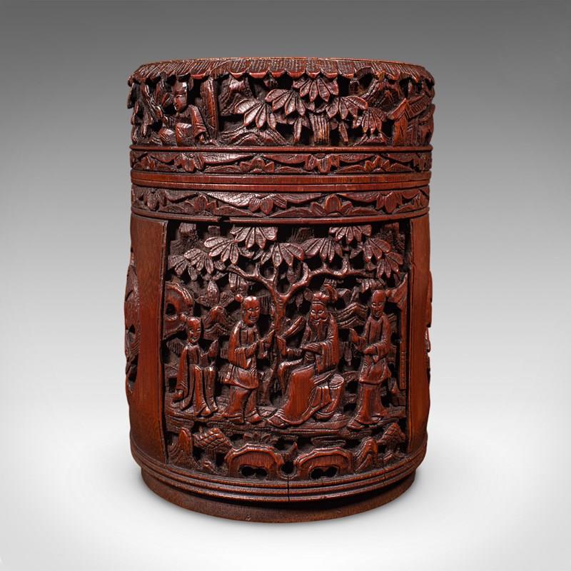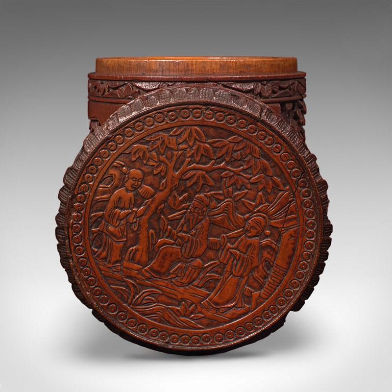 This is a charming antique handmade spice pot, with strong Oriental iconography skilfully carved into a stout piece of bamboo. Delivered ready for the home.
