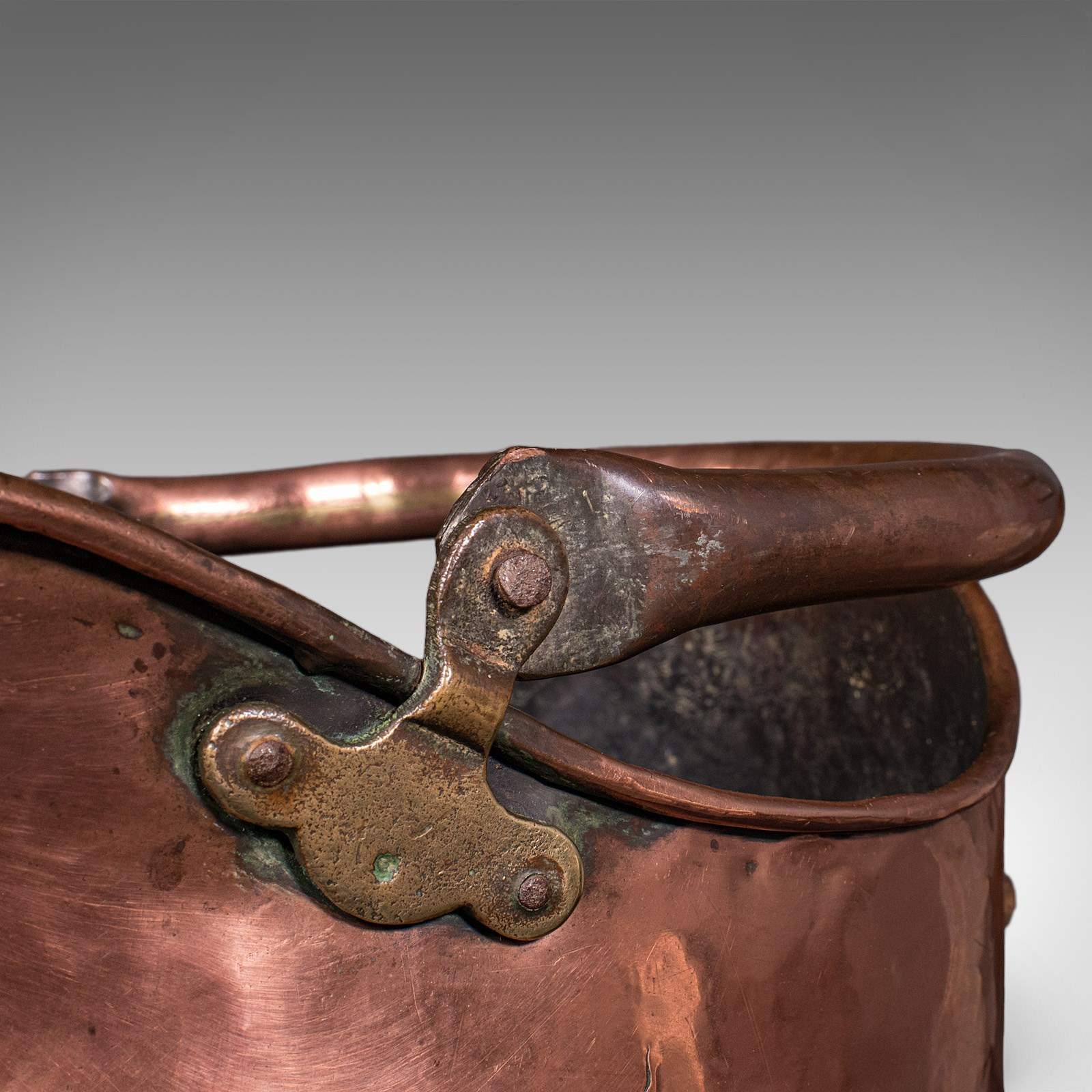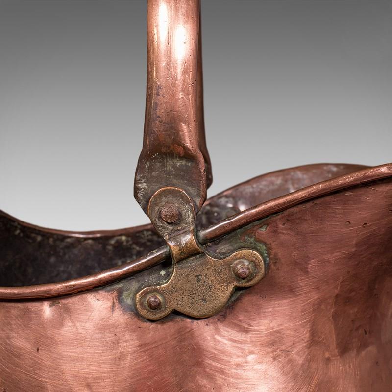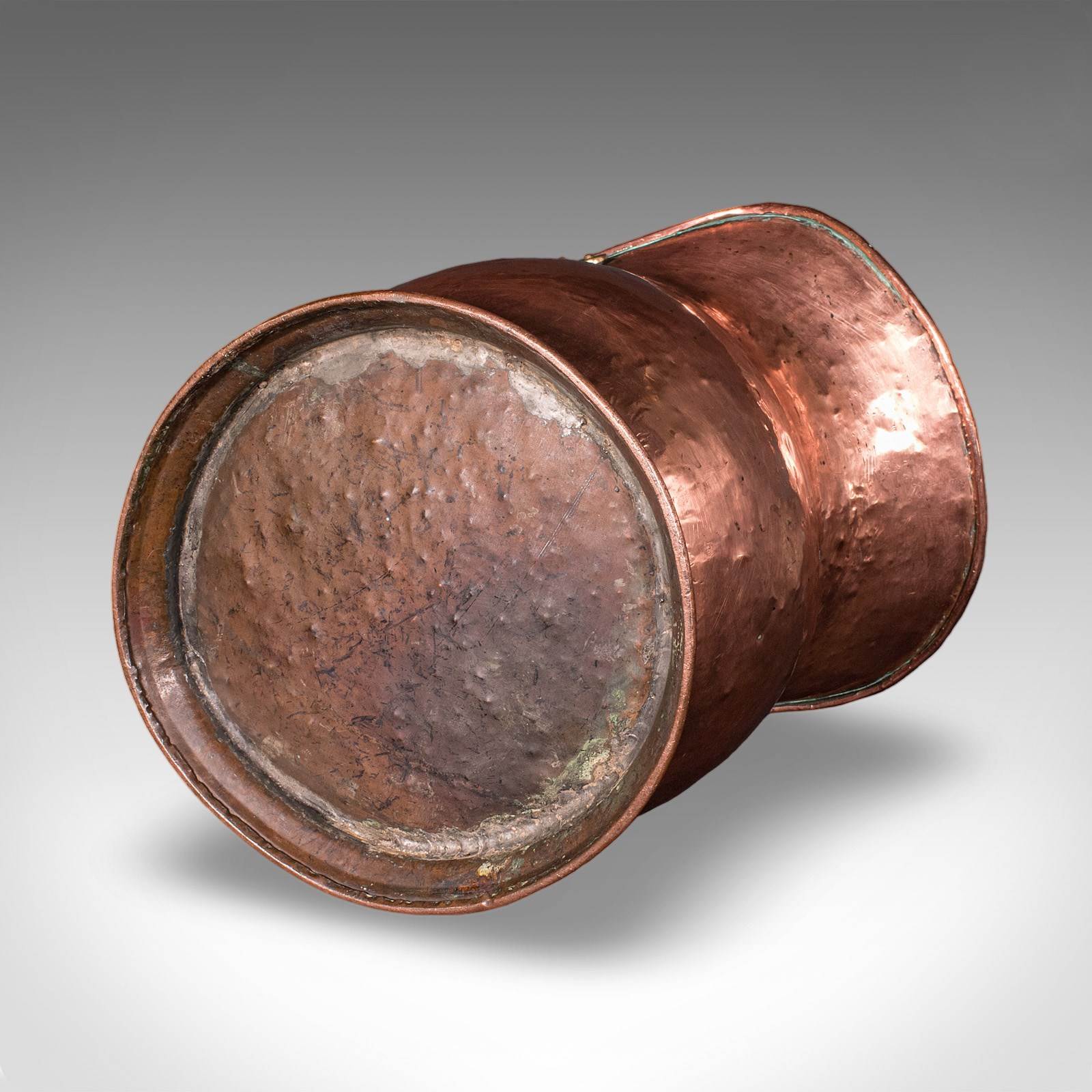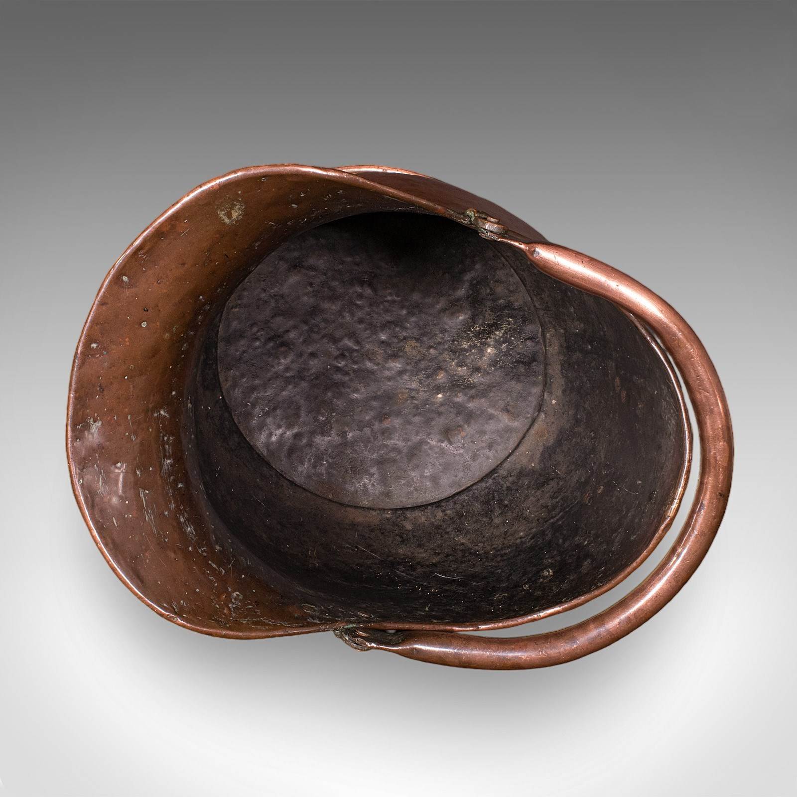 This is an antique helmet coal scuttle. An English, copper fireside store or fuel keeper, dating to the early Victorian period, circa 1850.