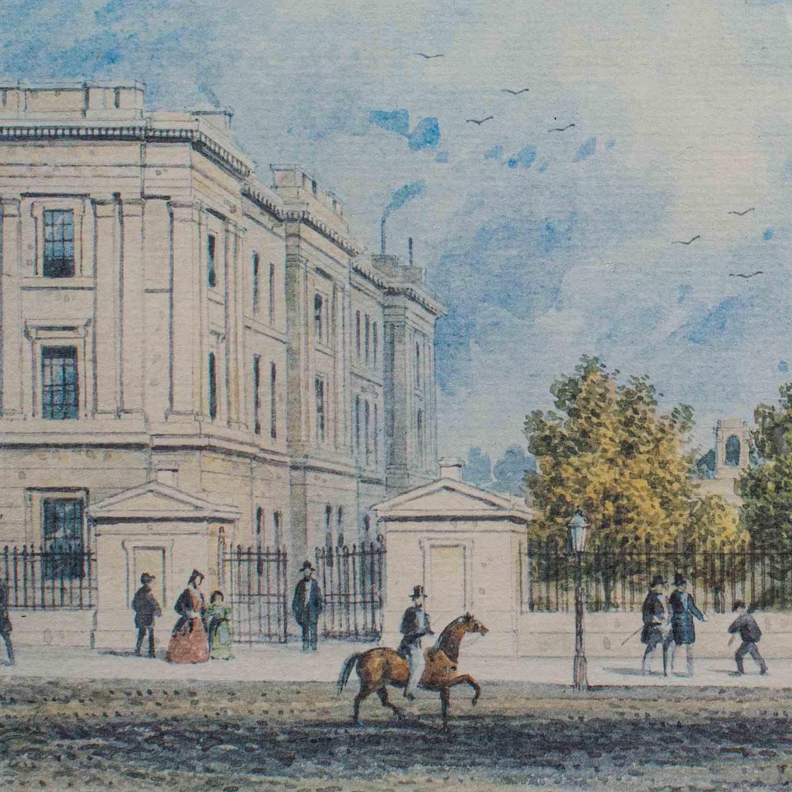 Scene originally drawn and engraved circa 1858, showing the new front of the hospital